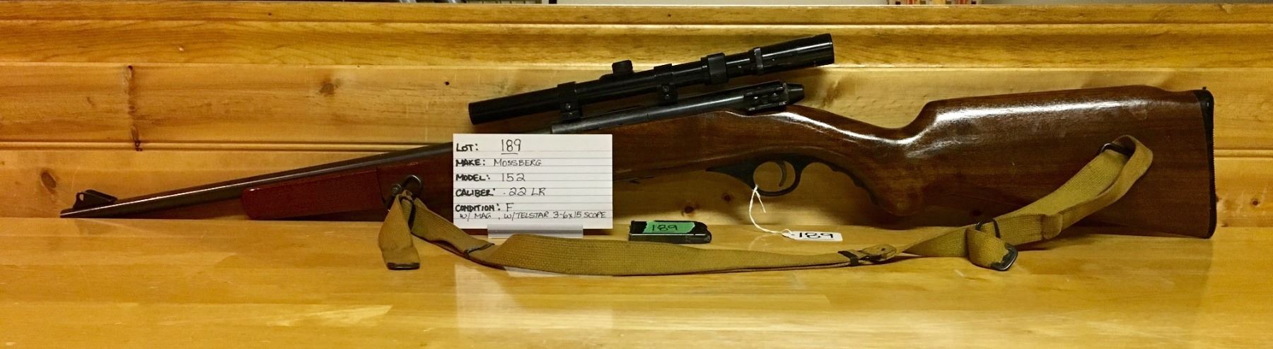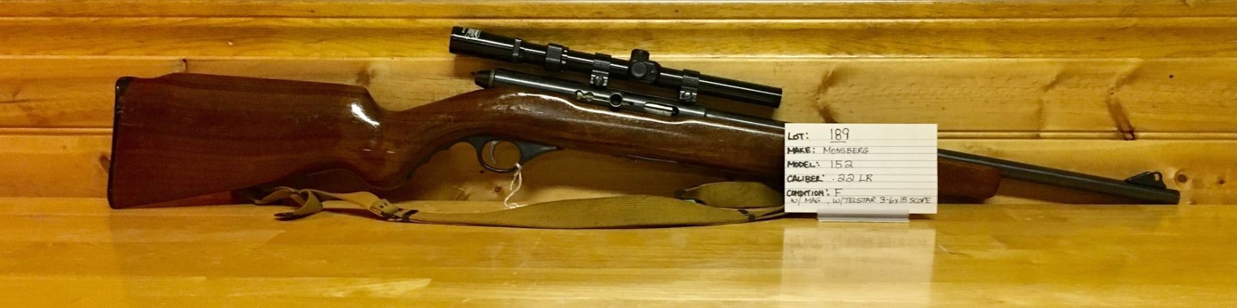LOT:  189 MAKE:  MOSSBERG MODEL:  152 CALIBER:  .22 LR CONDITION:  F EXTRAS:  W/ MAG, W/ TELSTAR, 3-6X15 SCOPE S/N:  NONE
