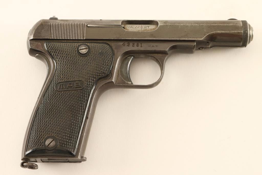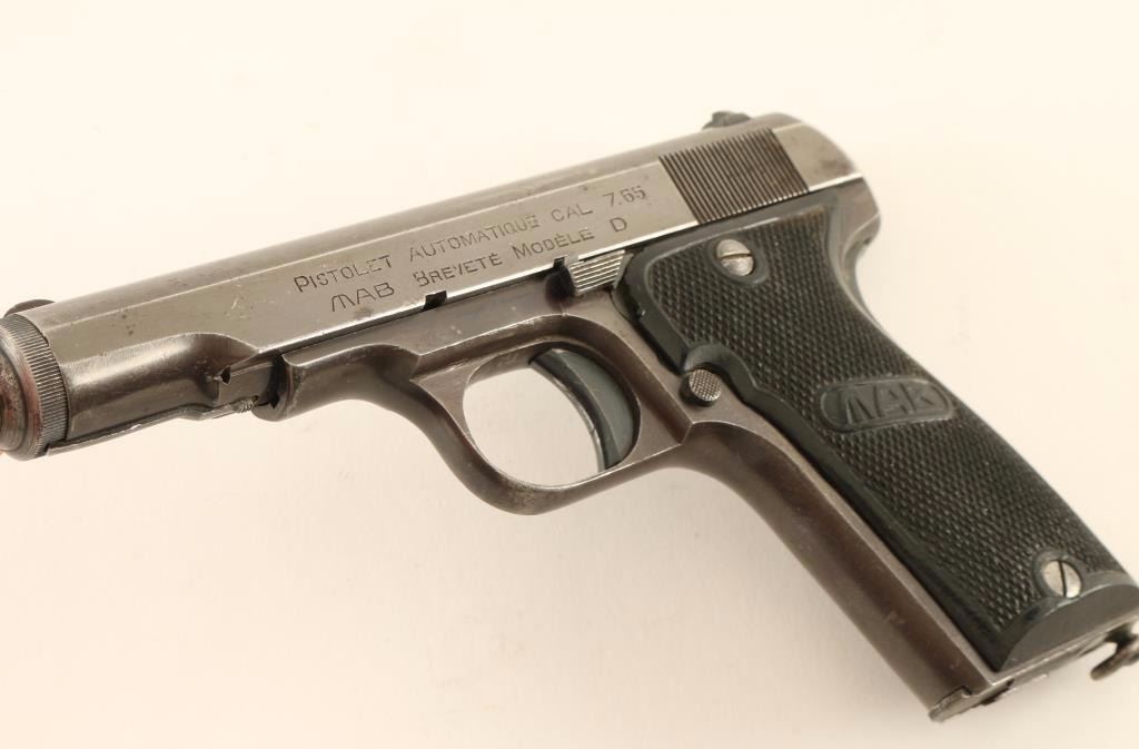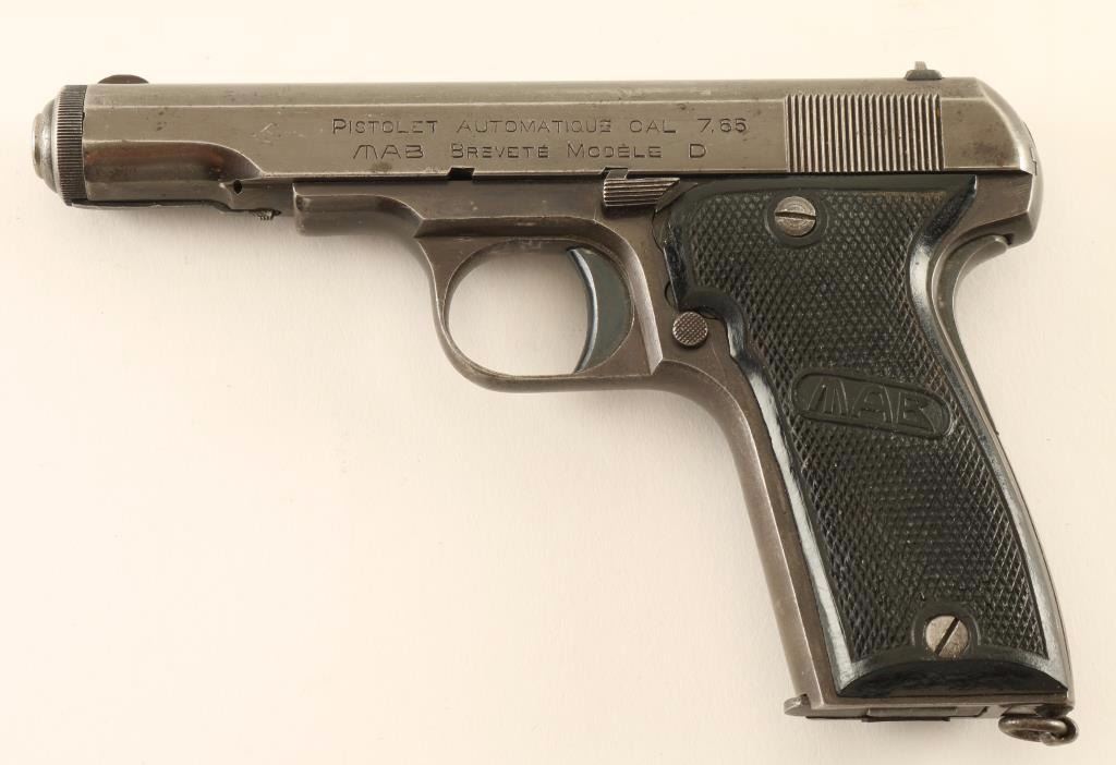 French made semi-automatic pistol built along the lines of the FN 1910, and chambered in 7.65mm. Features a blued refinish, 4.2" barrel, low-profile round blade front sight, dovetailed rear window sight, steel frame, smooth trigger, thumb safety/slide stop, grip safety, 8 round magazine, lanyard ring and two-piece MAB checkered black plastic grips. No import marks observed. Markings: Slide - "PISTOLET AUTOMATIQUE CAL 7.65/MAB BREVETE MODELE D". Frame - "MAB". Barrel - "MAB", "Cal 7.65" & "PT". Pistol retains approximately 25% of it's thinned blued refinish showing holster wear, numerous handling marks and the remainder of the metal surfaces turning to a brown patina. Action is smooth, bore is very good and plastic grips are good+. Condition is near good. ***C&R Firearm*** ***Modern Firearm***