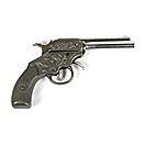 Magic Blank Single Shot Pistol About .22 caliber, 4" round nickel plated barrel, no S/N. Cast iron frame embossed with grape vine motif and checkered grips, marked "MAGIC" with patent date. Retains very small traces of black painted finish. Goodcondition. Some edge wear on the barrel, frame aged to gray. Est:$100-300