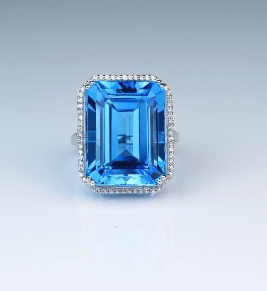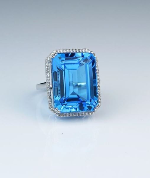 Ring weighing approx. 30.00 carats framed by over 70 round diamonds weighing approx. 0.50 carats with F-G colors and VS/SI clarity set in 14K white gold.