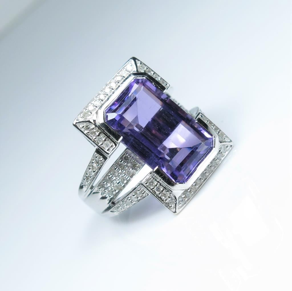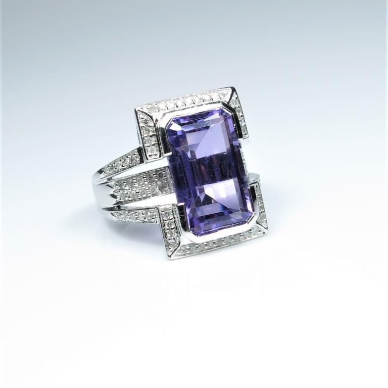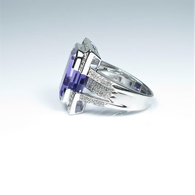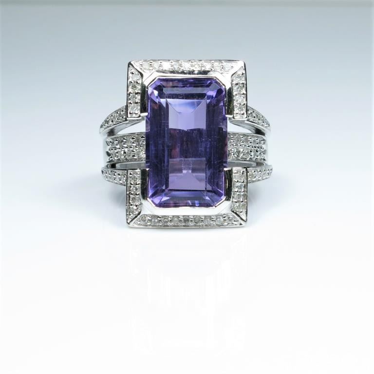 Ring featuring AAA Bolivian Amethyst with emerald cut VS clarity weighing approx. 10.00-12.00 carats and fine set with 74 round Diamonds weighing approx. 0.75 carats with H-I colors set in a 14 karat intricately designed white gold setting. Retail $4,000-$5,000