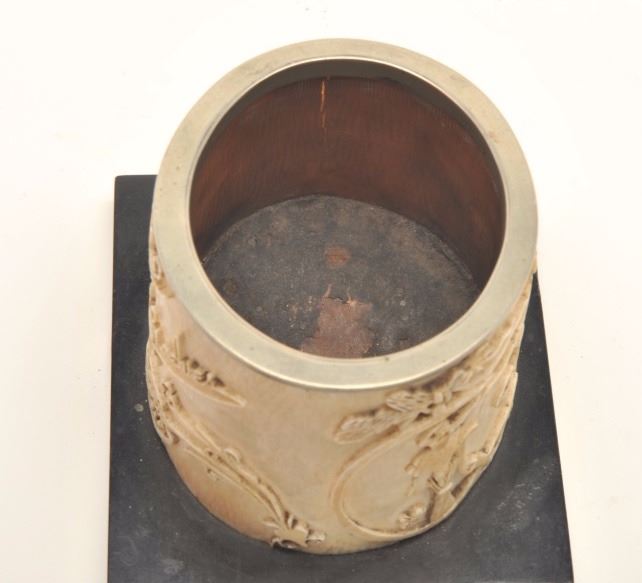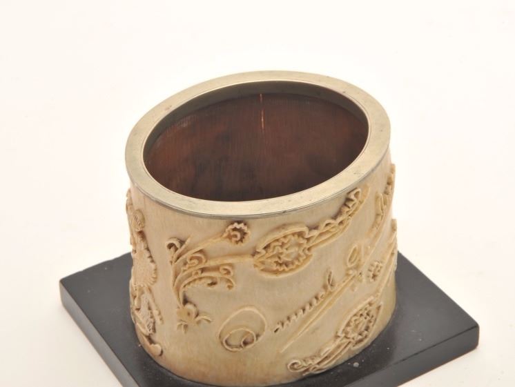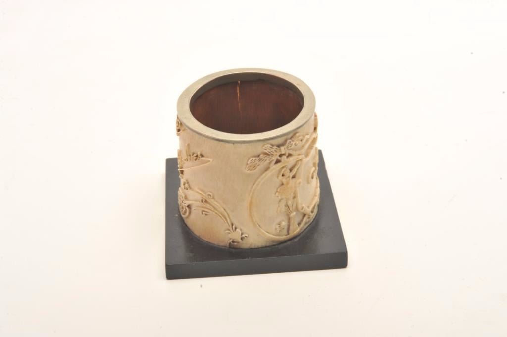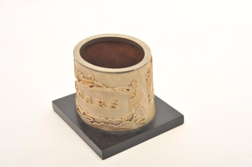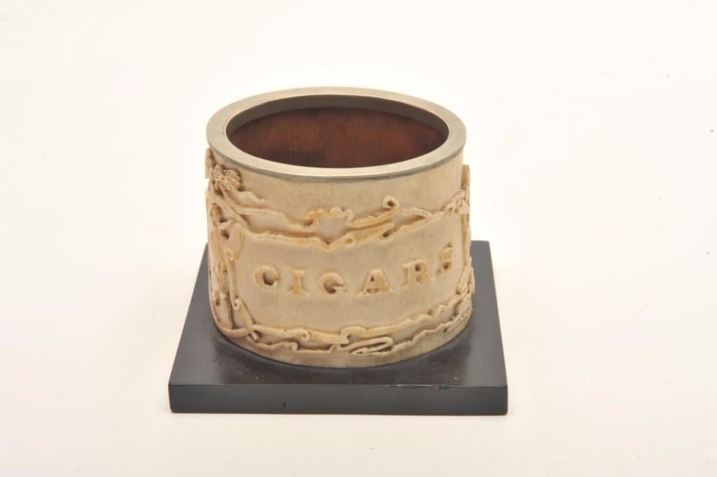 Magnificently carved mid-19th century cigar holder showing scenes of ballerina and black girl dancing with ornate raised scrolls surrounding, “Cigars” with name Samuel G. Ives on the reverse who was a judge andpolitician from Michigan said to have known Abe Lincoln. 3” in height by 3 ¾” across center not including base. A superb smoking antiquity. Est.: $600-$1200