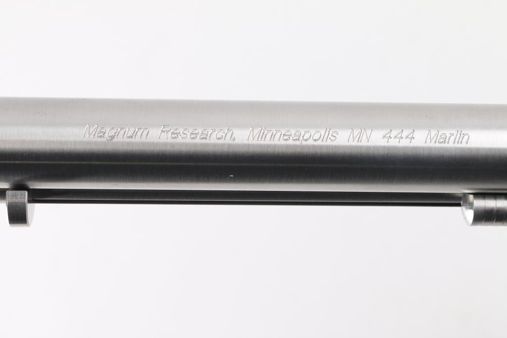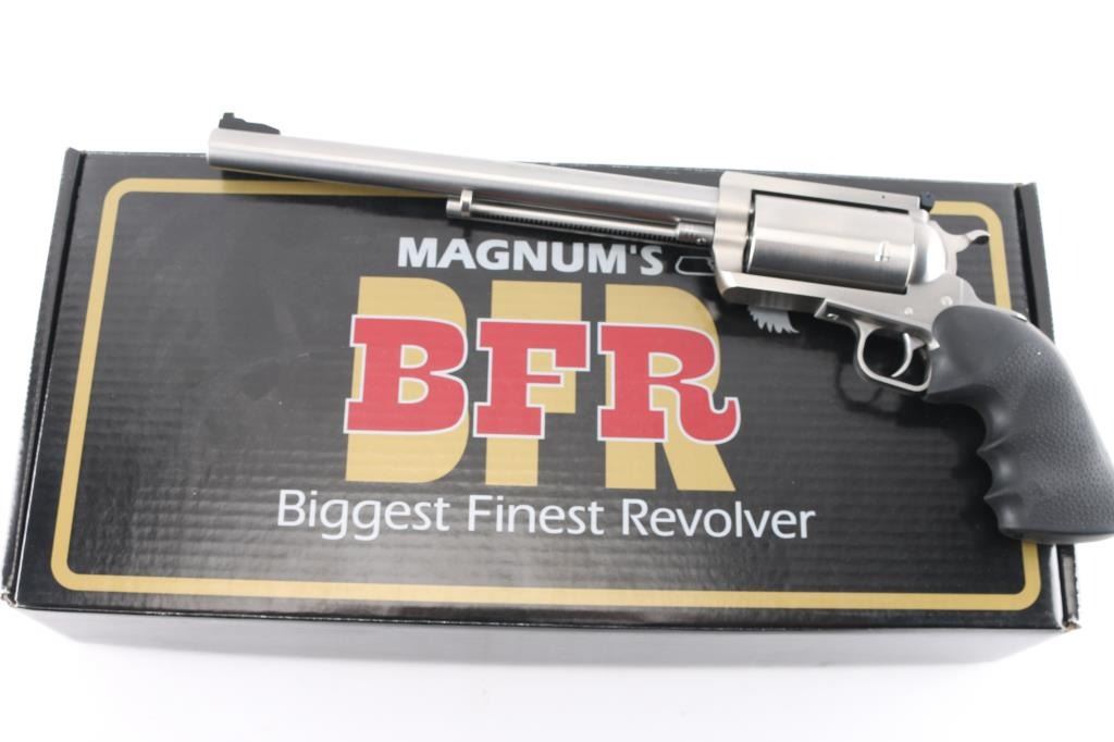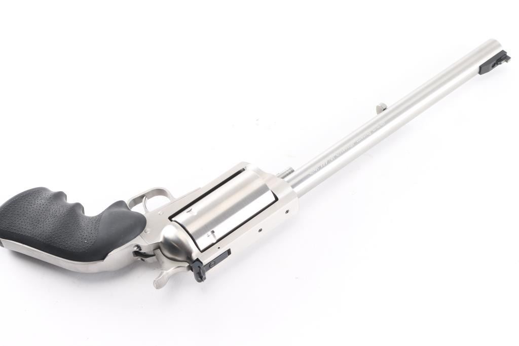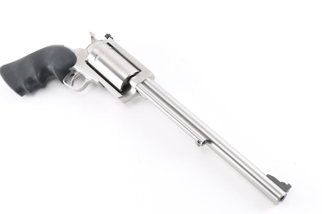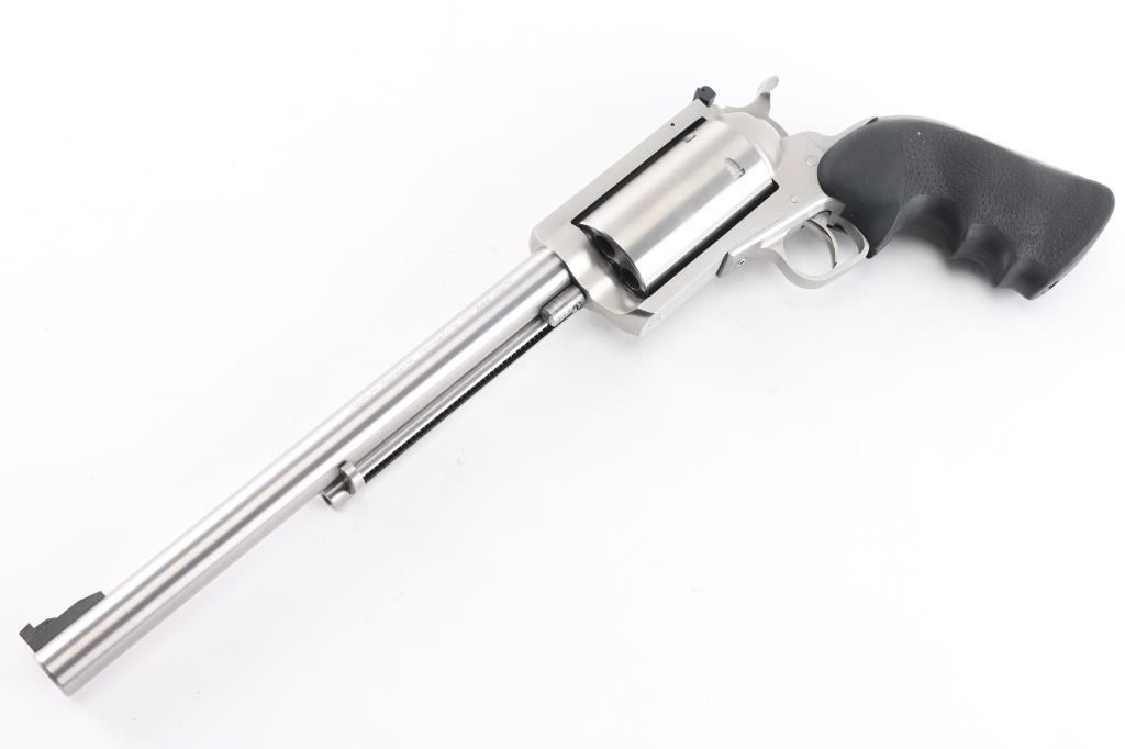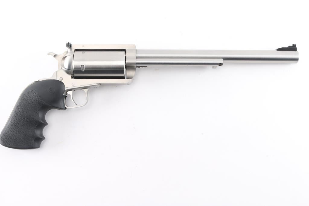 Biggest Finest Revolver Extra-large frame stainless steel single action revolver chambered in .444 Marlin. Features a satin stainless finish, 10 1/2" barrel, raised ramp front sight, micro-adjustable rear, smooth trigger, serrated wide hammer spur, unfluted five-shot cylinder, ejector rod, and one-piece pebbled rubber finger groove grip. Includes the original factory cardboard box with documents. lock and test firing shell. Revolver exhibits only light handling marks and a thin drag line on the cylinder. Action is smooth with very good lock-up, the bore is pristine and the rubber grip is fine. Like new condition.NRA Condition-Excellent. Modern firearm.