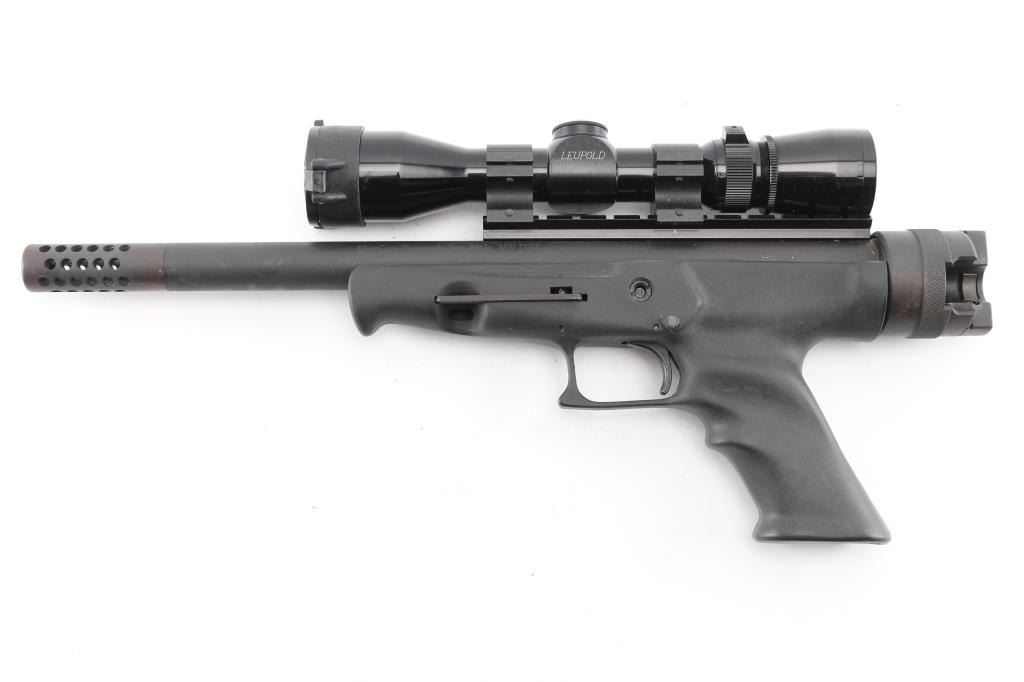 SN: A01358 Single shot silhouette/hunting pistol chambered in 300 Winchester Magnum. Features matte black finish, black polymer grip assembly, 14" barrel, muzzle break, side charging lever, cocking indicator, cross bolt safety, rotating breech block at rear. Mounts a Weaver rail with Leupold VARI-X 2.5-8x EER pistol scope with duplex reticle. Bore is very good bright condition. Retains 95% finish with handling marks. Polymer is very good. Condition is near NRA Excellent *** Modern Firearm ***