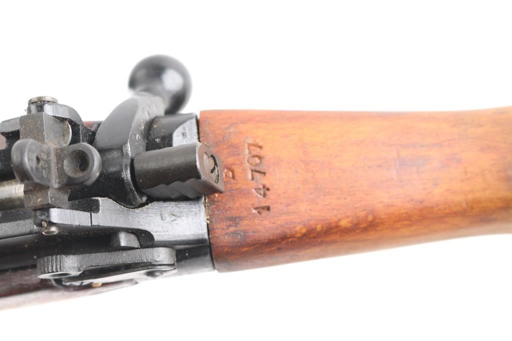 Arsenal refurbished WW2 British military bolt action rifle, imported by IAC, very small, & feint on theleft triggerguard, Left receiver rail marked "R.O.F.M. No. 4 MK I 1941". Features black parkerized arsenal refinish, wood stock and handguards, 25" barrel, bayonet lug, blade front sight with protector ears, receiver mounted flip peep rear sight, sling swivels, 10 round detachable magazine, stripper clip bridge, manual safety, trap door in brass butt. Bore is bright, strong rifling, some very light, scattered areas of pitting. Retains 98% finish Wood is very good overall. Matching serial number on left butt socket, magazine, butt stock, and forearm. ROF Maltby was a Royal Ordnance Factory rifle manufacturing plant, Comes with correct No. 4 Mk II spike bayonet, painted in gloss black.
