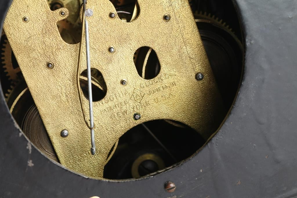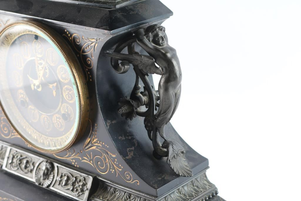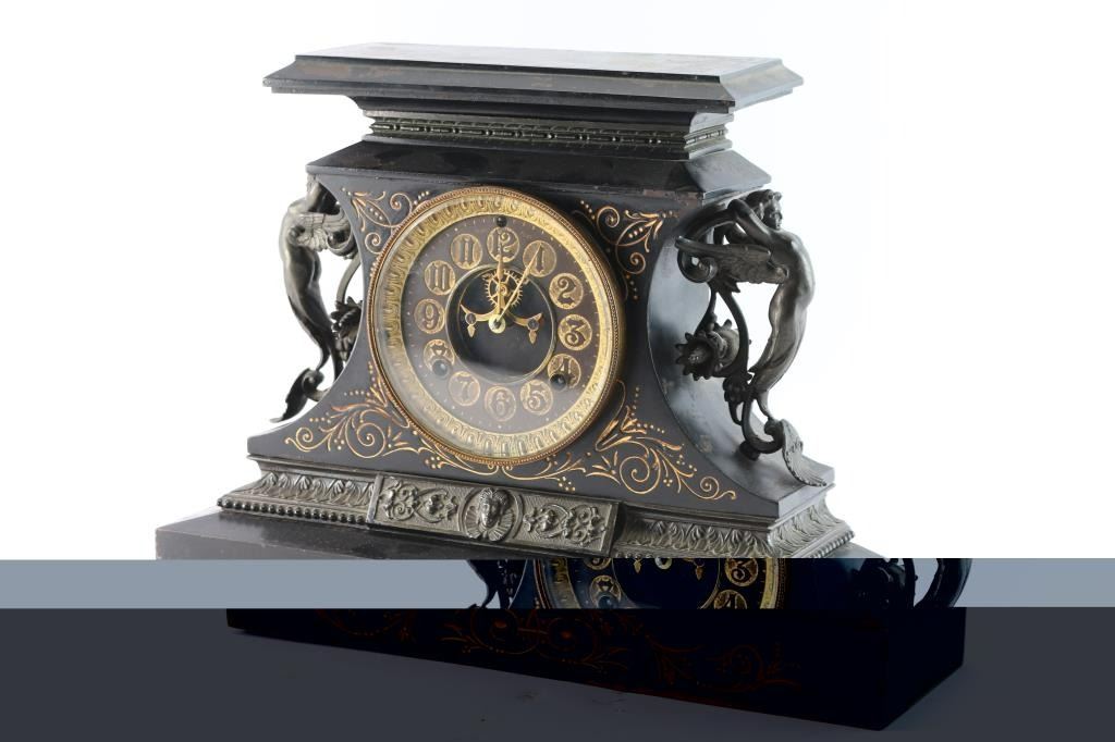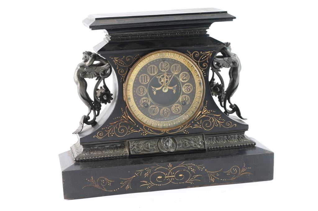 Ansonia mantel clock with cherub figures on each side. With pendulum, no key. 4.5" dial. Overall measurement: 15.25"W x 12.5"H. ***Buyer Must Arrange Shipping***