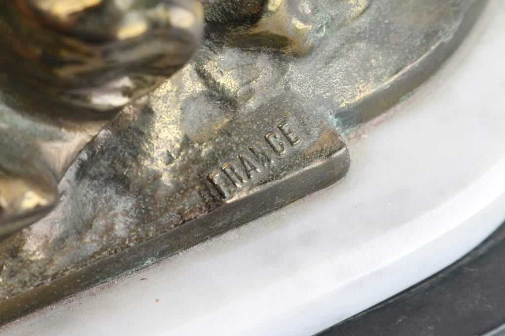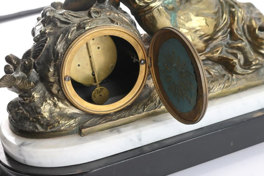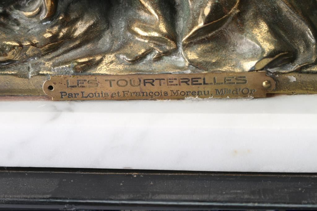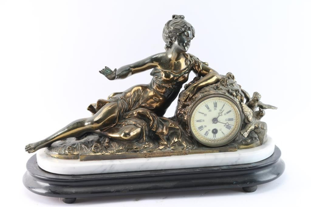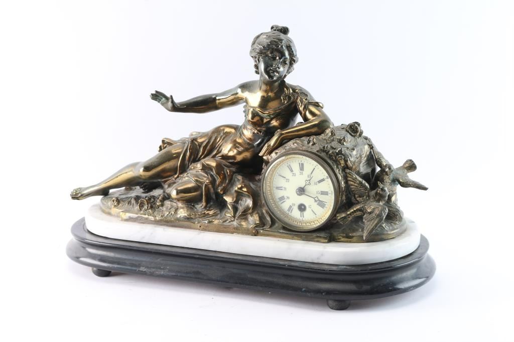 Louis and Francois Moreau French mantel clock with woman lying down and doves. Titled "Les Tourterelles". Made of spelter on a marble base with wooden stand. 3" dial. Overall measurement: 18"W x 10.5"H. ***Buyer Must Arrange Shipping***