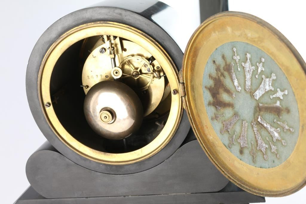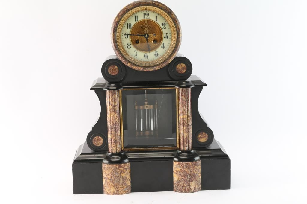 Antique French mantel clock made of marble and slate with mercury pendulum. 4.5" dial. Overall measurement: 15"W x 18.25"H. ***Buyer Must Arrange Shipping***
