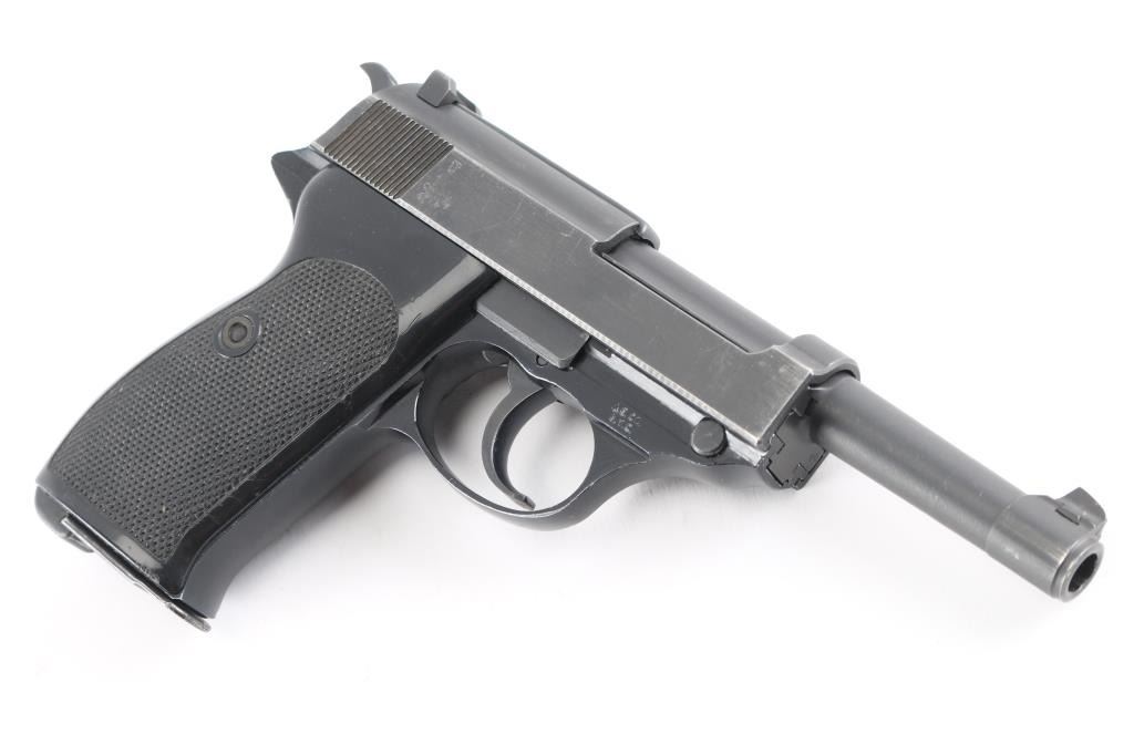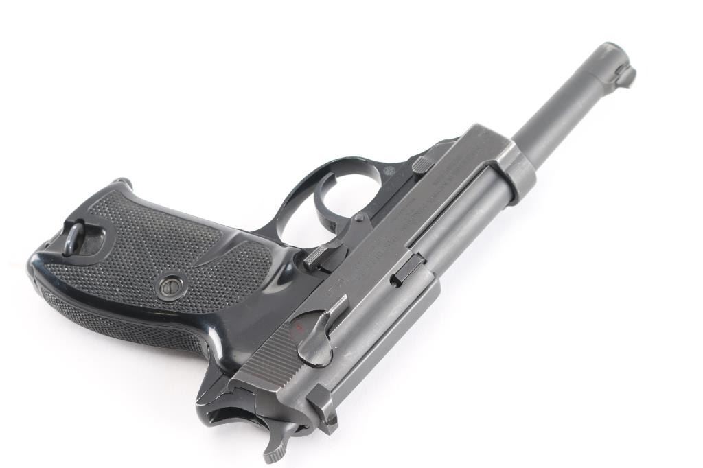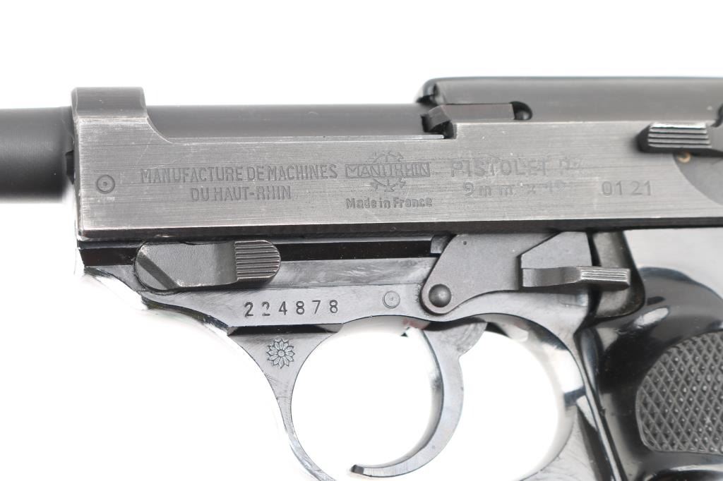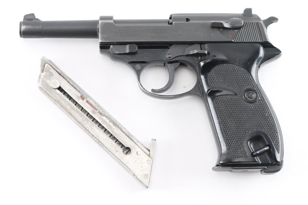 West Berlin Police proofed military semi-automatic pistol chambered for the 9x19mm Luger cartridge. Circa 1964. (The Berlin Police History Collection includes serial 239725 which is stated as entering service in March of 1964). Made in France and imported by A.E. Co. NYC. Features fixed sights, slide mounted decocker/safety, heel magazine release, double/single action trigger. Bore is excellent/bright, sharp rifling, slide/barrel are a gray parkerized finish with minor edge wear scratches. Aluminum alloy frame is finished a gloss black, very good. Black plastic grips are in good shape with minor scratches. The slide and barrel are mismatched from the frame. The French proof mark of crossed cannons with a "3" below the St. Etienne proof, on the right slide, indicates that the firearm was originally intended for a canceled Portuguese contract. West Berlin Police rosette/flower property marking on the trigger guard. Comes with one blue magazine "P1 9mm" with Walther banner.. Condition is NRA Near Very Good. C&R Firearm.