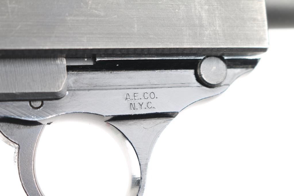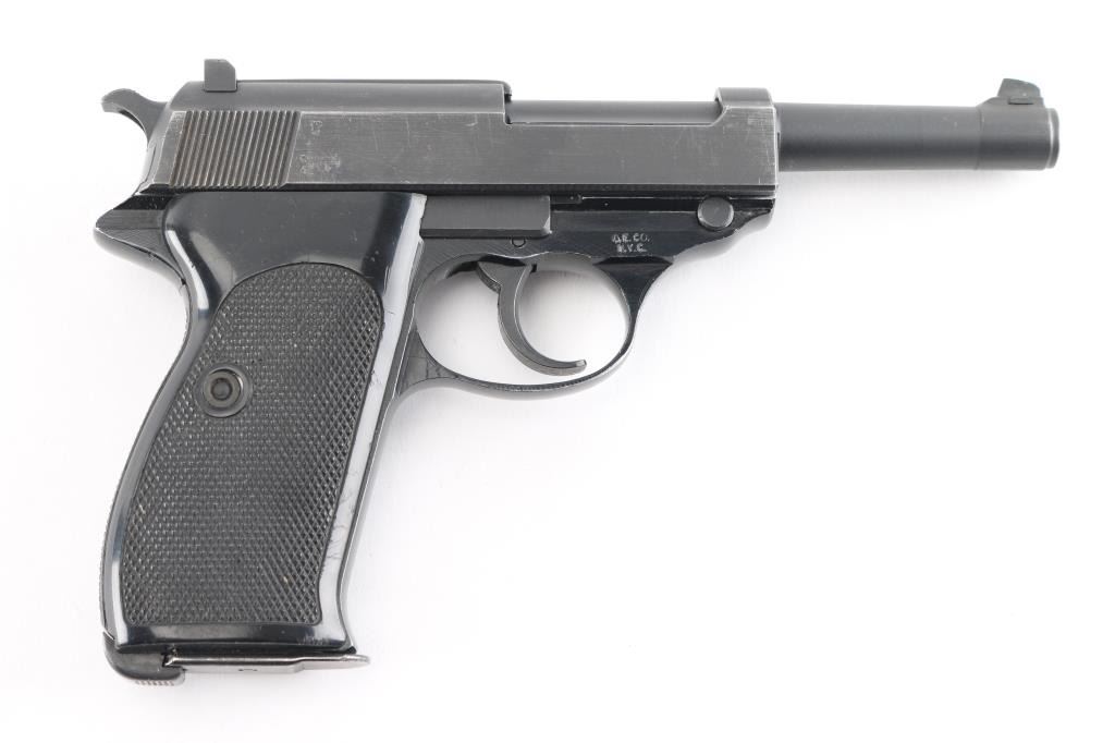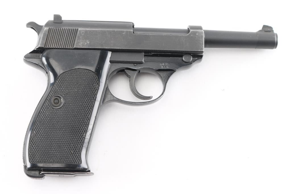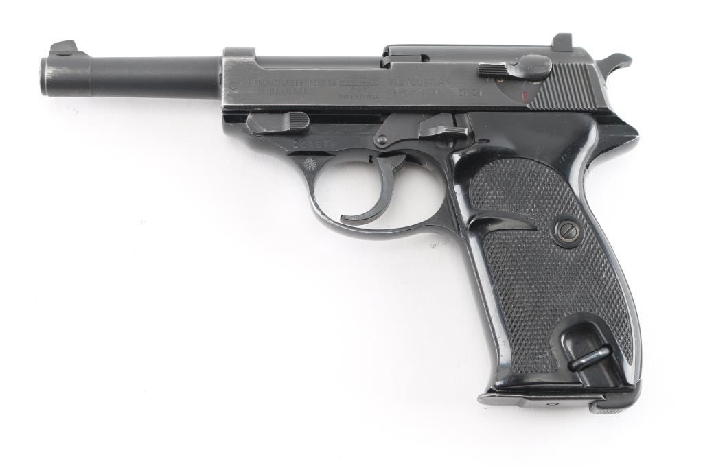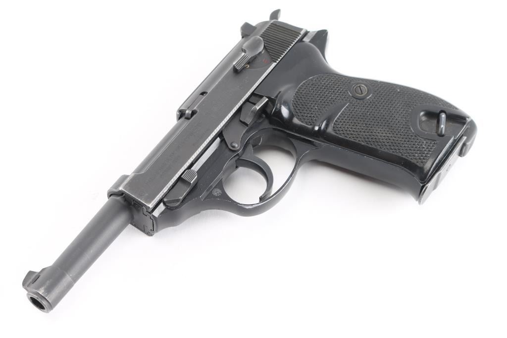 West Berlin Police proofed military semi-automatic pistol chambered for the 9x19mm Luger cartridge. Circa 1964. (The Berlin Police History Collection includes serial 239725 which is stated as entering service in March of 1964). Made in France and imported by A.E. Co. NYC. Features fixed sights, slide mounted decocker/safety, heel magazine release, double/single action trigger. Bore is excellent/bright, sharp rifling, slide/barrel are a gray parkerized finish with minor edge wear scratches. Aluminum alloy frame is finished a gloss black, very good. Black plastic grips are in good shape with minor scratches. The slide and barrel are mismatched from the frame. The French proof mark of crossed cannons with a "3" below the St. Etienne proof, on the right slide, indicates that the firearm was originally intended for a canceled Portuguese contract. West Berlin Police rosette/flower property marking on the trigger guard. Comes with one blue magazine "P1 9mm" with Walther banner.. Condition is NRA Near Very Good. C&R Firearm.