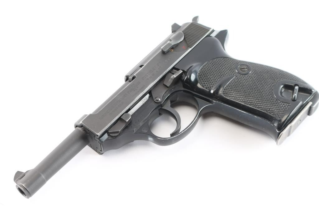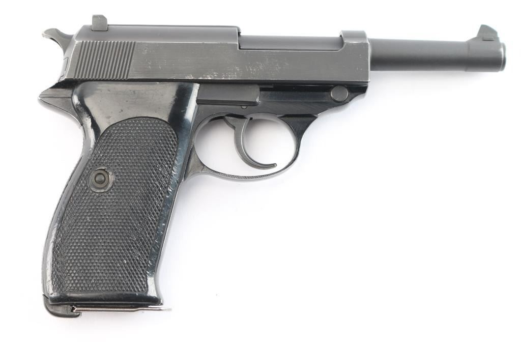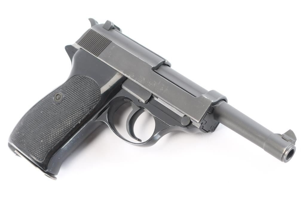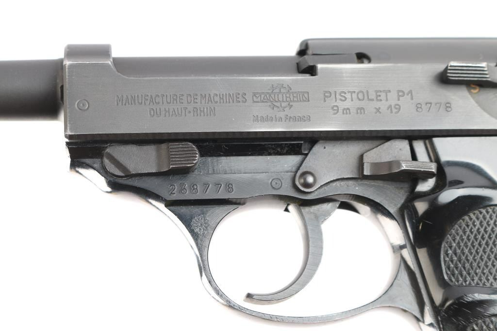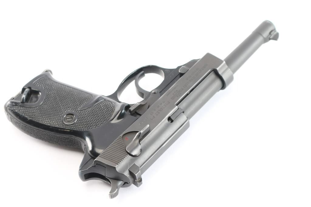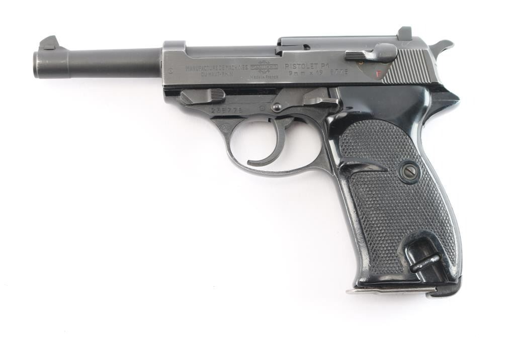 West Berlin Police proofed military semi-automatic pistol chambered for the 9x19mm Luger cartridge, Made in France and imported by IA Co.. Features fixed sights, slide mounted decocker/safety, heel magazine release, double/single action trigger, alloy frame. Flower proof on left triggerguard. The right side of the slide has two proof marks, Ccrown over crossed cannons with a “3” at the top, indicating the slide was originally made for a canceled Portuguese contract Bore is very good with sharp rifling. Steel parts are blued a matte black that is even with bare metal beginning to show at edges of slide and around the muzzle. Aluminum alloy frame is finished a gloss black. Black plastic grips are in very good shape. Serial number matched on frame, barrel and slide. Magazine marked with Walther banner and "P38".