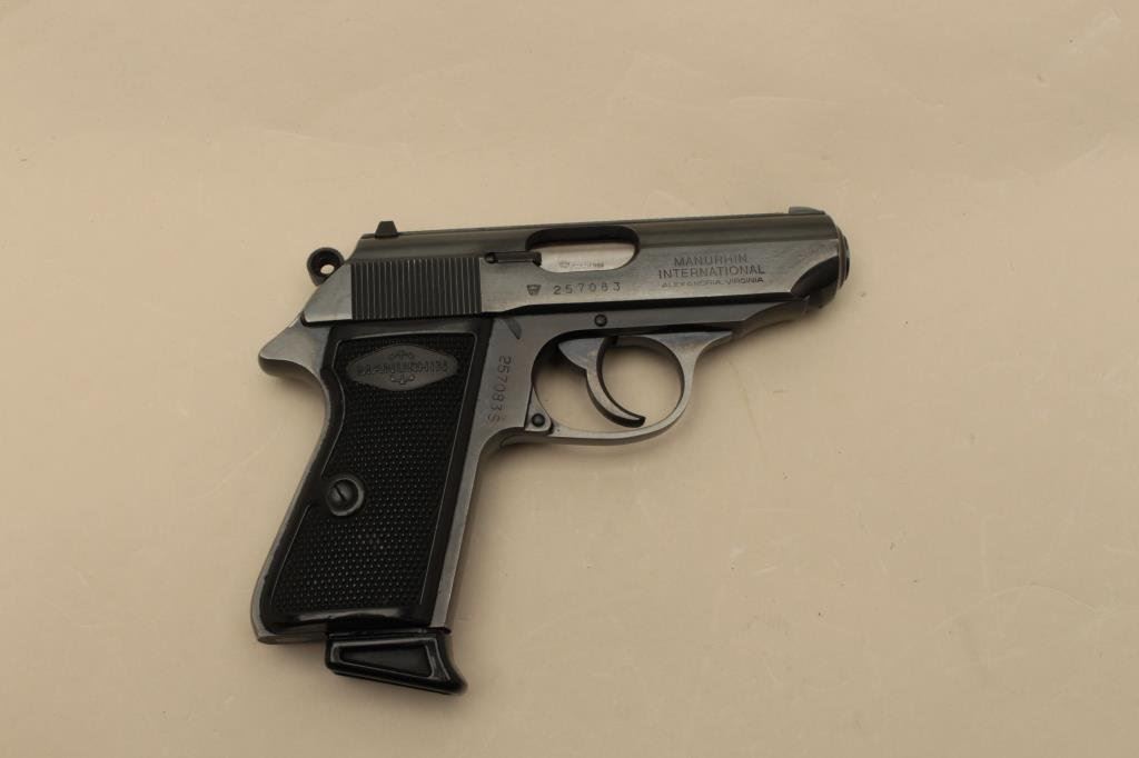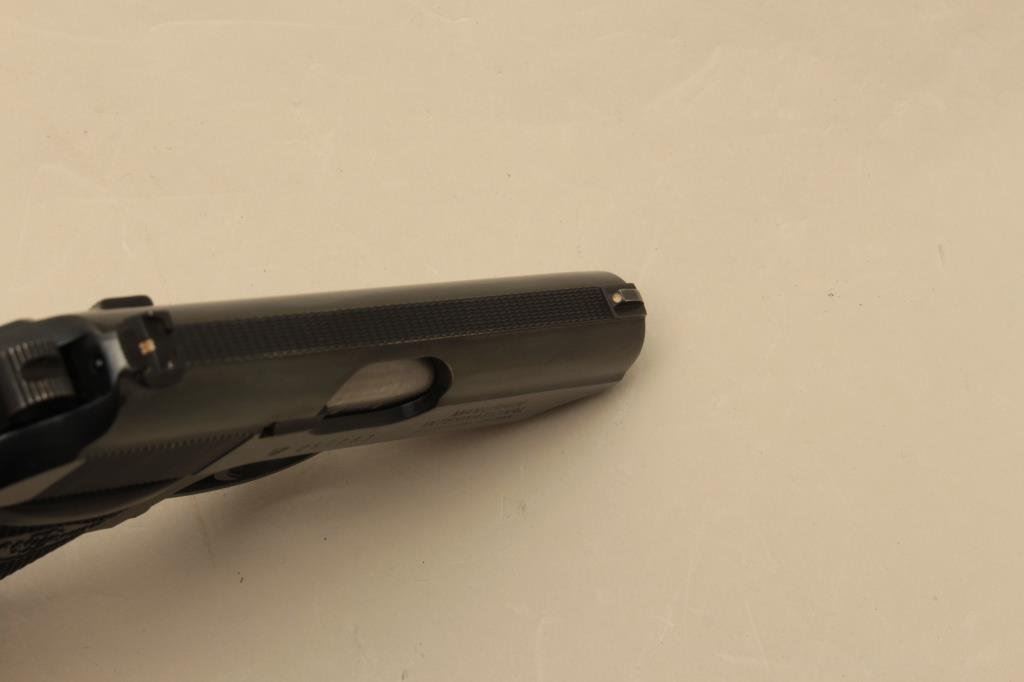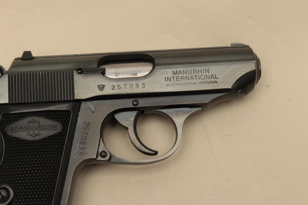 Serial #257083. The pistol is in very good overall condition with a 3 ½” barrel. The pistol retains the majority of its blued finish with light holster wear at the muzzle. The pistol is import marked with, “MADE IN FRANCE” on the slide. The checkered plastic grips are in good condition showing wear from use and carry. The bore is good, the action is crisp and markings are sharp on this French pistol manufactured on the PPK design. The lot includes two correct magazines. Est.: $250-$500. (Modern).