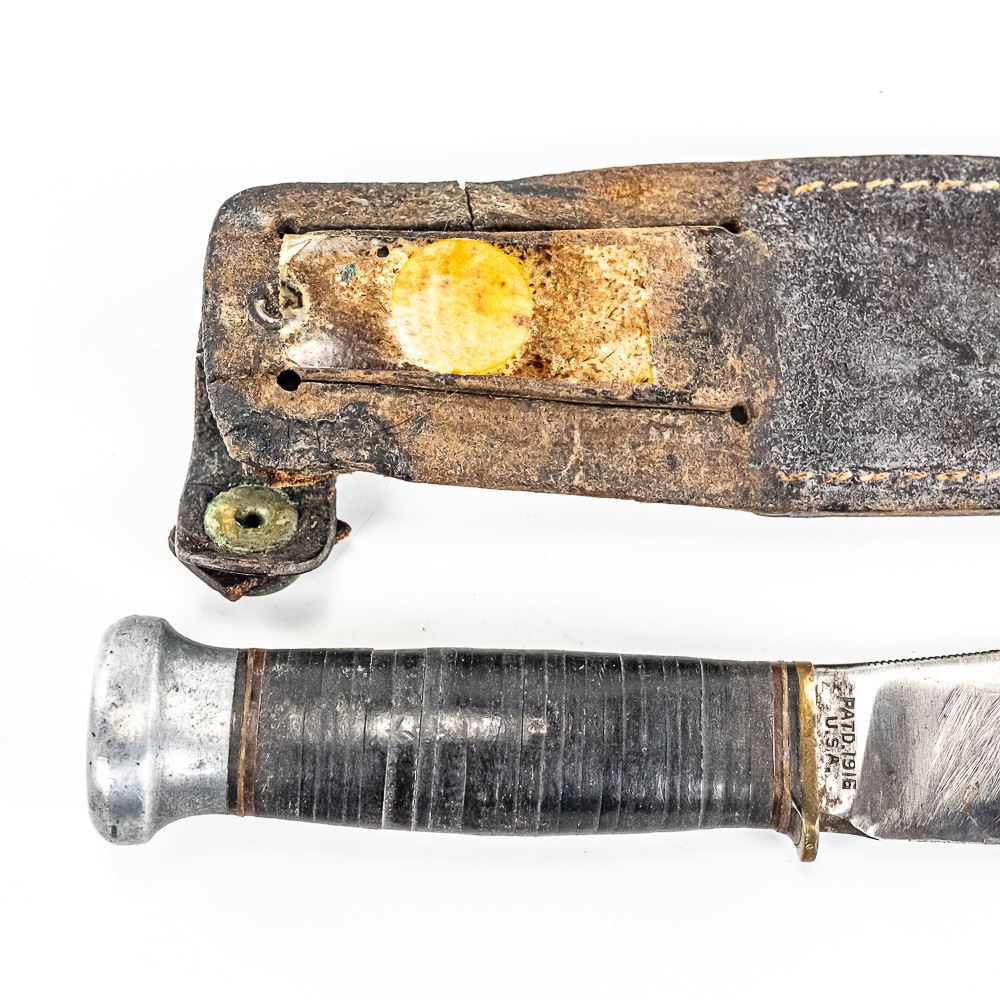 Vintage Marbles Woodcraft model knife circa 1916-1925. Blade measures 4" w/sharpened tip. Overall knife length 7-3/4". Blade is bright and exhibits grind marks. Crisp older 3 line "roller coaster" ricasso stamp Marble’s / GLADSTONE. on one side and PATD 1916 U.S.A. on other side. File thumb rest, brass hilt. Fiber and brass spacers w/stacked leather handle, nice and tight. Aluminum pommel w/ “large nut”, 1/2” diam. With original Marble's sheath, with broken partial snap enclosure. A nice early knife, with strong markings. See photos.