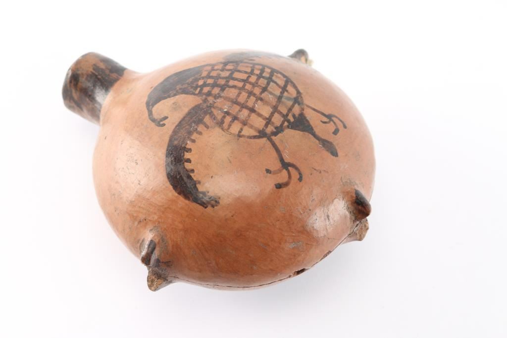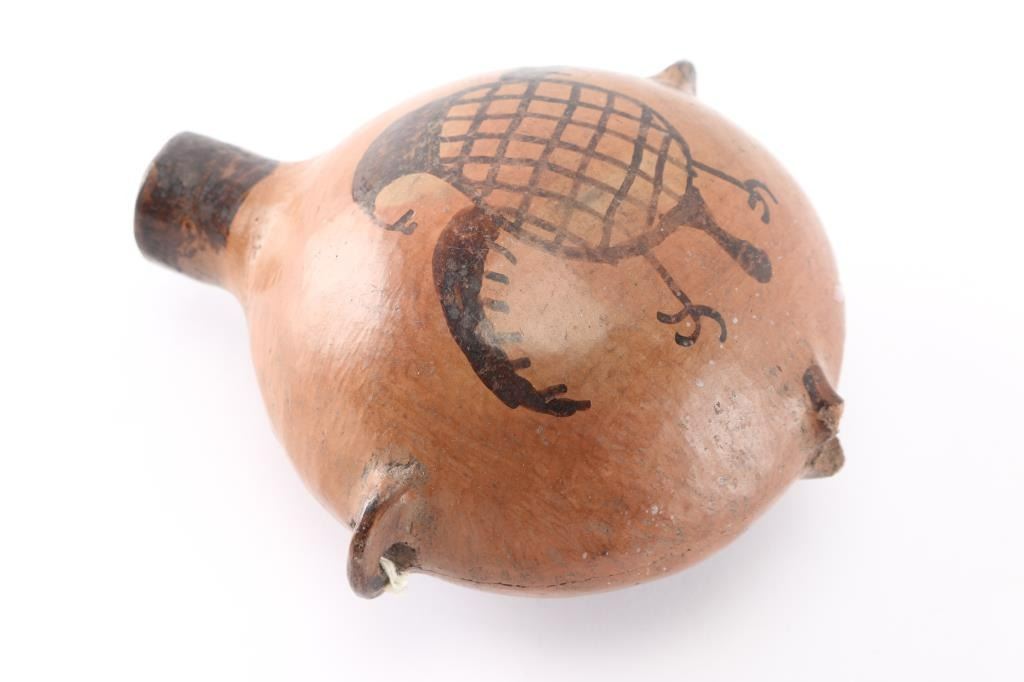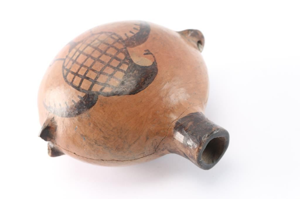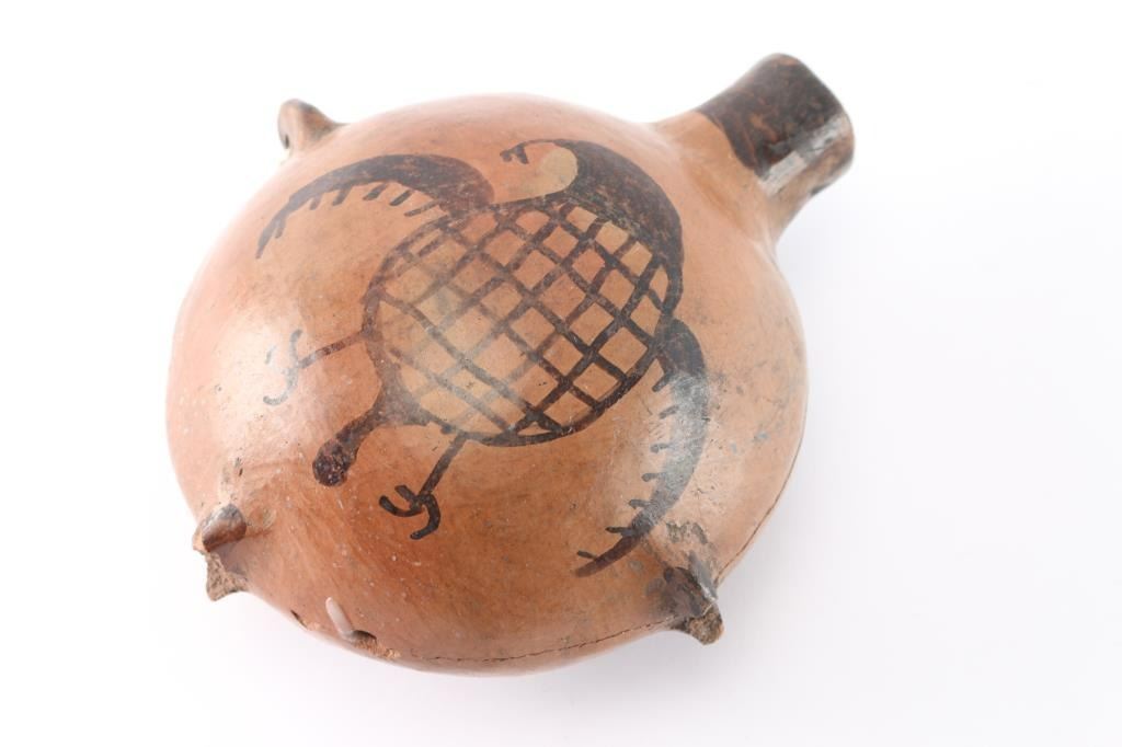 With painted buzzard design on both sides. Measures 6 1/2". Two of the 3 handles are broken, with repaired crack all around.