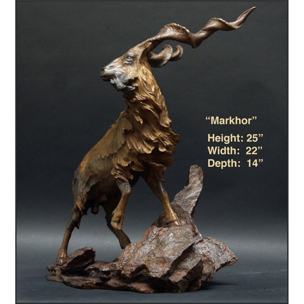 This beautiful markhor is an original bronze from Doug Van Howd on a black granite base, measuring 25" high x 24" wide x 14" deep. Doug is well-known worldwide for his wildlife and western creations. He has twice been received as a guest of the government of Taiwan to present his works to President Chiang Ching-Kuo and President Lee Teng-hui. His bald eagle “Masters of the Wind” is displayed in the office of the Secretary of the Interior, Washington DC, and his portrait of Attorney General Edwin Meece hangs in the Hall of Justice.