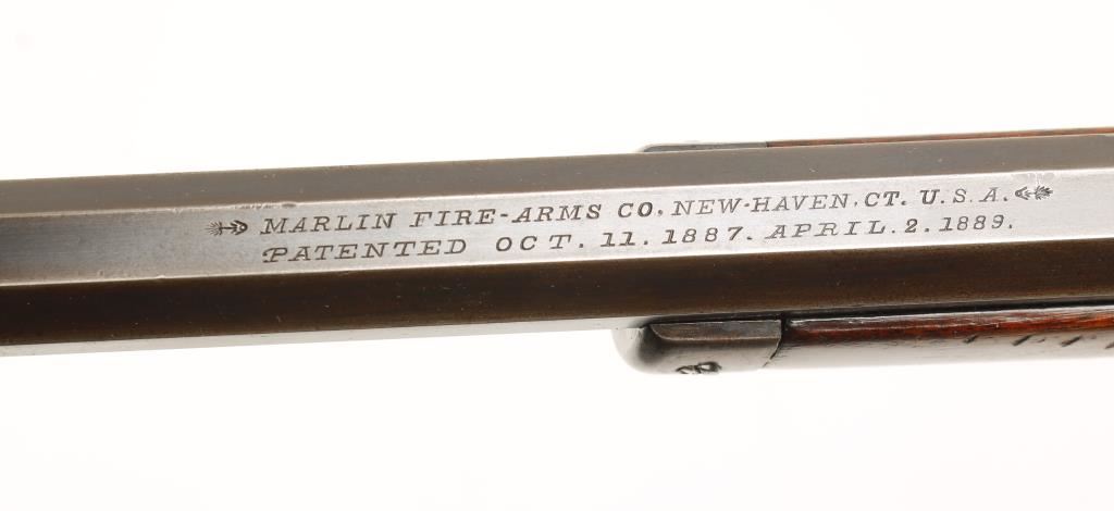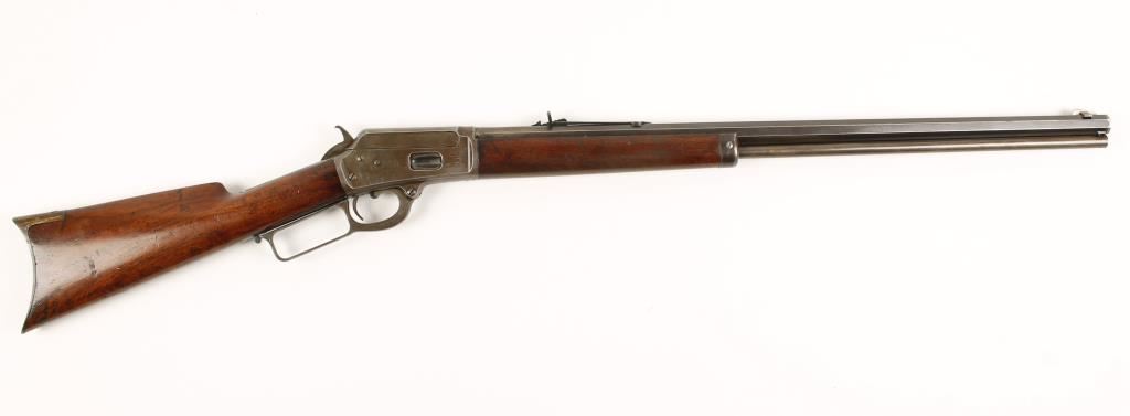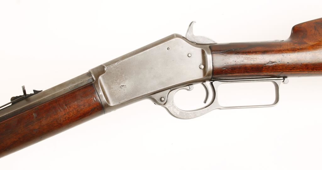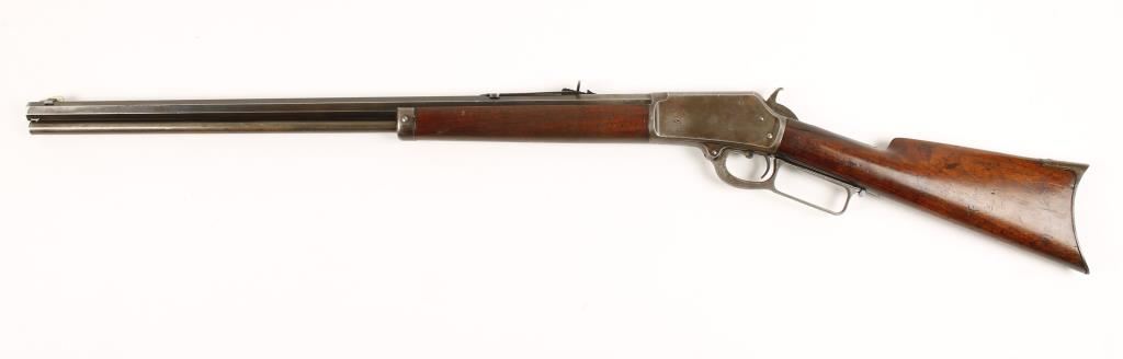 Rifle with a 24" octagon barrel, crescent butt plate, forend cap and correct rear sight. Made in 1890. Stock has been cut down to leave a 11-3/4" length of pull but retains the correct crescent butt plate. Crack on left side of stock at receiver. The stock and forearm have numerous dings and scratches. Due to the shortening of the butt stock the heel of the buttplate does not match the line of the comb. All the roll stampings are sharp and clear. There are dings on the sides of the receiver. The finish has edge wear and fading. The bore is dark but retains rifling and shows pitting. Action is good. Condition is good to very good as antique. *Antique Firearm*