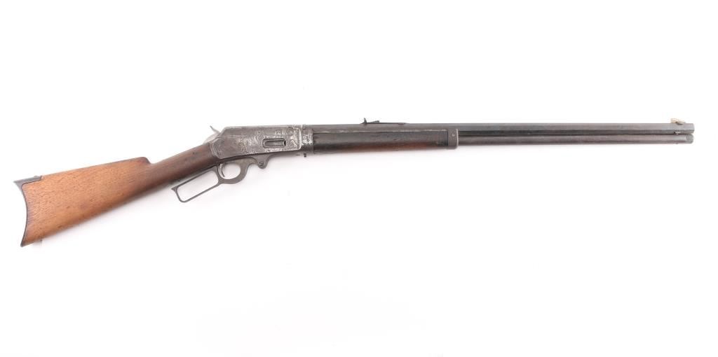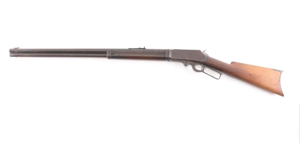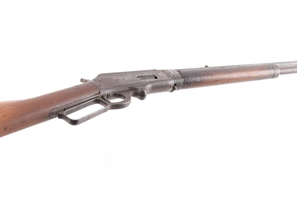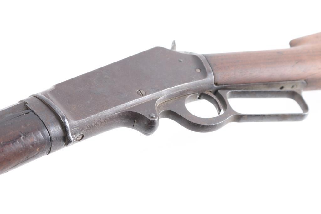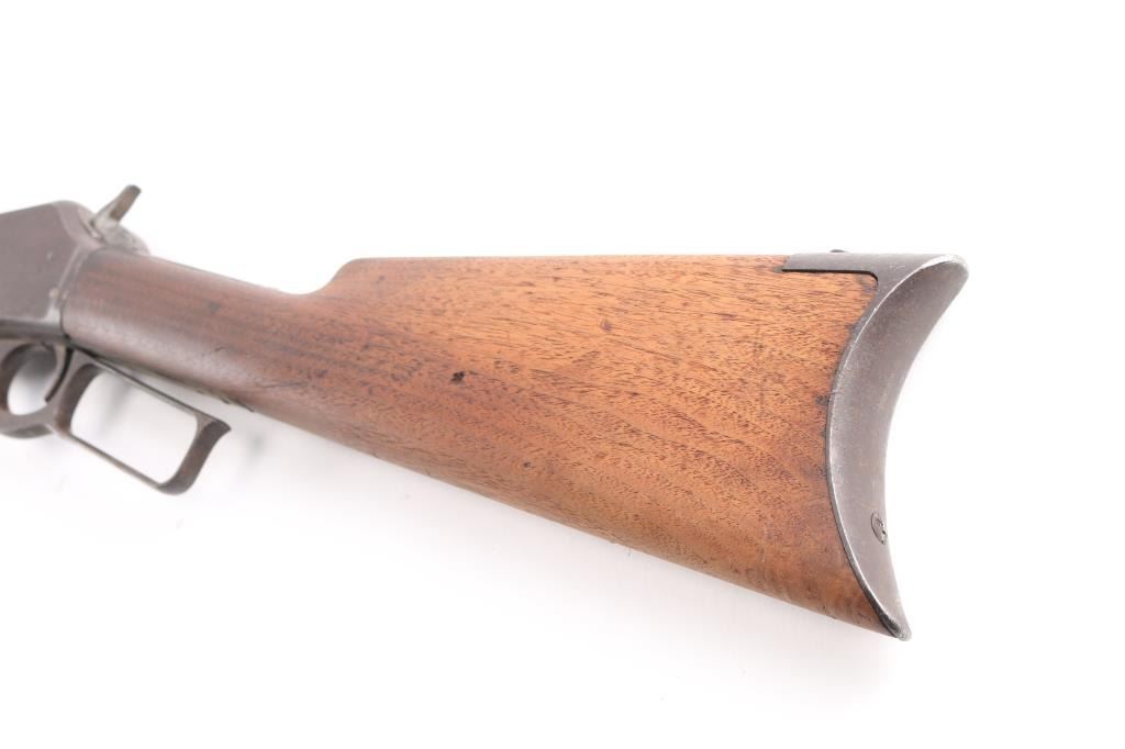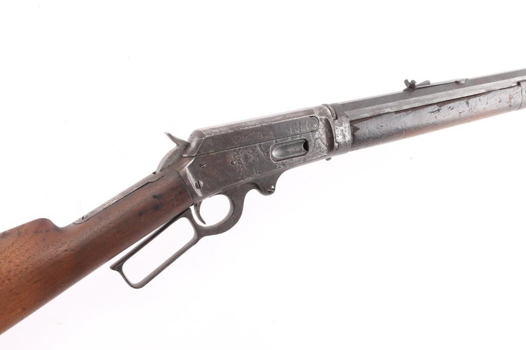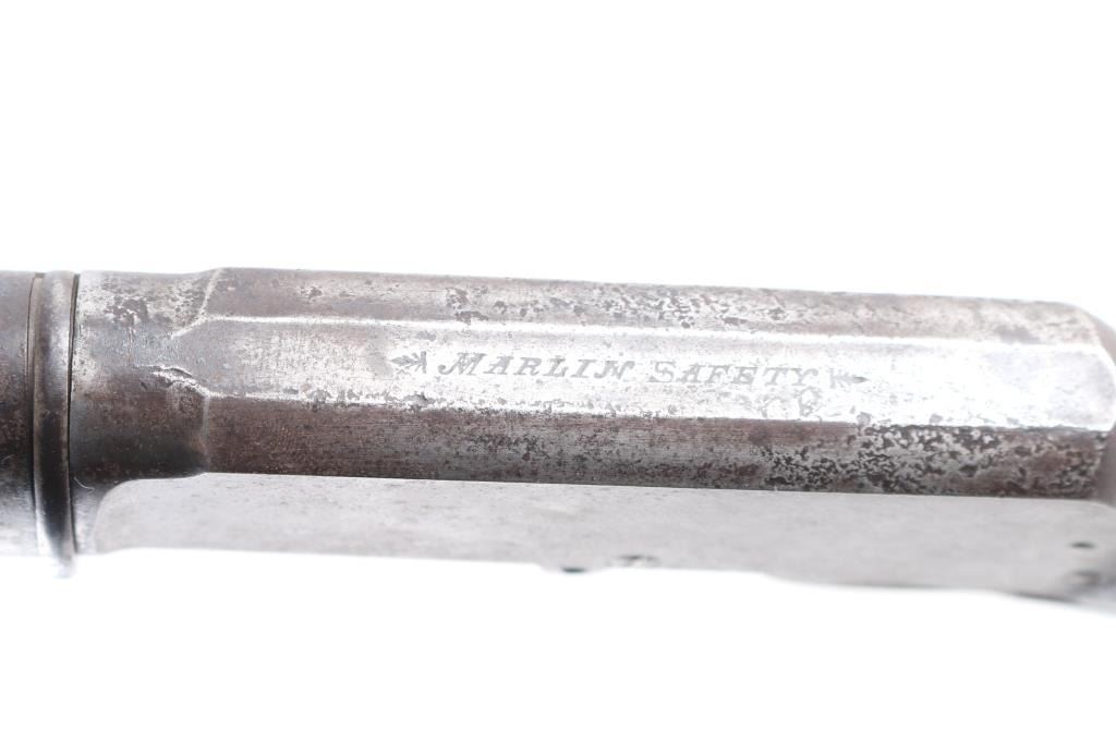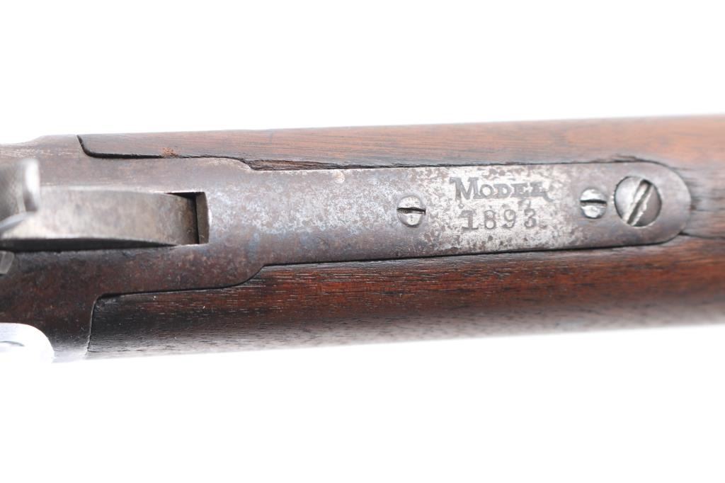 Marlin Model 1893 Rifle in Caliber 30-30 with special order takedown frame. Standard 26" octagon barrel is marked "SPECIAL SMOKELESS STEEL", with full magazine, and crescent rifle buttplate. Sights consist of a standard semi-buckhorn Marlin rear sight with a German silver blade front sight. Barrel address has all 3 correct patent dates which include the 1887, 1889, and 1893 dates. Upper tang marked "MODEL 1893" and top of frame marked " MARLIN SAFETY". Markings are feint, but readable, the buttstock appears to have been lightly sanded as it is a lighter color than the forearm, the metal finish has turned a brown patina, the bore is dark/rough with rifling present, action works well, the forearm has a couple of chips, and missing sliver of wood on on the top of both sides where the wood meets the barrel. The right side of the receiver has areas of deep pitting. Manufactured circa 1903. Looks like it sat out in the barn for a number of years.