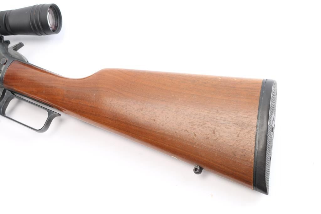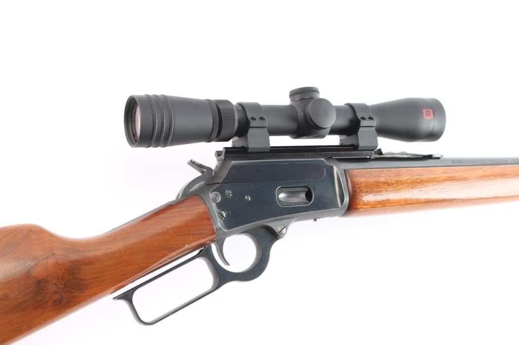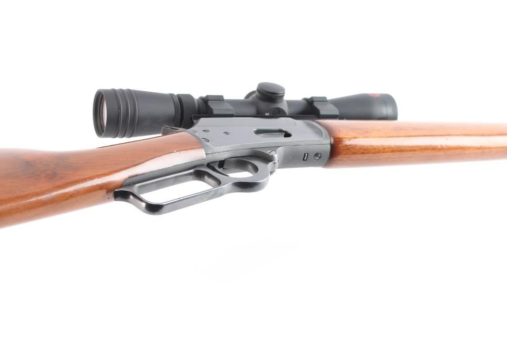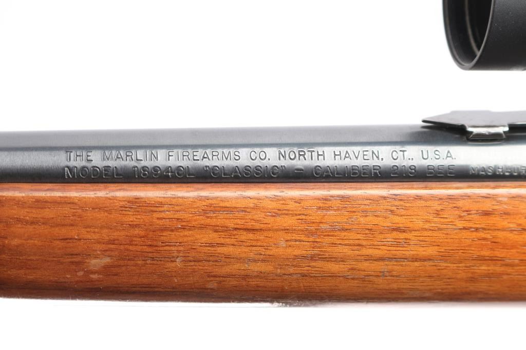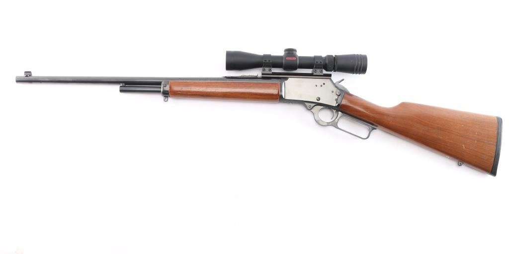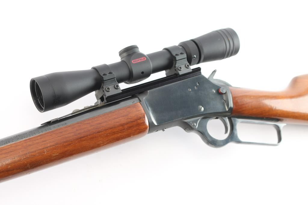 SN: 09008881. 'Classic' American made lever action repeating rifle chambered in .218 Mashburn Bee. Features a blued finish, 21 3/4" JM marked barrel, 1/2 length tube magazine, blade/bead front sight, adjustable semi-buckhorn rear sight, drilled & tapped receiver, serrated hammer spur, smooth trigger, push button safety, smooth walnut forend and straight grip shoulder stock with factory black rubber recoil pad, sling swivel studs. Rifle exhibits approximately 98% of it's original finish showing only light handling marks & wear. Action is smooth, bore is excellent and wood stocks are overall very good/sound with minor scratches/scrapes. Mounted with a Redfield Revolution 2-7x33 scope, duplex reticle, clear optics. one piece base. Manufactured 1991.