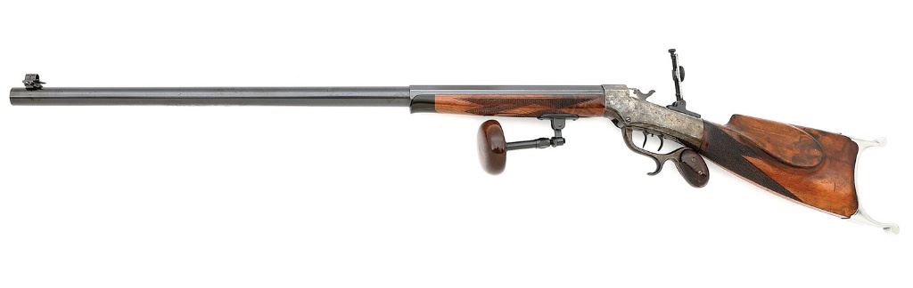 serial #26507, 38-55, 32'' part round part octagon barrel with a mostly bright very good bore showing some scattered small areas of light pitting and oxidation with otherwise strong rifling throughout. The barrel of this rifle retains about 75% original blue with overall fading to gray-brown patina under bright light, some oxidation speckling and light handling marks. The action is mostly a smoky gray patina with mild brown undertones and wisps of case-hardened colors lurking about and the lever loop has had a set of smooth walnut inserts added during the period of use. There is a small vacant hole drilled along the bottom right edge of the frame, perhaps once holding a trigger finger rest/post. The checkered walnut forend with horn schnabel tip is a later very nicely made replacement in excellent condition with nice grain figure and crisp checkering, also equipped with a palm rest. The checkered walnut buttstock with left-side cheekpiece and schuetzen buttplate remains in very good plus with a little older added varnish and some scattered light dings and handling marks. The buttplate shows a small gap at the toe and the stock shows some nice grain figure throughout. The barrel is numbered ''29797'' while the stock and buttplate are ''27716'' and the breechblock is matching the action. The double set triggers seem to function well mechanically and there are a pair of drilled and tapped holes along the barrel for mounting blocks. The rifle is sighted with a mid-range Vernier tang sight that has been refinished in matte gray-blue and windgauge target globe front with square post insert. A nice slightly customized rifle in No. 6 configuration. (13C11164-33) {ANTIQUE} [Scott Ashley Collection] (2500/3500)