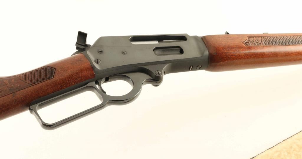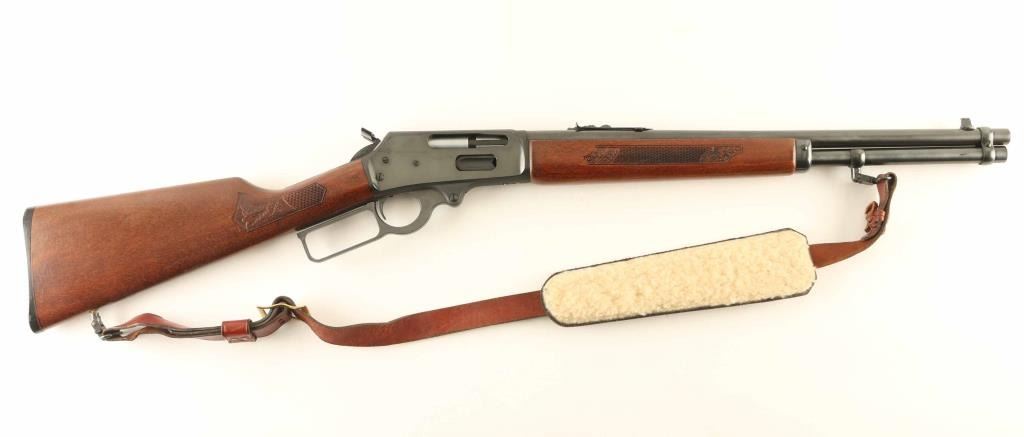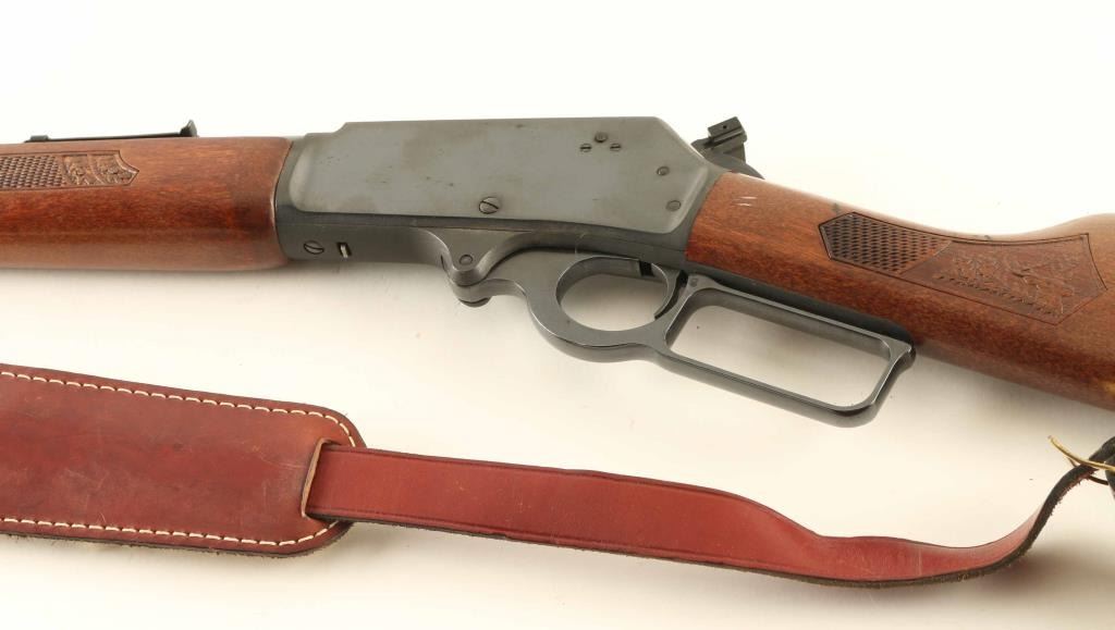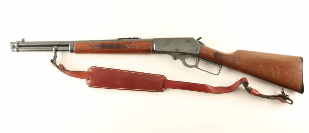 Rifle. Lever-action. GT Model "Glenfield Texan" Manufactured 1979-80. 7,717 produced. 18" round barrel with open iron sights. Blued finish. Checkered stock, and forend. Plastic buttplate. Hammer lever extension. Fed from tube magazine. Receiver drilled/tapped for scope mount. Blued finish is about 98%, with scratches on the left receiver. Bore is excellent/Bright. Action is crisp/tight. Wood is very good, with a couple of minor scratches, and a couple of minor spots of white paint on the left stock. Brown leather sling, with fleece lined shoulder pad attached. NRA Condition-Very Good. Modern Firearm.
