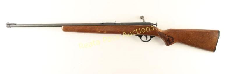 Single shot bolt-action sporting rifle chambered in .22 Short, Long or Long Rifle. Features a blued finish, 22" barrel, ramped blade front sight, rear sporting sight(missing ramp), integral scope rail scope cut into the receiver, serrated trigger, manual cocking system, and one-piece smooth wood pistol grip shoulder stock. Rifle exhibits approximately 65% of it's blued finish overall showing a browning patina & some rust/pitting. Action is sound, bore is excellent and wood stock is fair to good. Condition is good. ***Modern Firearm***