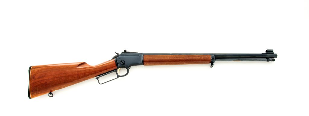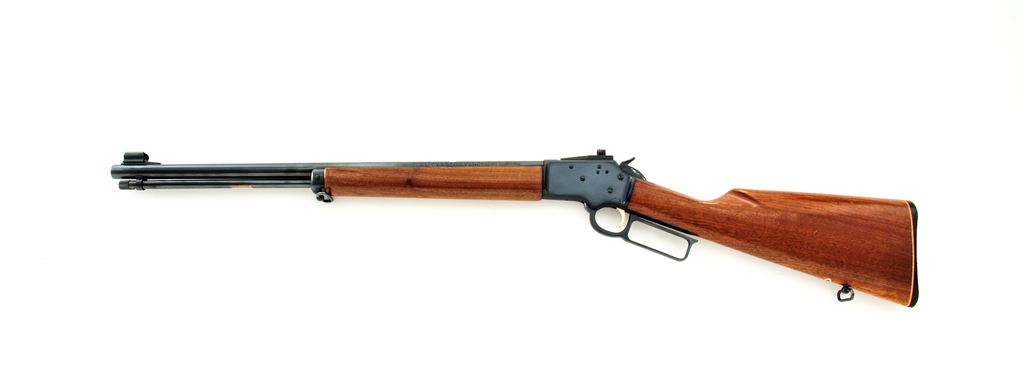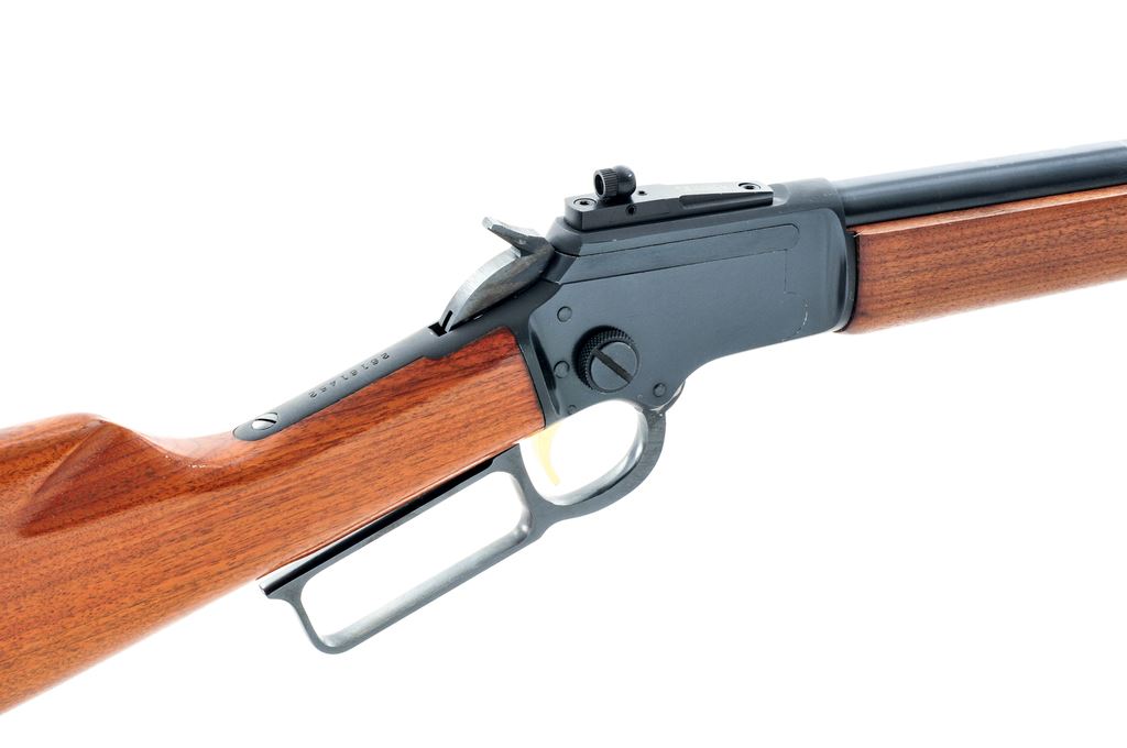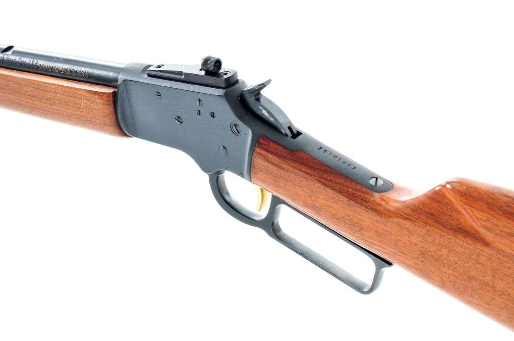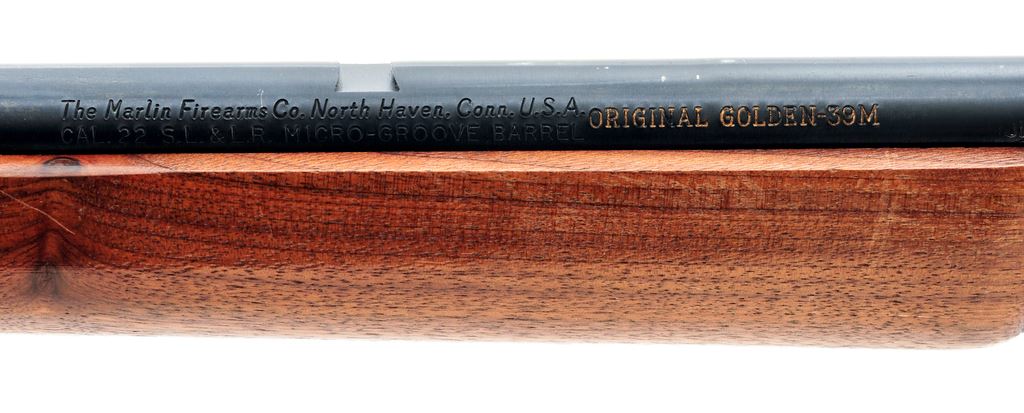 Marlin ''Golden'' 39M Lever Action Carbine, #26161452, .22 LR cal., 20.5'' ''JM'' marked micro-groove barrel, blue finish, straight grip wood stock, sling swivels, black Marlin buttplate, gold trigger, hooded front sight, rear sight has been removed, with receiver mounted peep sight by Skinner. Metal surfaces are in near excellent overall condition, showing normal signs of light use. Approx. 98%+ factory blue remains; receiver with a few shallow surface scratches; top of barrel near the rear sight cut out with a few minor nicks and rub marks. Wood is very good; buttstock shows some shallow impressions, most noticeable along the top edge; forend with general light handling marks. Action is excellent with a bright bore. Est.: $350-$550. (Modern)