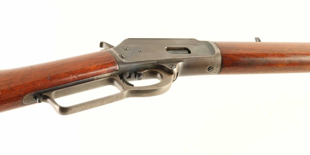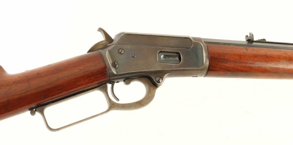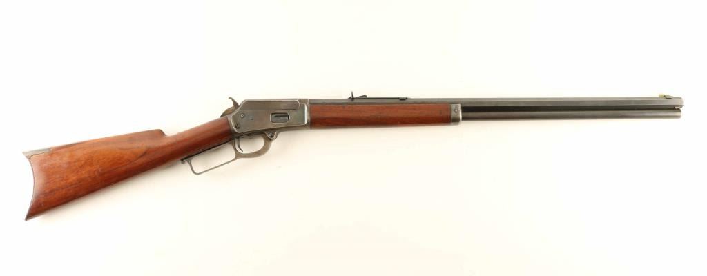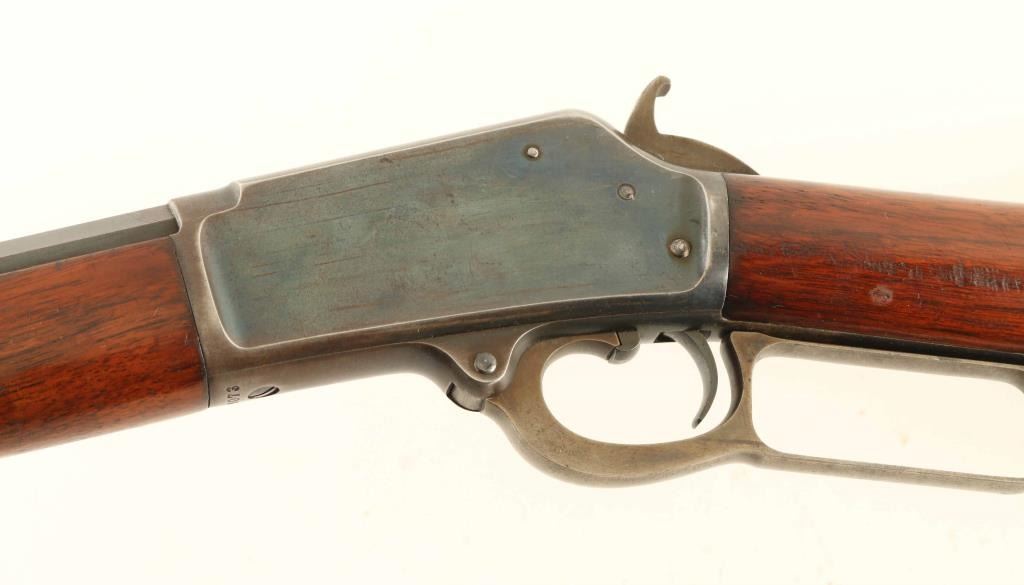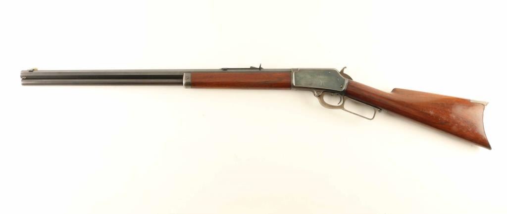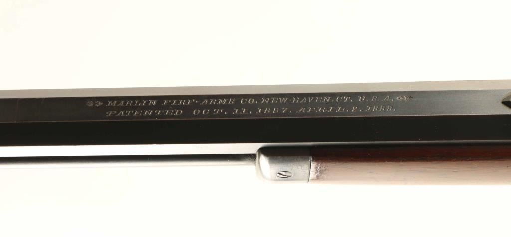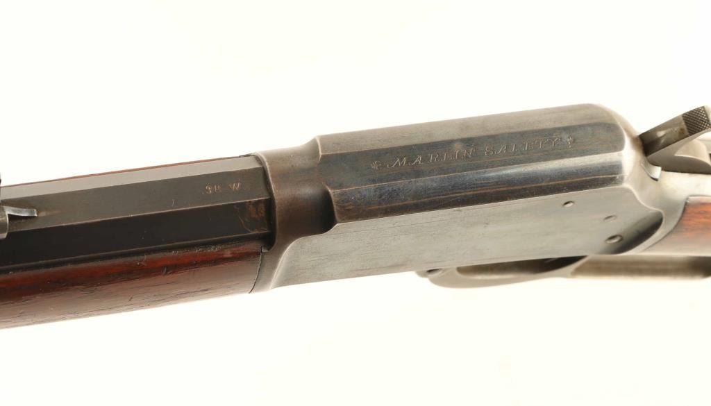 Lever action rifle manufactured circa 1892. Features 24" octagon barrel, full length magazine tube, buckhorn sights, straight grip, steel crescent buttplate. Bore is very good condition. Retains 75% blue, thinning and turning gray or brown at edges & bottom of receiver, at forend cap. Hammer & finger lever have a slightly mottled gray color, appears to be faded case color. Buttplate is grayish bare metal with some patina and small areas of light rust. Screw slots are good with some light marring. Wood is very good condition, good fit to metal, visible scratches & dents, varnished finish. Action is smooth. Markings are crisp. Condition is NRA Very Good - varnished wood *** Antique Firearm ***