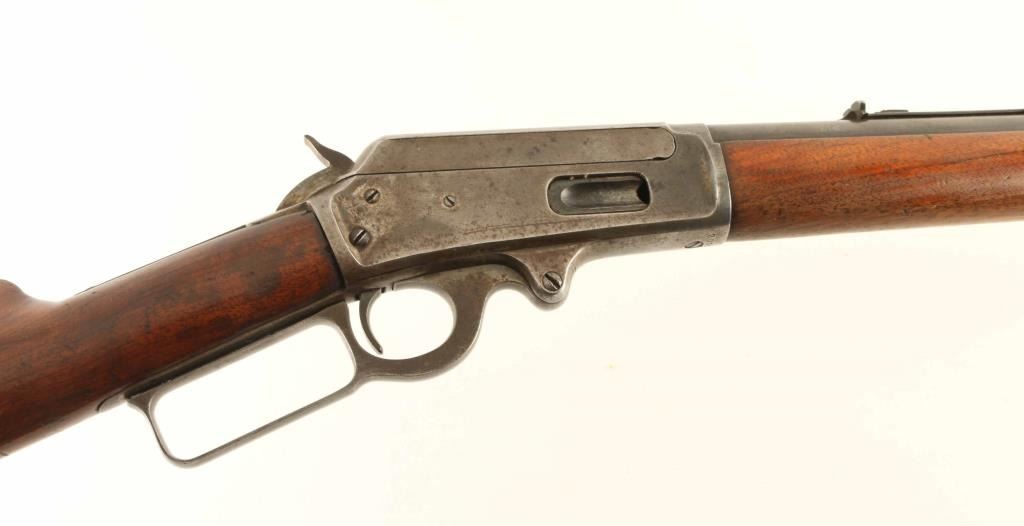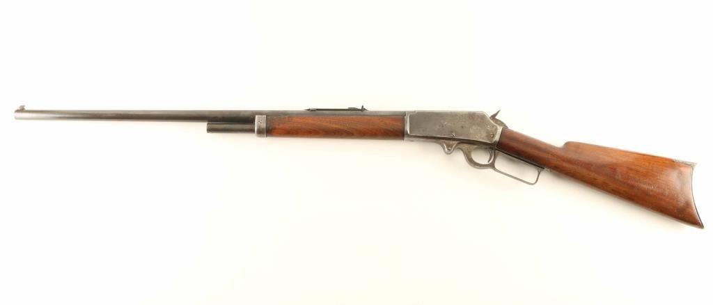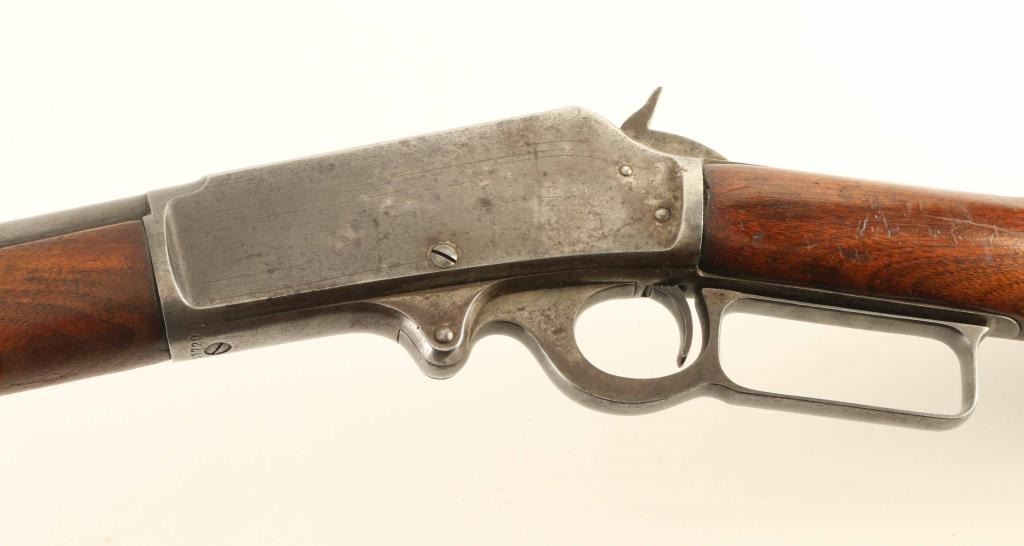 Lever action rifle manufactured circa 1900. Features blued finish, plain wood forend & straight gripped stock, steel crescent butt plate, 25" barrel, half length magazine tube, buckhorn sights. Bore is very good condition, bright with strong rifling. Barrel and mag tube retain majority coverage mottled gray or plum colored bluing, with areas of thinning to bare metal. Action is mostly patina brown colored, with areas of thin silvery blue. Barrel appears cut back, front sight dovetail is right at the muzzle. Wood is good serviceable condition, appears lightly sanded with discoloration in spots, coated with varnish, with fair fit to top of buttplate, some smooth depressions at wrist. Forward edge of forend is eroded and loose to nose cap, some loss of varnish at rear. Condition is NRA Good *** C&R Firearm ***