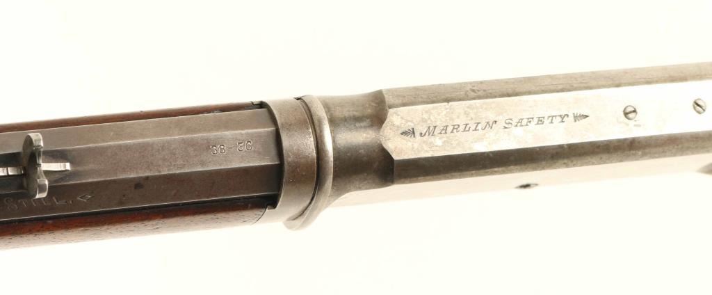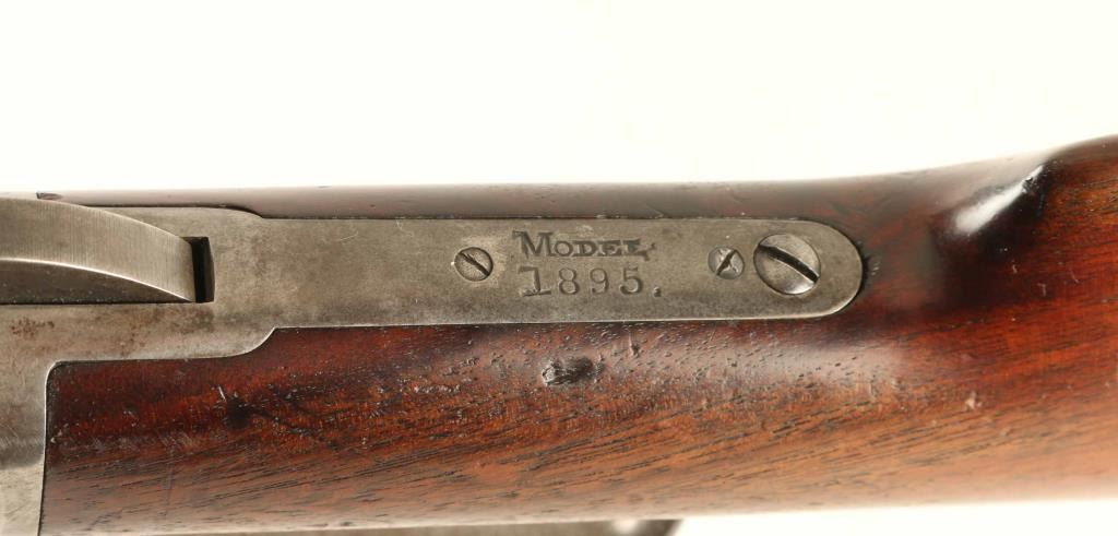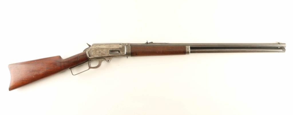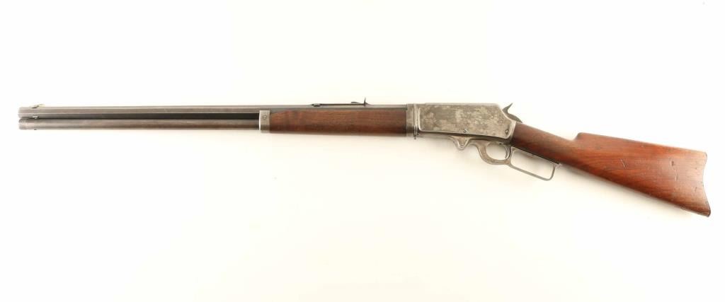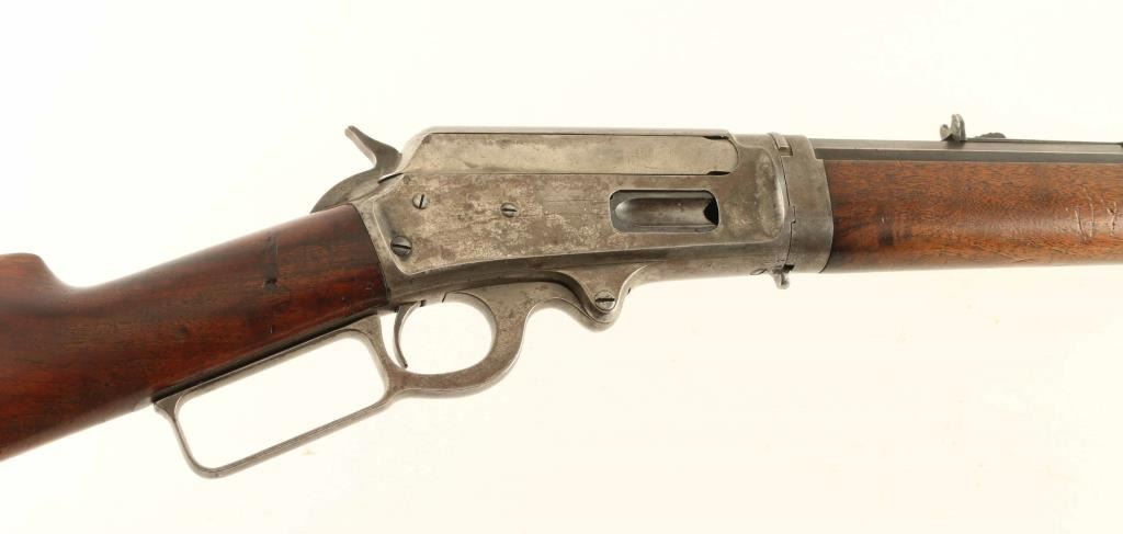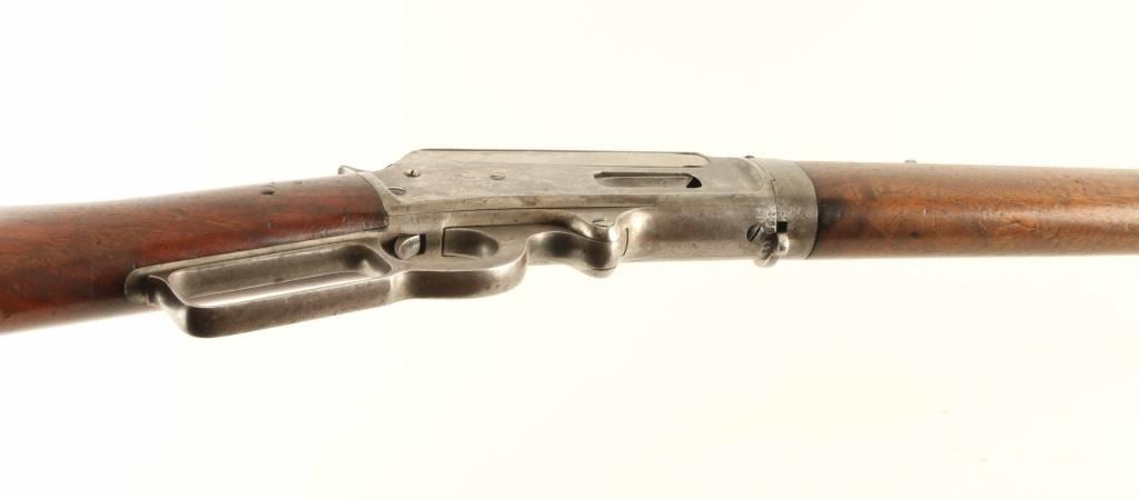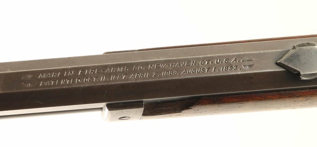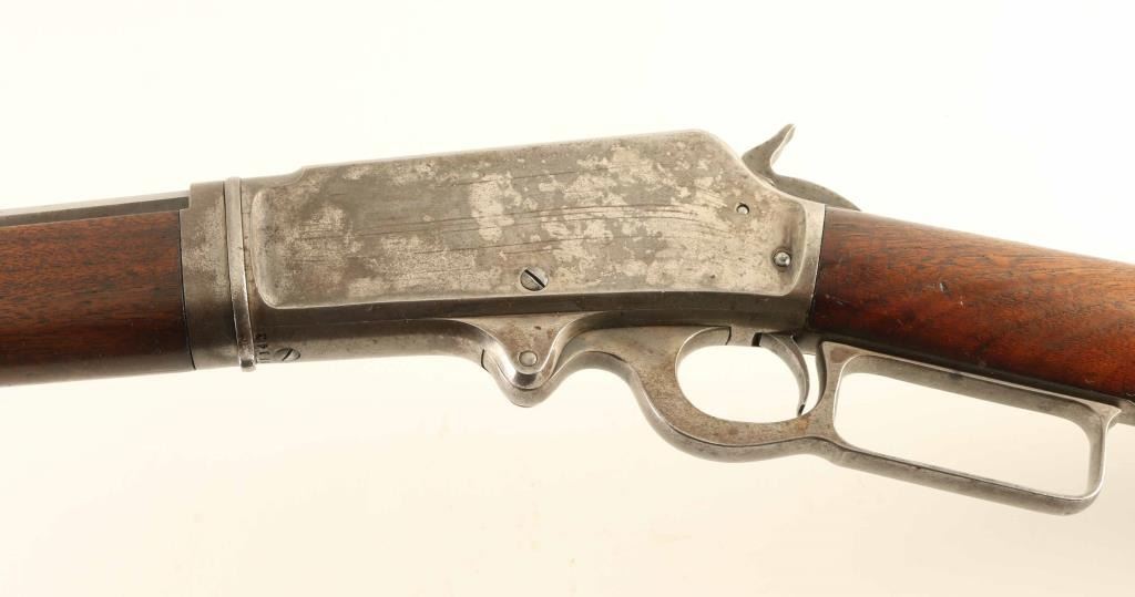 'Take-Down' lever action rifle manufactured circa 1904. Features 26" octagon barrel, full length magazine tube, buckhorn sights, straight grip, curved steel buttplate. Bore is good condition, visible pitting, strong rifling. The action appears case colored, now faded to a slightly mottled gray or silver color, some dulled & faded blue or gold case colors visible on right side of receiver and in protected areas on lever, small areas of pitting on lever. Barrel and magazine tube are blued, retaining majority coverage of a finish that has mostly turned gray or brown, with scratches & scuffs, small areas of patina. Loading gate shows lots of bright blue. Receiver and receiver extension display many small impact dents to bottom in area of takedown latch. Buttplate is bare metal, showing brown color from patina. Screw heads show marred slots. Wood is good condition, varnished, overall good fit to metal, scratches & shallow dents, shallow gouges on wrist & butt, chip missing from forend. Action operates smoothly. Markings are crisp, except where dents partially cover serial number.