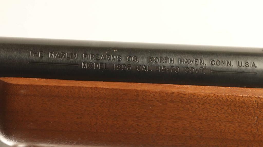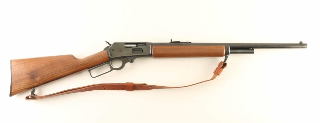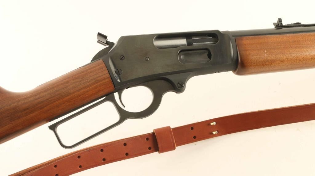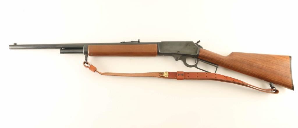 Lever action rifle features blued finish, two piece plain wood stock with straight grip, 21.5" barrel, half length magazine tube, buckhorn type sights, plastic buttplate, sling studs. Bore is very good condition. Retains 95% blued finish with few scratches, handling marks. Wood is excellent condition with few scratches. Buttplate is discolored around edges. Includes screw-on hammer extension, very good condition leather sling with detachable sling swivels. Condition is NRA Excellent *** Modern Firearm ***