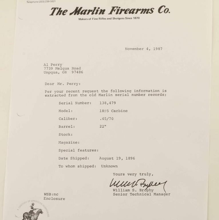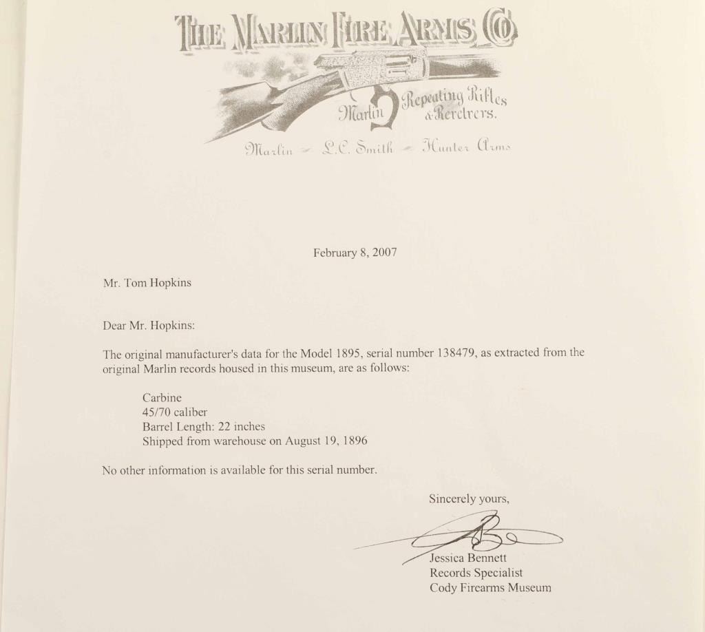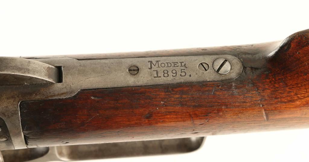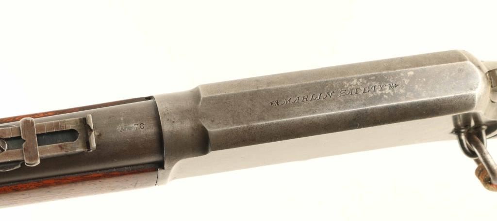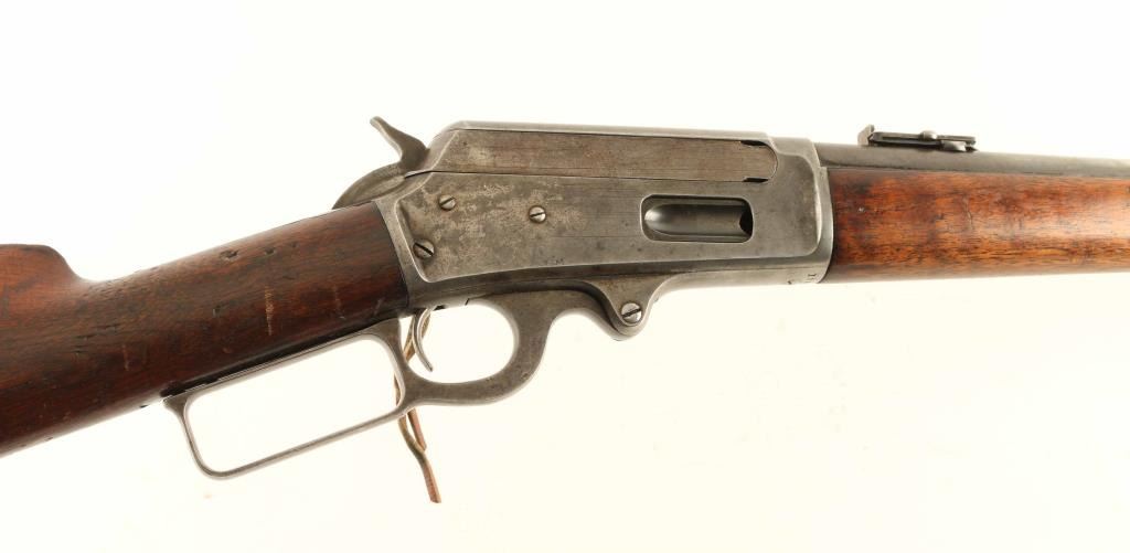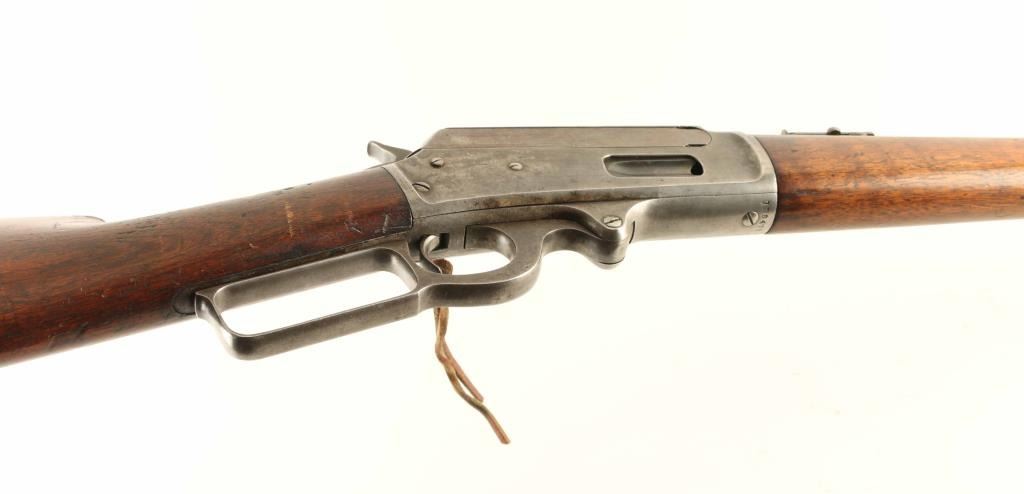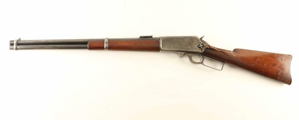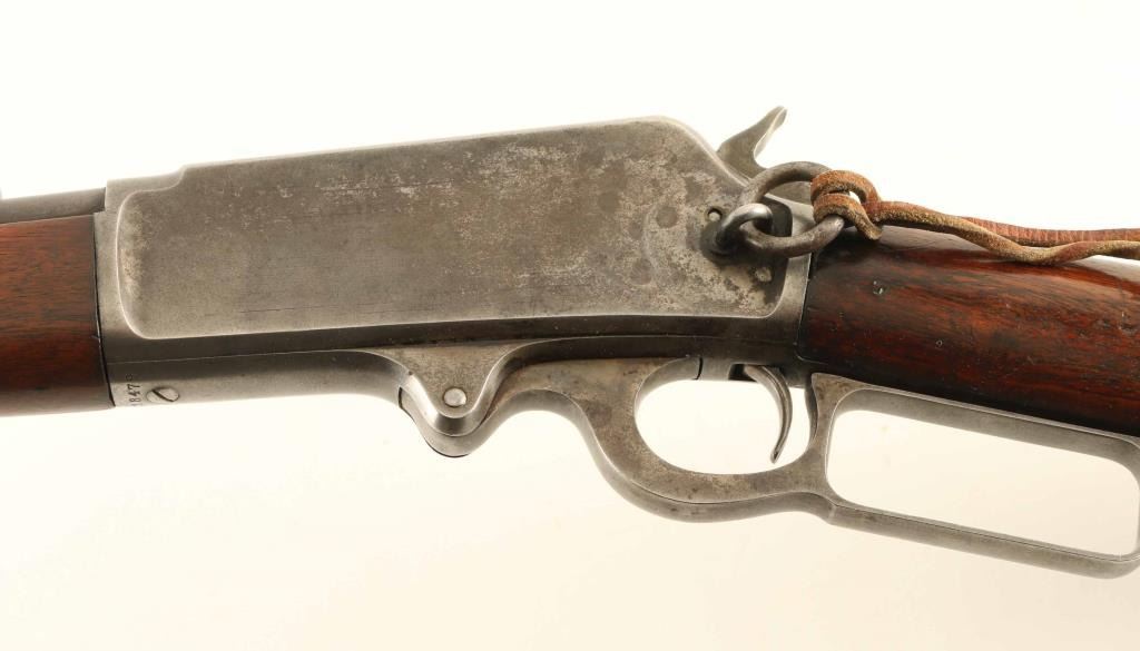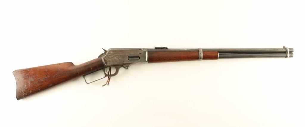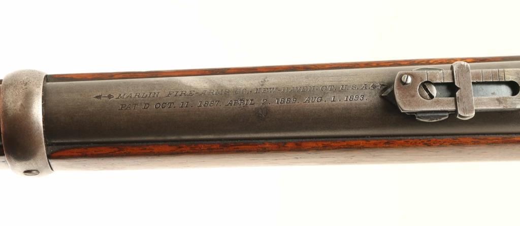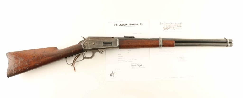 'Saddle Ring Carbine' manufactured circa 1896. Features 22" round barrel, full length magazine tube, blade front sight, flip up ladder type rear sight, straight grip, curved steel carbine buttplate, saddle ring. Bore is very good condition, lightly frosted or pitted with strong rifling. Blued finish has largely turned a dull gray at the action, with bare metal at high spots and all edges. Barrel and magazine tube show darker color, some brighter blue remains in protected areas. Bands are mostly bare metal with light pitting or dents. Buttplate is bare metal with light coverage of patina and thin rust. Screw heads show light pitting, marred slots. Wood is good condition, varnished, overall good fit to metal, many dents (especially along bottom of butt), loss or thinning of finish on forend and at toe of butt, darkened wood at wrist. Action operates smoothly. Markings are sharp & readable. Includes letter from Cody Firearms Museum at the Buffalo Bill Historical Center describing features for this rifle contained in the original Marlin factory records. Condition is NRA Very Good (varnished wood) *** Antique Firearm ***