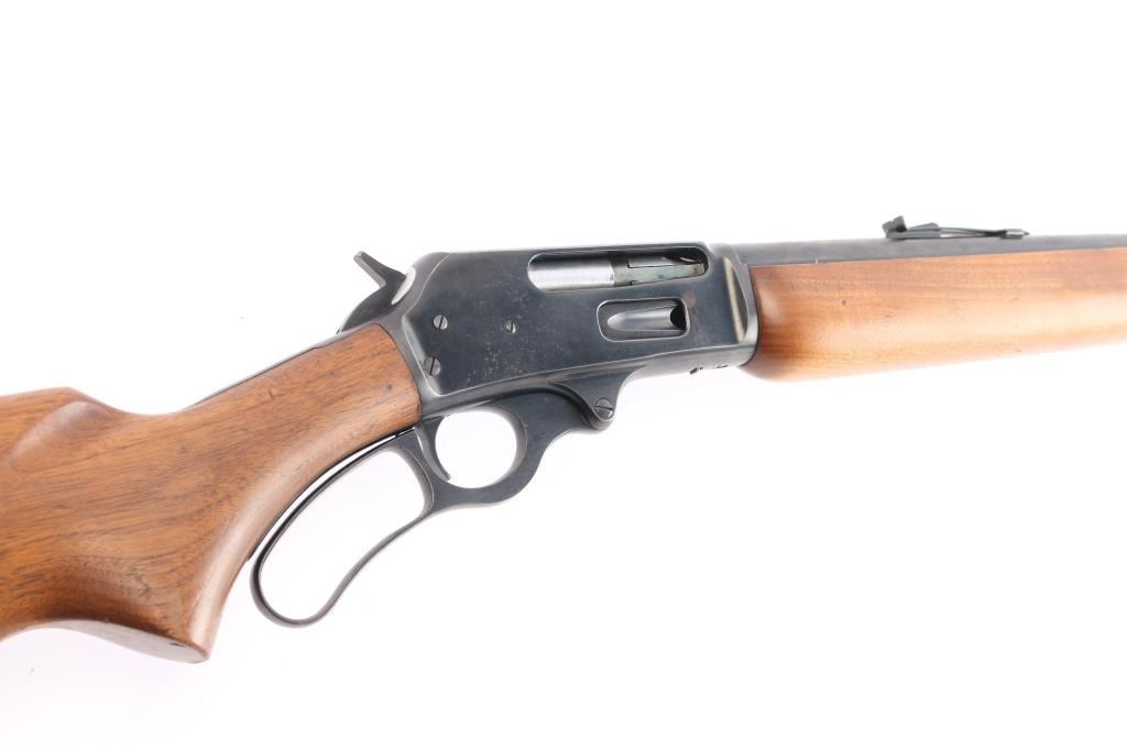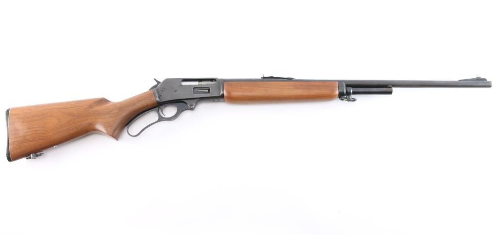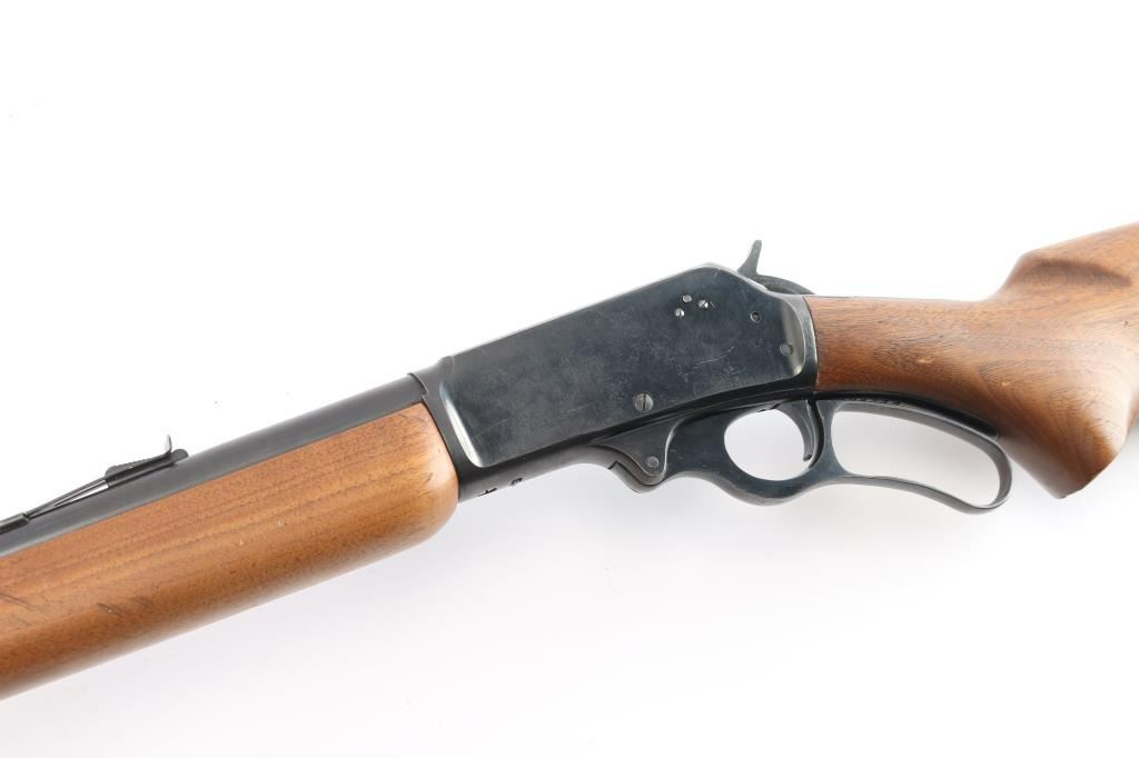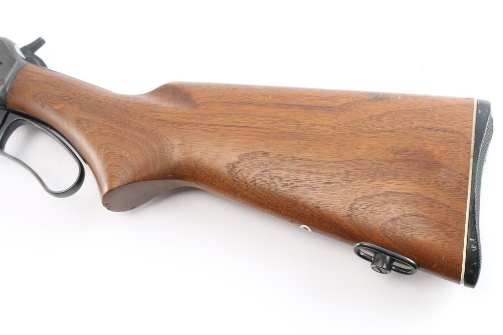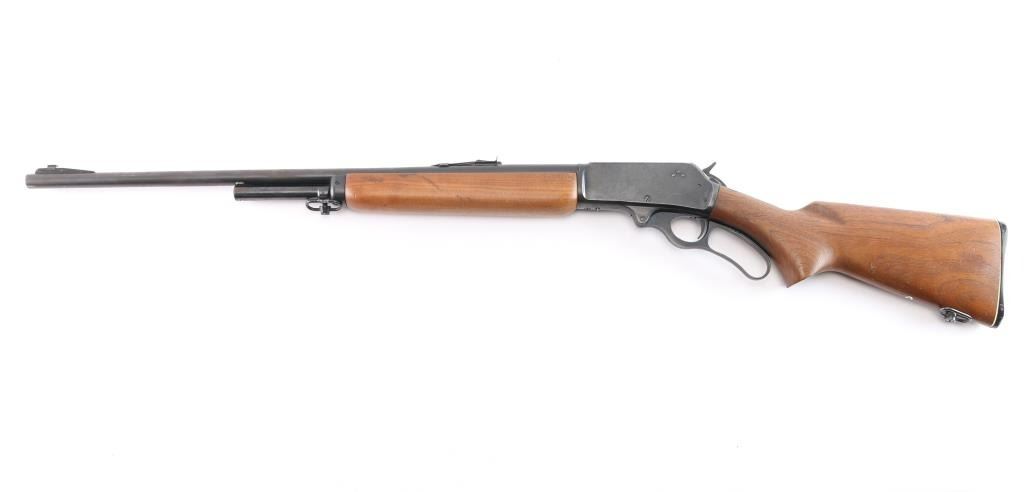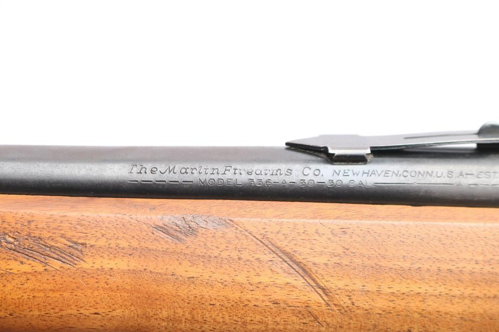 Vintage American made lever action repeating rifle chambered in .30-30 Winchester, manufactured circa 1951. Features a blued finish, "JM" marked 24" tapered barrel, 2/3 length magazine tube, ramped blade front sight with bead top, adjustable rear sporting sight, round bolt, smooth trigger, partially serrated hammer spur, curved finger lever, smooth walnut semi-beavertail forend, and pistol grip shoulder stock with serrated black factory buttplate. Rifle retains approximately 90% of it's blued finish showing wear and some light surface rust on the magazine. Action is smooth, the cut rifling bore is excellent/bright and the wood stocks are very good with minor scratches.