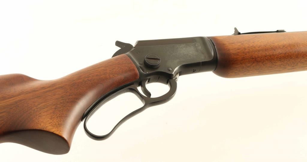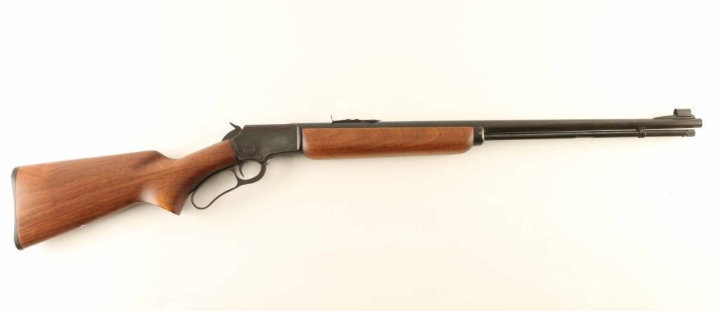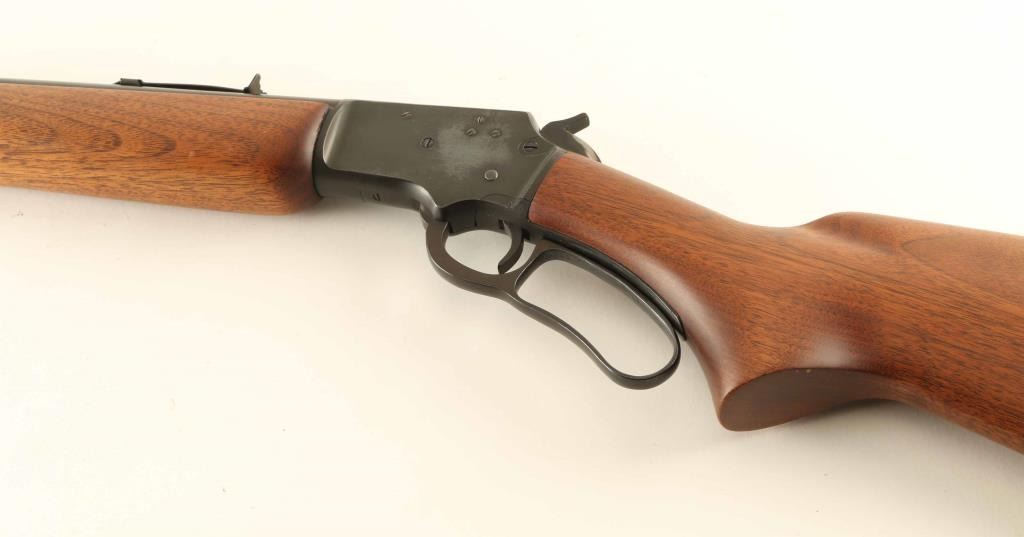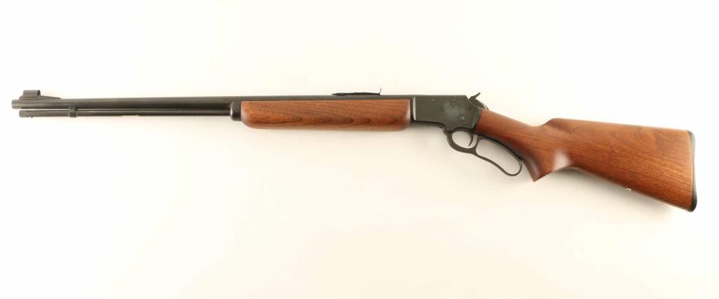 Vintage take-down lever action repeating rifle features a blued finish, 24" 'JM' marked heavy barrel, ramped & hooded blade front sight with brass bead, elevation adjustable rear sporting sight, full-length tube magazine, smooth trigger, serrated hammer spur, take-down receiver that’s factory drilled & tapped for a side mount rear sight, curved finger lever, smooth walnut semi-beavertail forend with satin finish and curved grip shoulder stock with inlayed bullseye & factory buttplate. Bore is very good. Retains approximately 90% of its original blued finish showing edge wear, scattered handling marks, slide wear on the hammer. Wood is very good with few minor scratches. Condition is NRA Very Good *** Modern Firearm ***