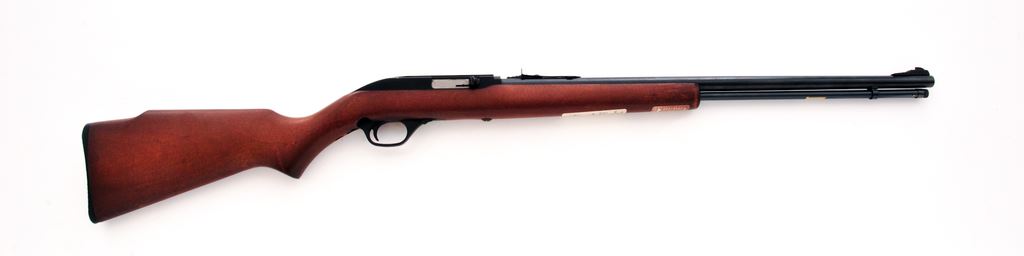 Marlin Model 60 Semi-Automatic Rifle, #10469007, .22 LR cal., 22'' micro-groove blued barrel, black receiver, pistol-grip hardwood stock, factory black plastic Marlin buttplate, with standard sights, and factory grooved receiver. Rear sight and surrounding area of the barrel with tiny specks of surface rust and a few scratches in front of the barrel address. Rifle is in otherwise very good condition with approx. 98% factory finishes. Stock with some light scratches and rub marks mainly at the wrist and bottom edge of the buttstock. Forend with the original factory stickers still in place. Action and bore are both excellent. Est.: $100-$175. (Modern)