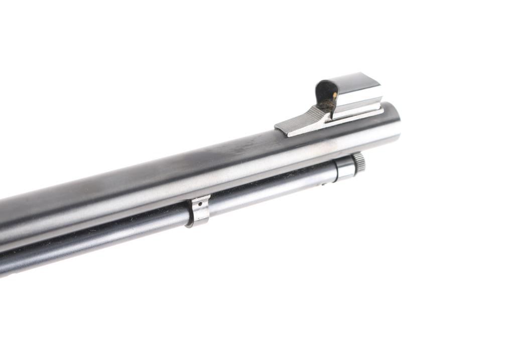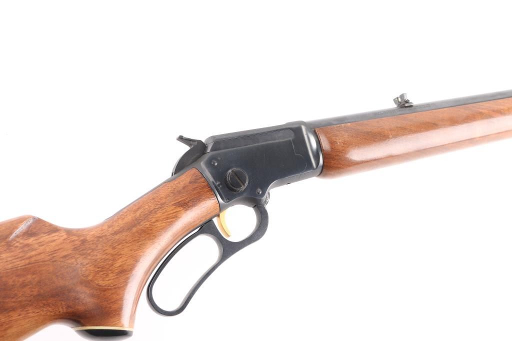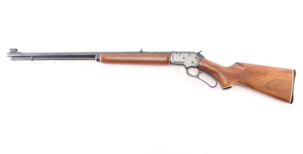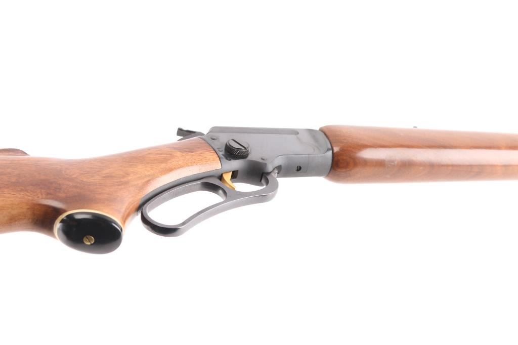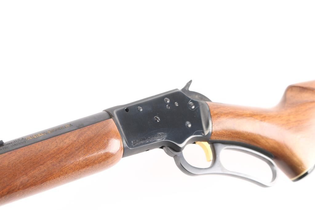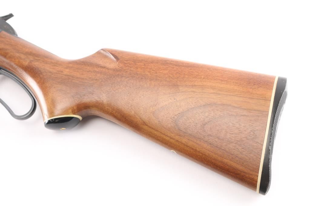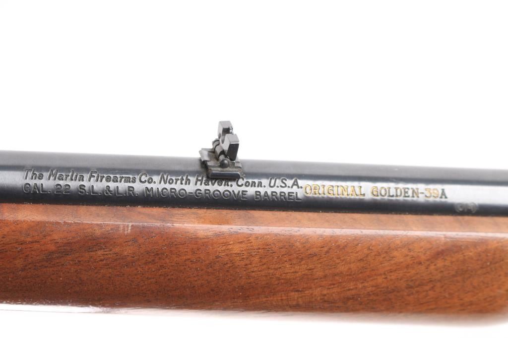 Lever action rimfire rifle manufactured circa 1985. Features blued finish, smooth walnut forend & curved grip shoulder stock, 24" round barrel, blade/white bead, hooded front and adjustable white diamond rear flip sight, factory plastic buttplate, grip cap with white spacers, steel forend cap. Large take-down screw on right side allows disassembly into two halves for storage or travel. Gold toned smooth trigger. Drilled/tapped for optics."Original Golden 39A" highlighted in gold on the left barrel, wear to some of the letters. Bore is excellent/bright. Retains 97% finish, someone has etched an SSN on the lower left receiver (Very Small) which is covered in black paint. Wood is excellent with few minor blemishes. Markings are crisp. Action is smooth.Condition is NRA Very Good+. Modern firearm.