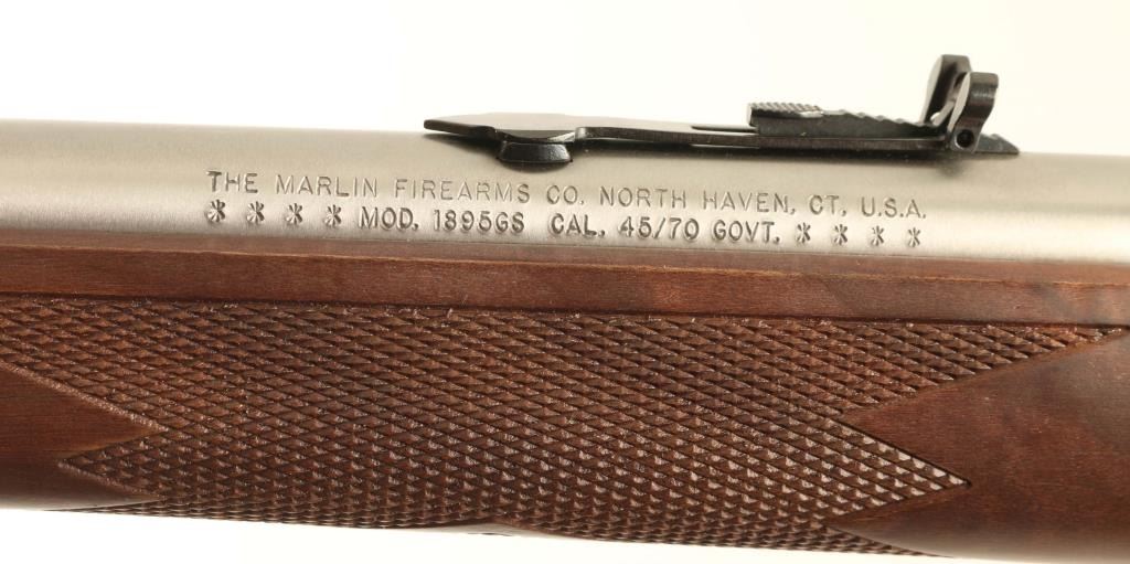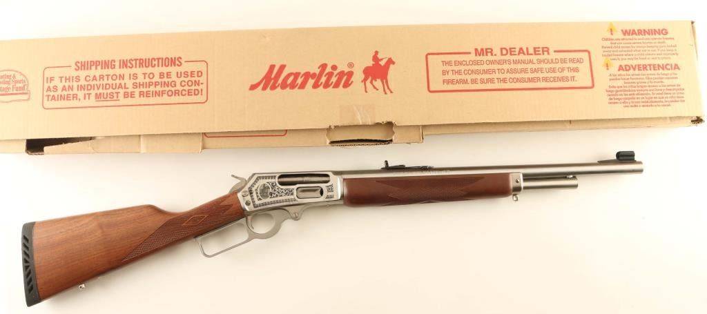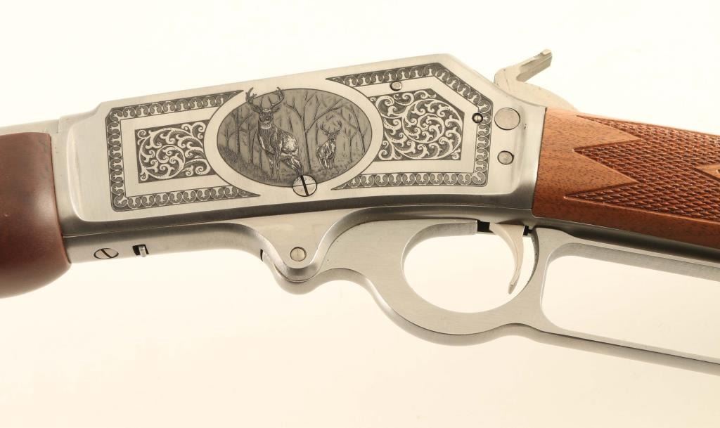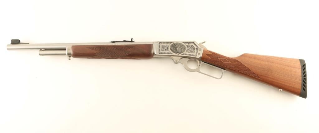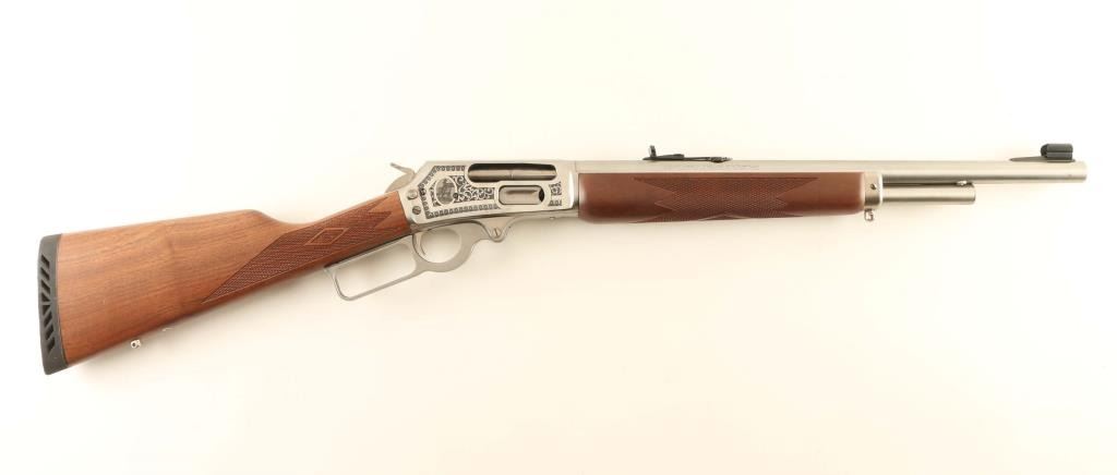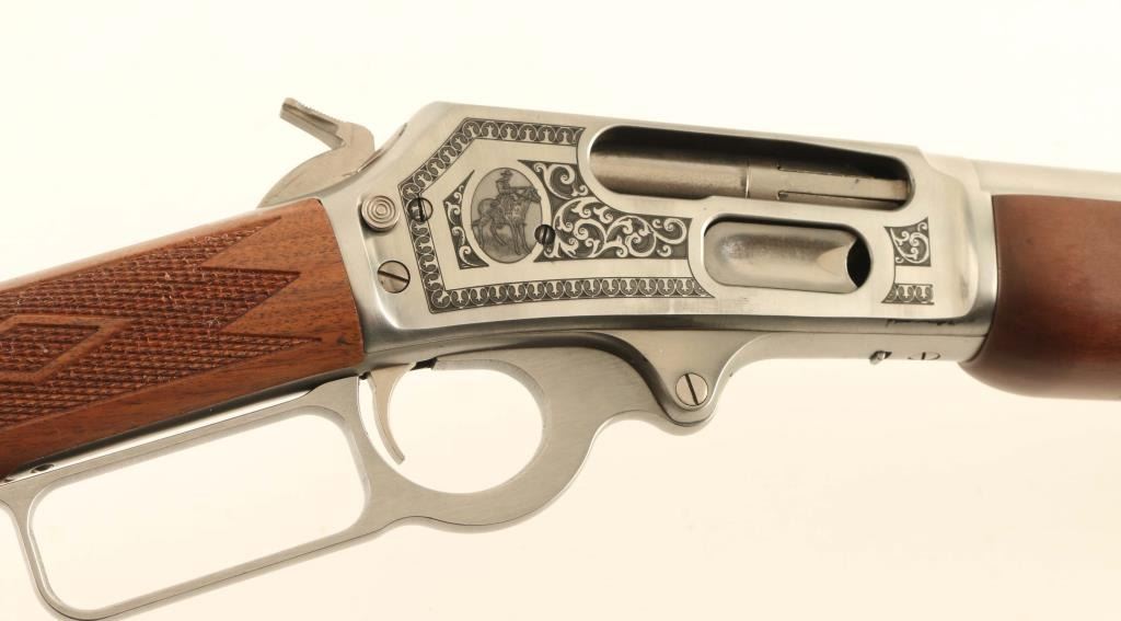 SN: 95GST074 Engraved stainless steel lever action repeating rifle chambered in .45-70 Government. This rifle is #74 of only 500 rifles produced for Talo in this special fashion. It features Ulrich inspired engraving with highly ornamental whitetail deer on the left side of the receiver and the Marin mounted cowboy logo on the right side, all of which is bordered by floral scroll. Configuration: Satin finish, 18.5" “JM” marked barrel, 4 round tube magazine, ramped & hooded blade front sight with brass bead, elevation adjustable semi-buckhorn rear sight, smooth trigger, serrated hammer spur, factory drilled & tapped receiver, cross-bolt safety, grip safety, installed swivel studs, point checkered walnut semi-beavertail forend with metal cap and straight grip shoulder stock with inlayed bullseye, factory recoil pad & 13 ¼” LOP. Includes the original factory cardboard box with literature, lock and hammer extension. Rifle exhibits only minor handling marks with no major wear observed. Action is smooth, the bore is pristine and the wood stocks are fine. Condition is NRA Excellent. ***Modern Firearm***