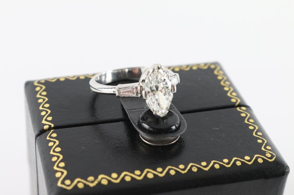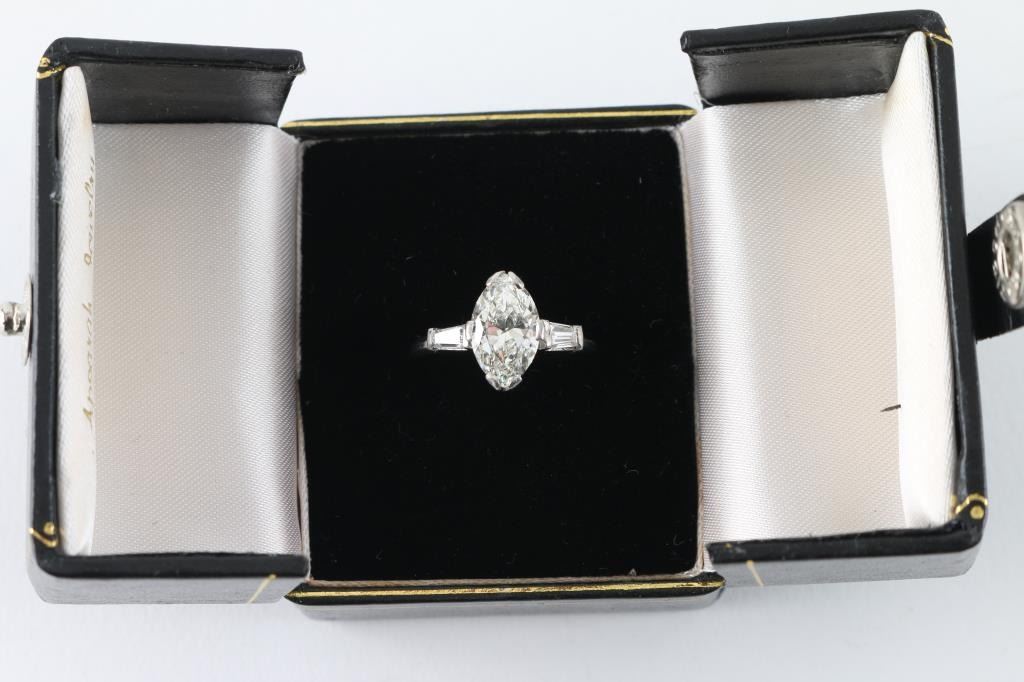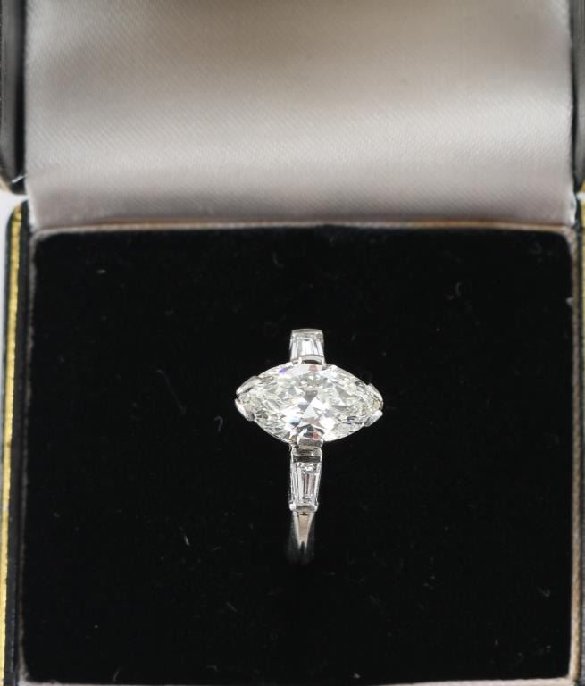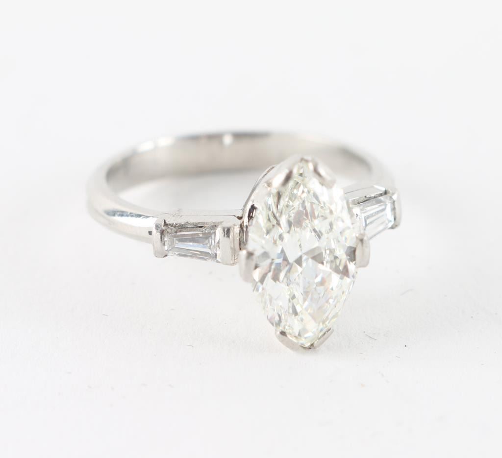 Approx 2.5CT, eye color, VS1 clarity, set in 14K white gold mount. With two accenting tapered baguettes, approx .15 each. ( .3 total) and older cut in nice marquis diamond, included is an examination report, by Jim Lamerson, estimated replacement value is $26,417
