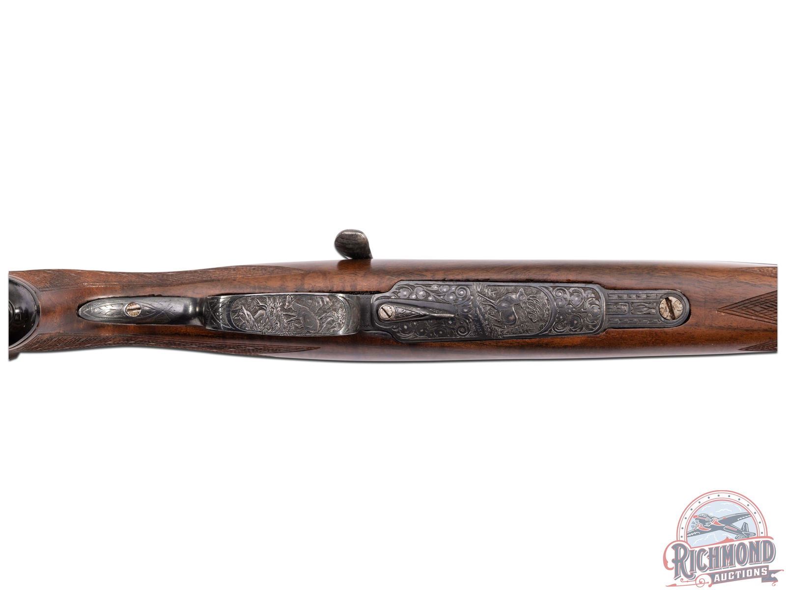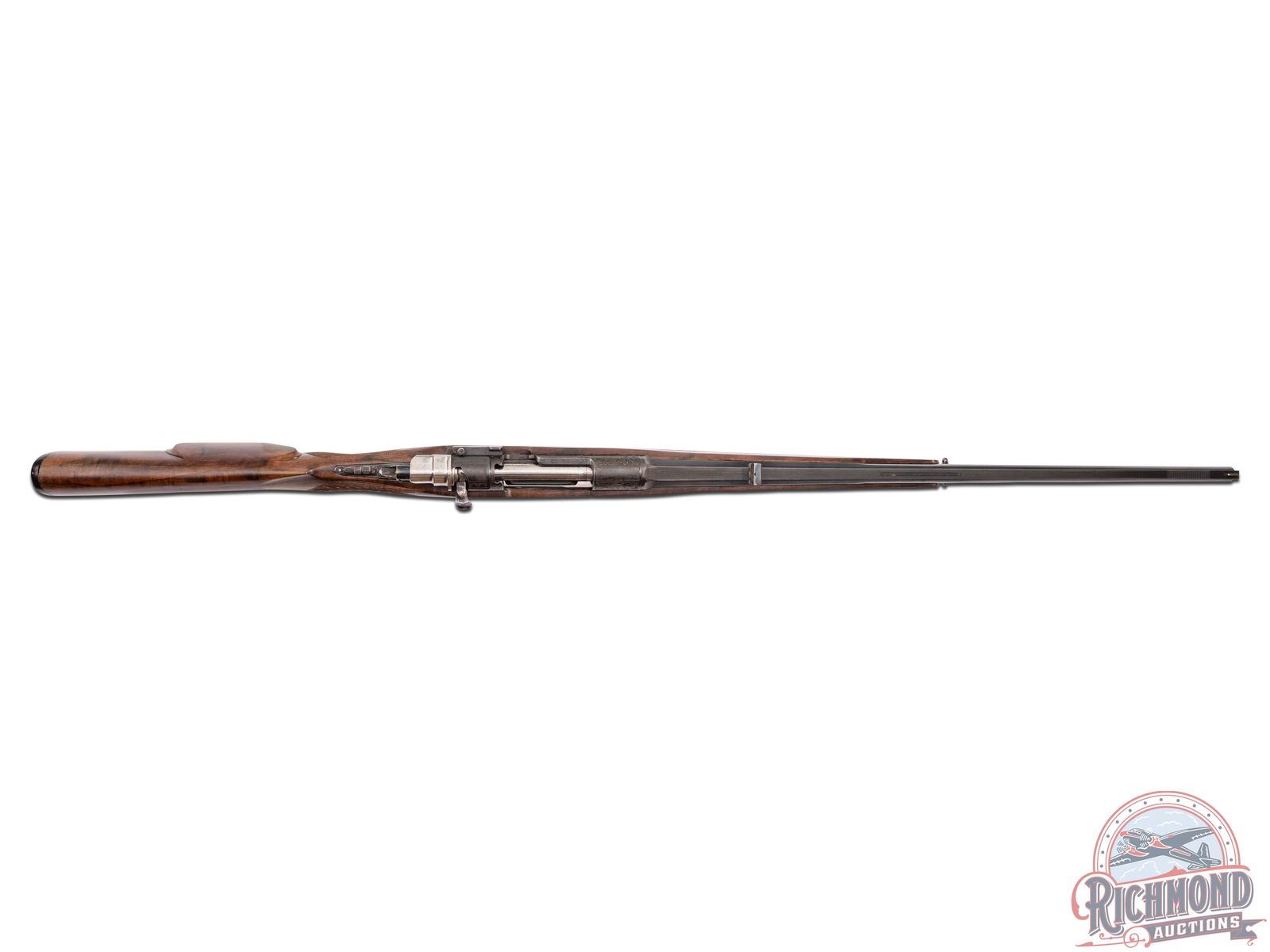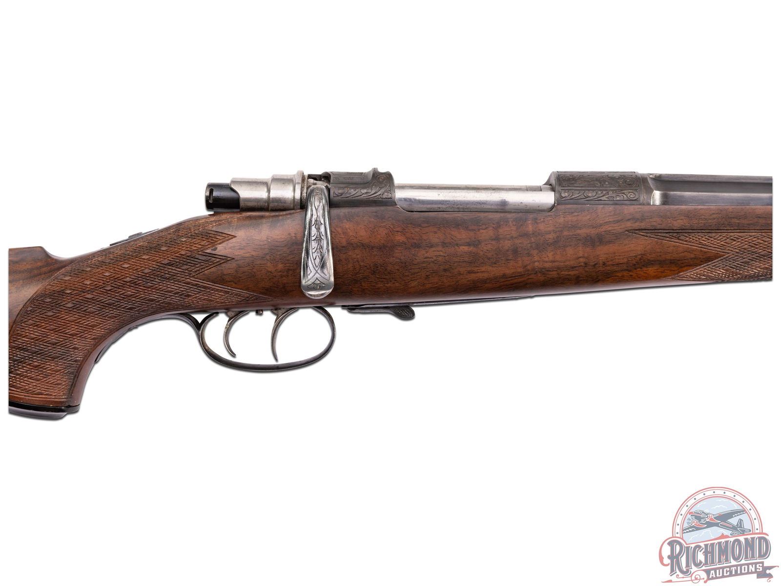 Built in Wien, Austria by Martin Kruschitz, in 1947. 24" blued octagon to round barrel with raised matted maker marked rib. Barrel has ramped front sight, notch rear sight and is dated "47" on bottom of barrel with Austrian proofs. The caliber is not marked but is 8m/m or some variation and should be chamber cast. Rifle has floral engraved 98 Mauser style action with spoon bolt, tang safety, double set triggers and game scene engraved floorplate and trigger guard. Walnut skip-line checkered pistol grip Schnabel forearm stock with Bakelite grip cap, right cheekpiece and hard rubber butt plate. J.T. Livengood Collection. S/N: 190.49. FFL STATUS: Curio & Relic.