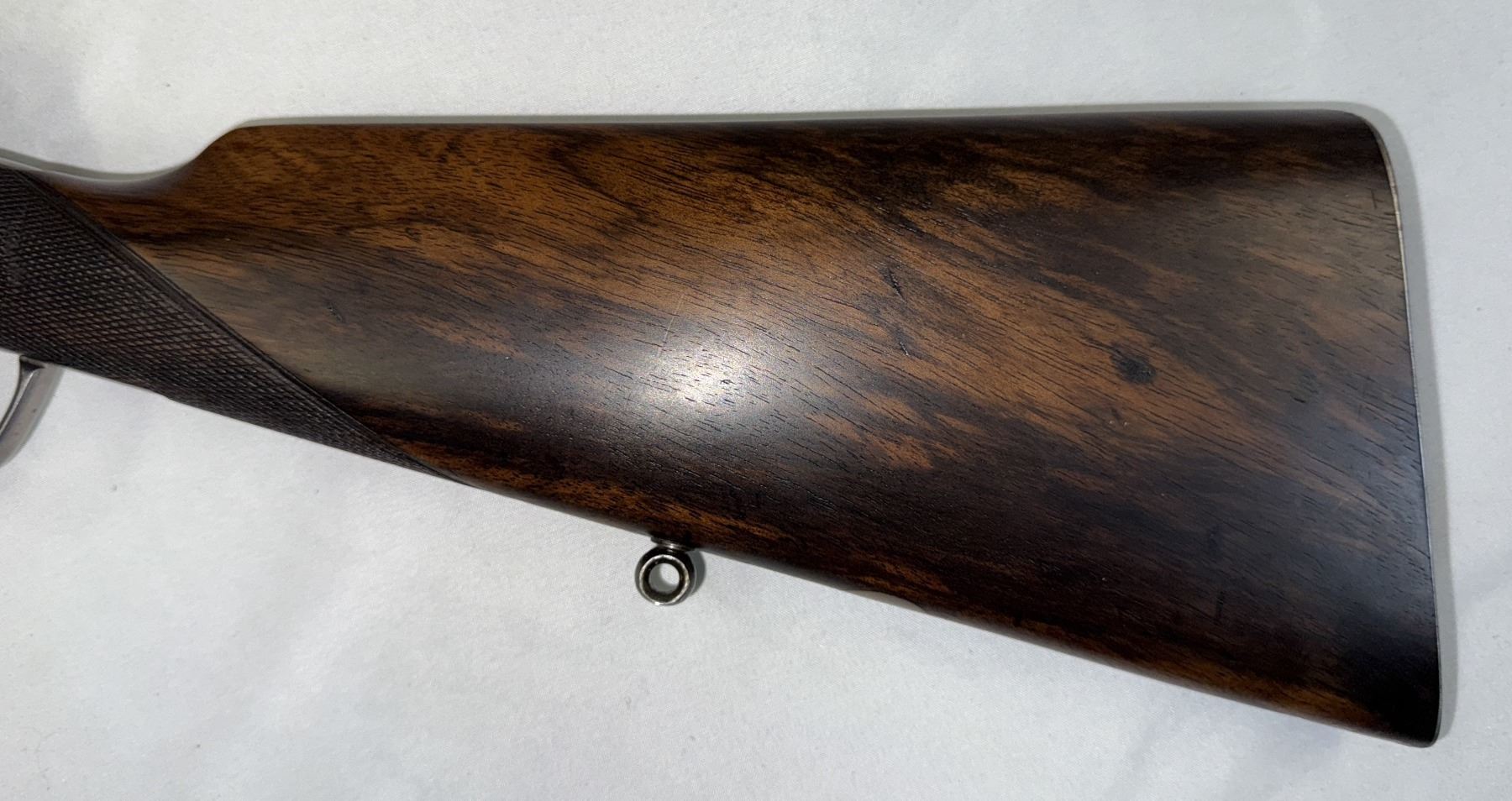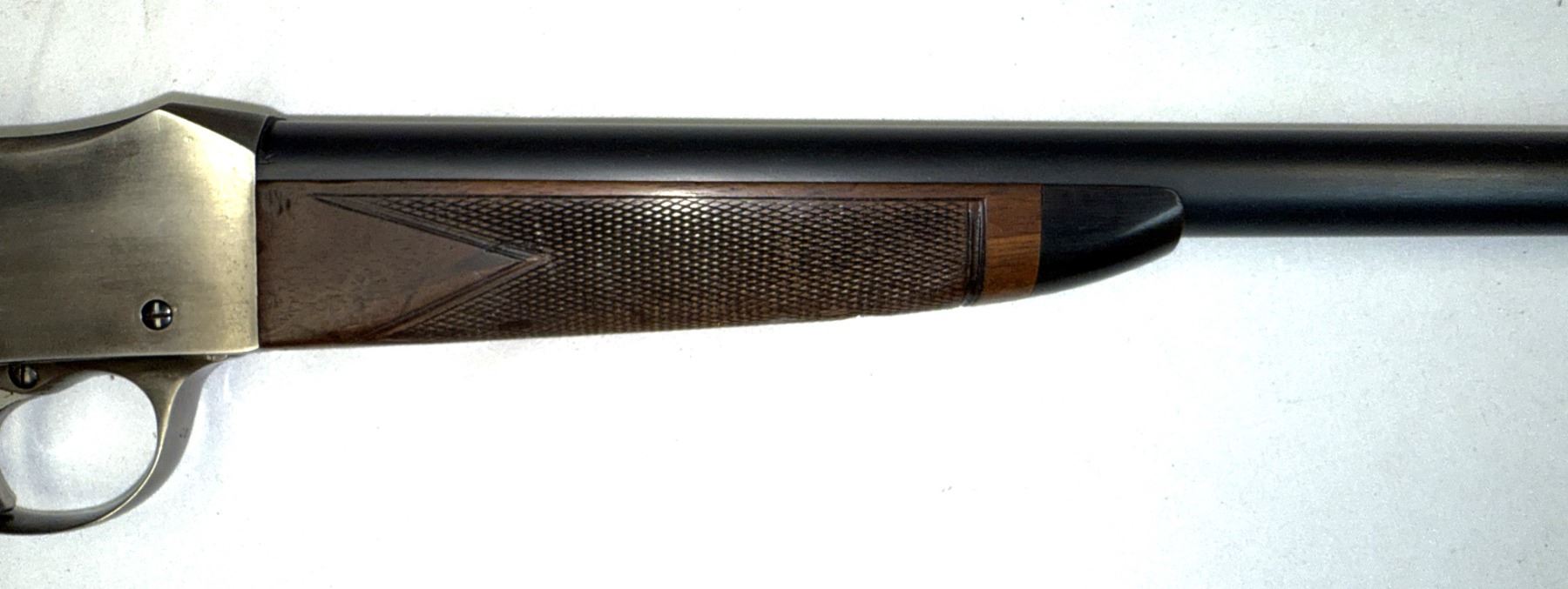 Its a 35 Cal (35-30) single shot 276 inch barrel set into fancy grain Wood.