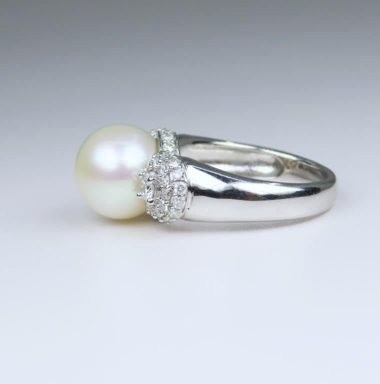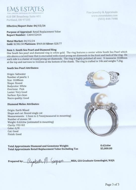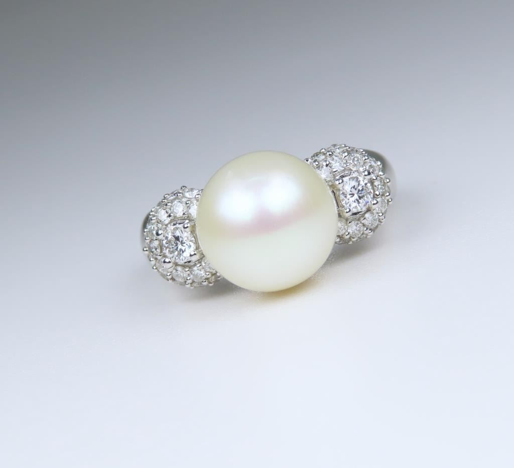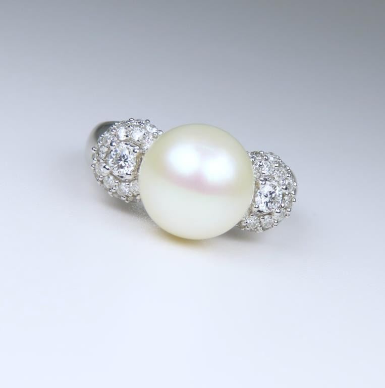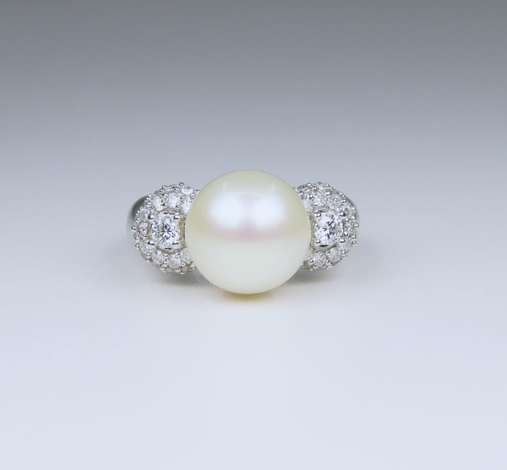 Ring featuring saltwater Ivory Pearl averaging 11.00 mm in diameter with Pink overtones and excellent luster accented by 50 round cut Diamonds weighing approx. 0.62 carats with G-H colors and VS/SI clarity set in a 14 karat white gold setting, Size 7. Full Retail Appraisal - $5,000.00