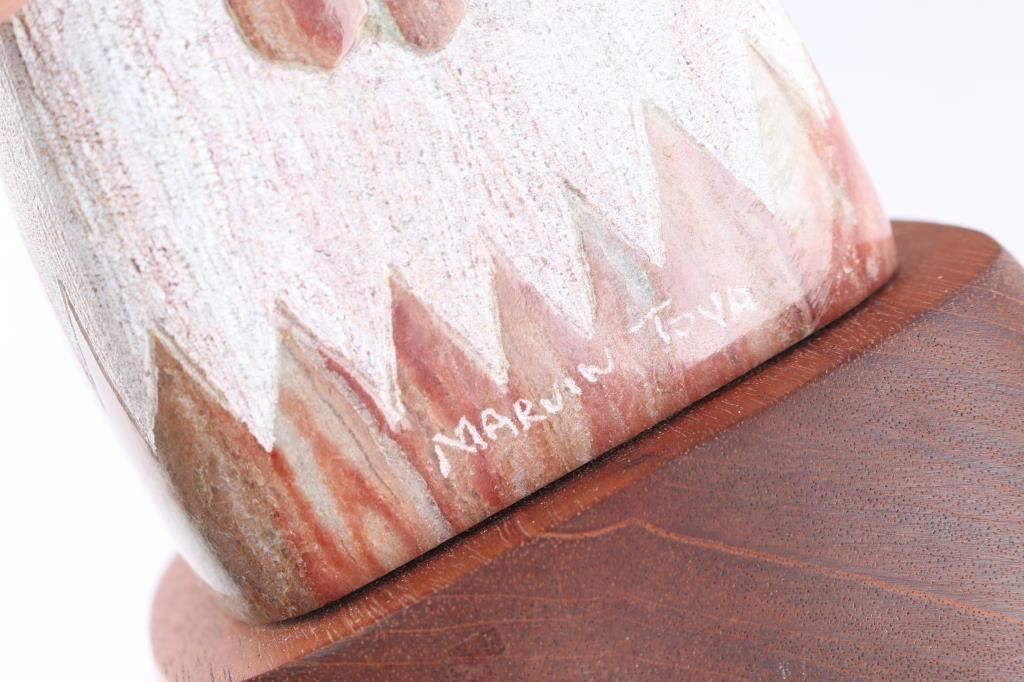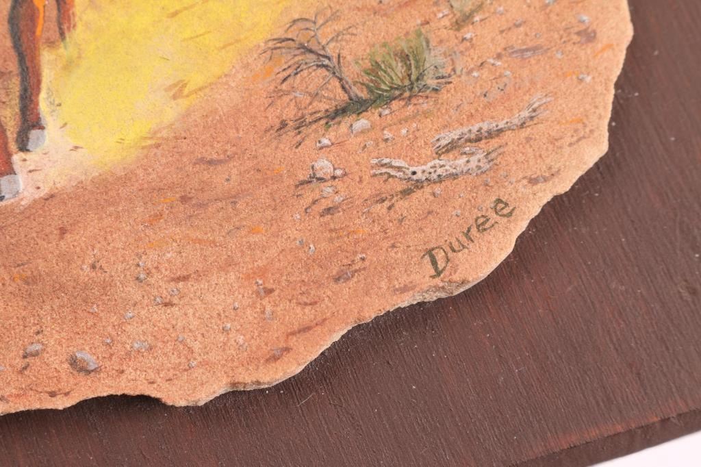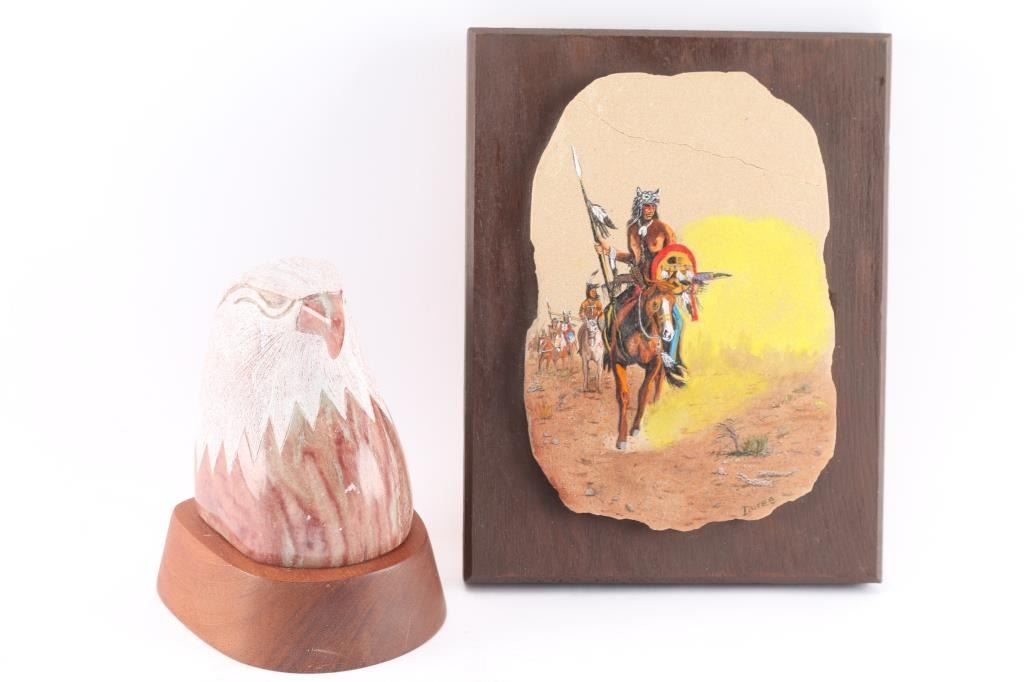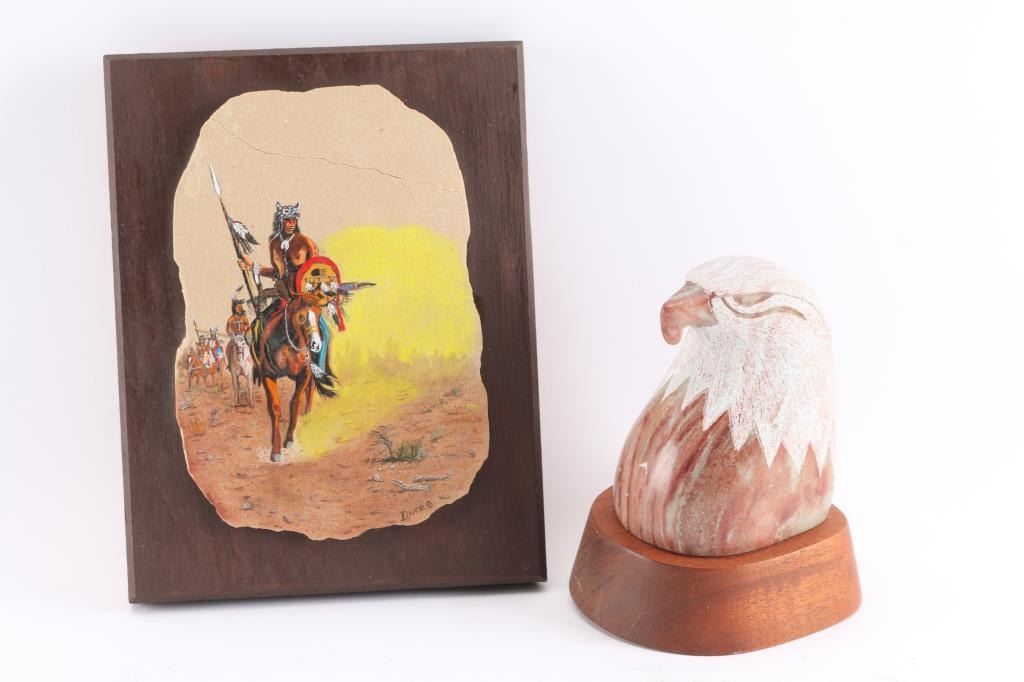 Painting is by Duree, mounted on wood for hanging on wall. Measures 8 1/2" by 6 1/2", has crack along top of stone. Carving by Marvin Toya is of an eagle head, done in alabaster, mounted on wood. Measures 6" by 3 1/2".