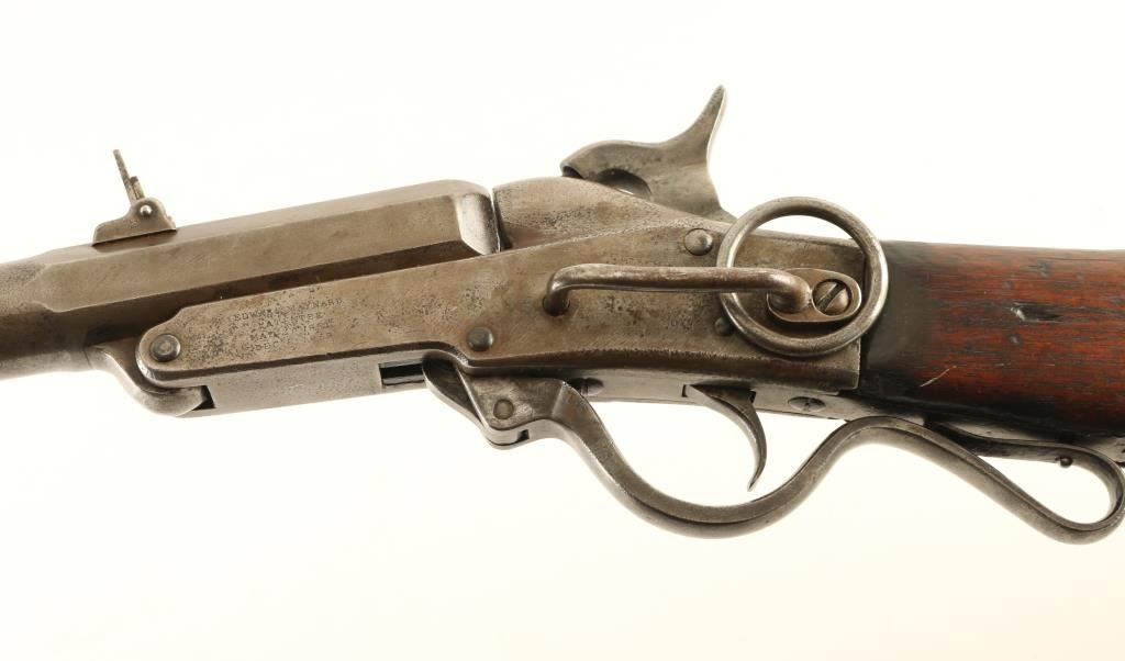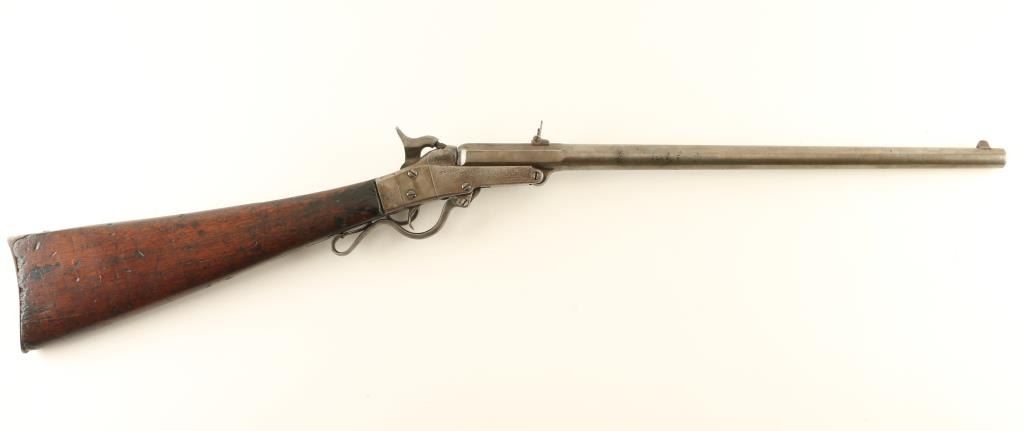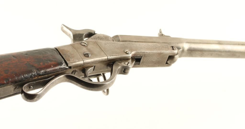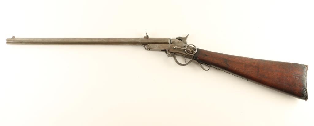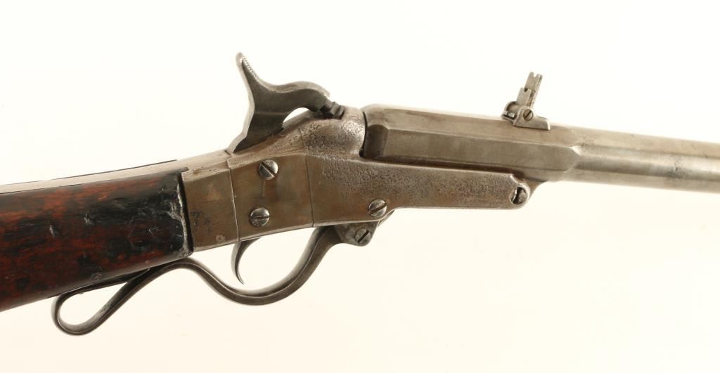 Civil War carbine used by US Cavalry, manufactured circa 1863 to 1865. Approx 20,000 of the "second model" were made. Features 20" barrel with octagonal breech section, no forend, blade front sight, folding leaf rear sight with 3 elevation settings, finger lever opening, external hammer, percussion ignition with cap nipple (no tape primer in the second model), wood butt with steel buttplate, saddle ring. Bore is good condition, bright with light pitting throughout, visible rifling. Metal surfaces are a light brownish gray color, fairly uniform with some variation in color and some darker areas, many areas of light pinprick pitting around breech. Most screw heads have marred slots. Wood is fair condition, dark spots throughout, erosion and loss of wood at receiver and buttplate (especially at toe). Markings are thin, often obscured by pitting. Condition is NRA Good *** Antique Firearm ***