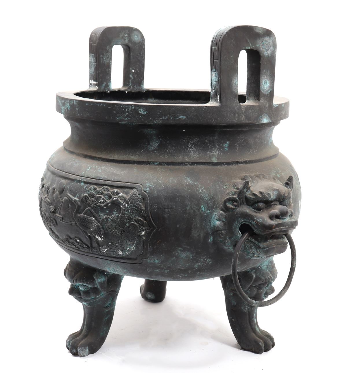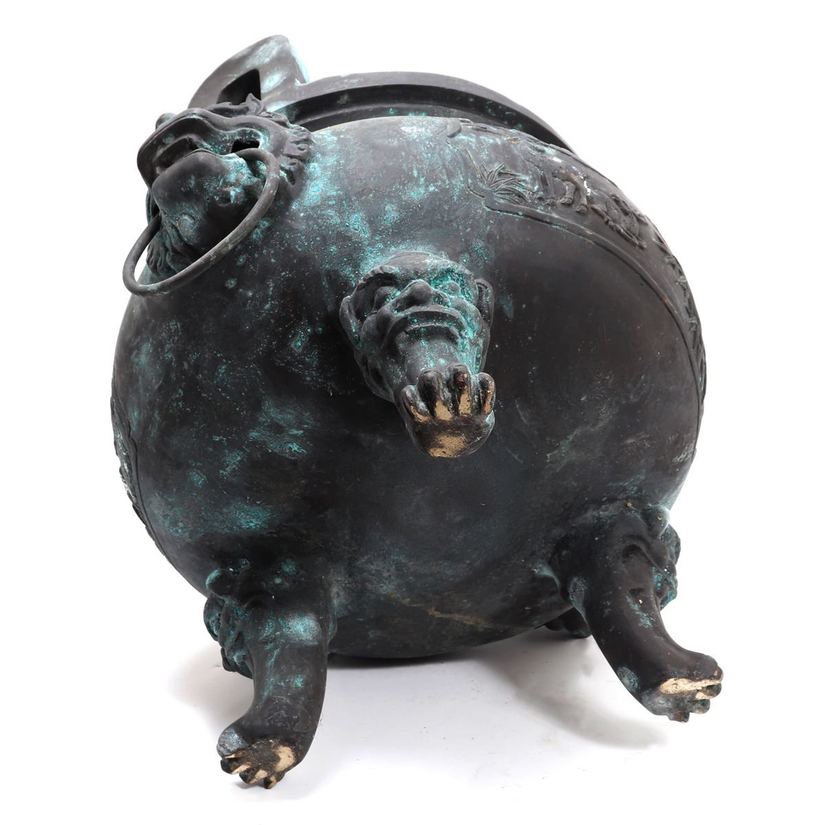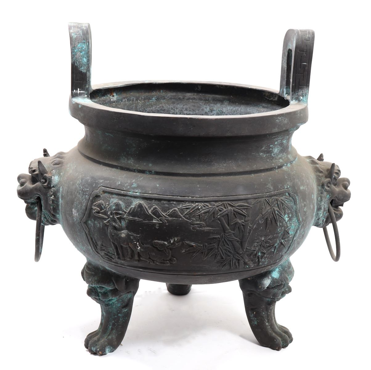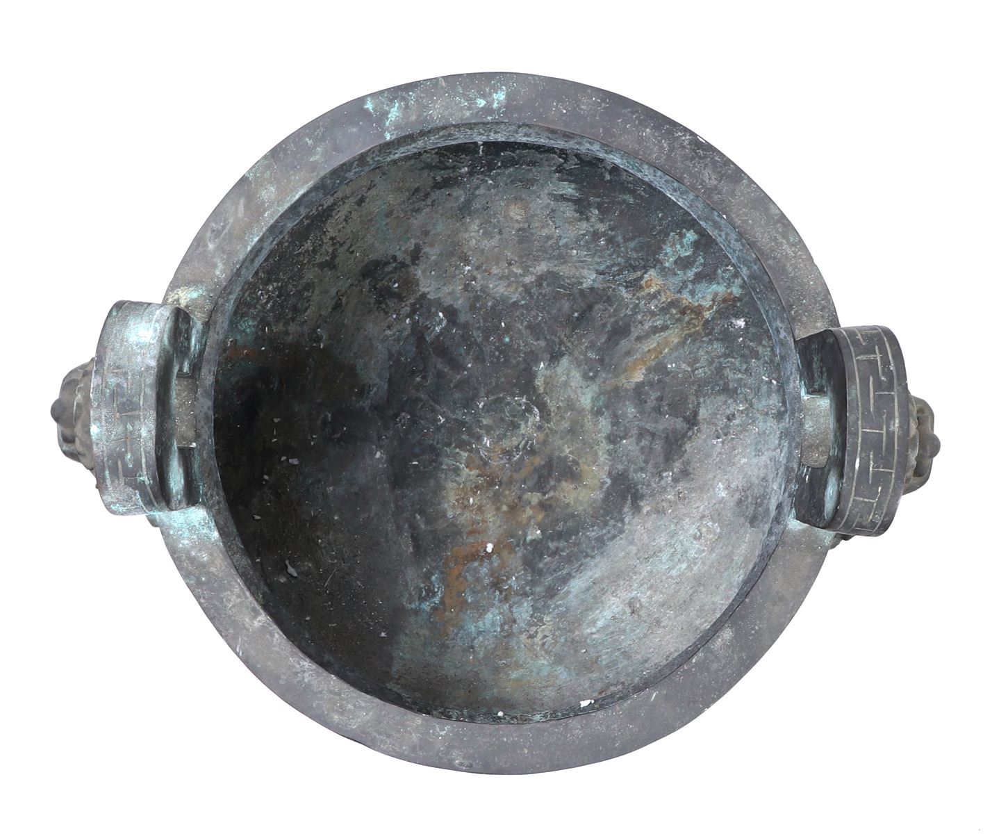 Fine massive Chinese bronze vessel with zoomorphic beast faces to each side, arched incised and detailed handles, zoomorphic beast feast with a lively scene throughout the exterior. Size 26 1/2" W x 25 1/4" H, weight 66.5 lb.. Condition: Patina throughout as shown.