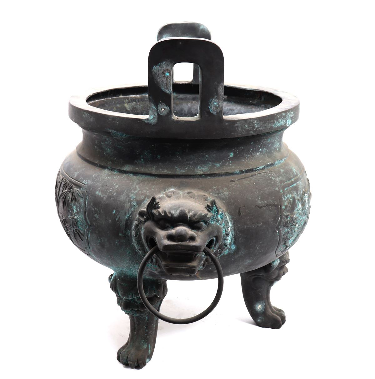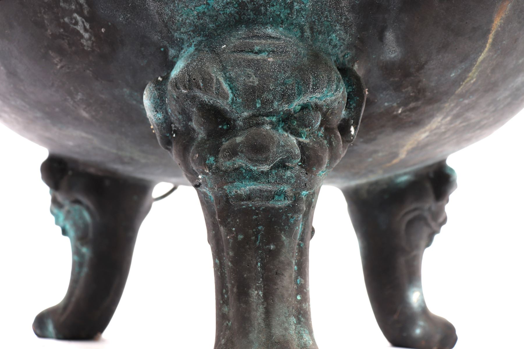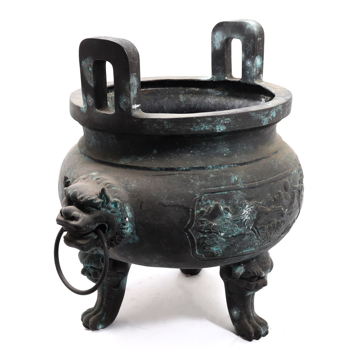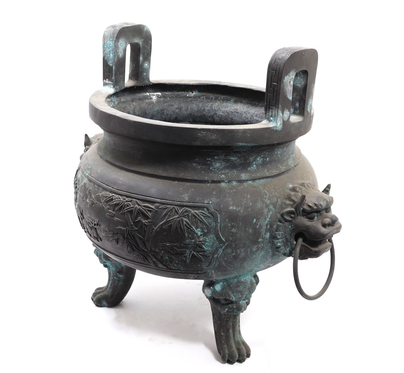 Fine massive Chinese bronze vessel with zoomorphic beast faces to each side, arched incised and detailed handles, zoomorphic beast feast with a lively scene throughout the exterior. Size 26 1/2" W x 25 1/4" H, weight 66.5 lb.. Condition: Patina throughout as shown.