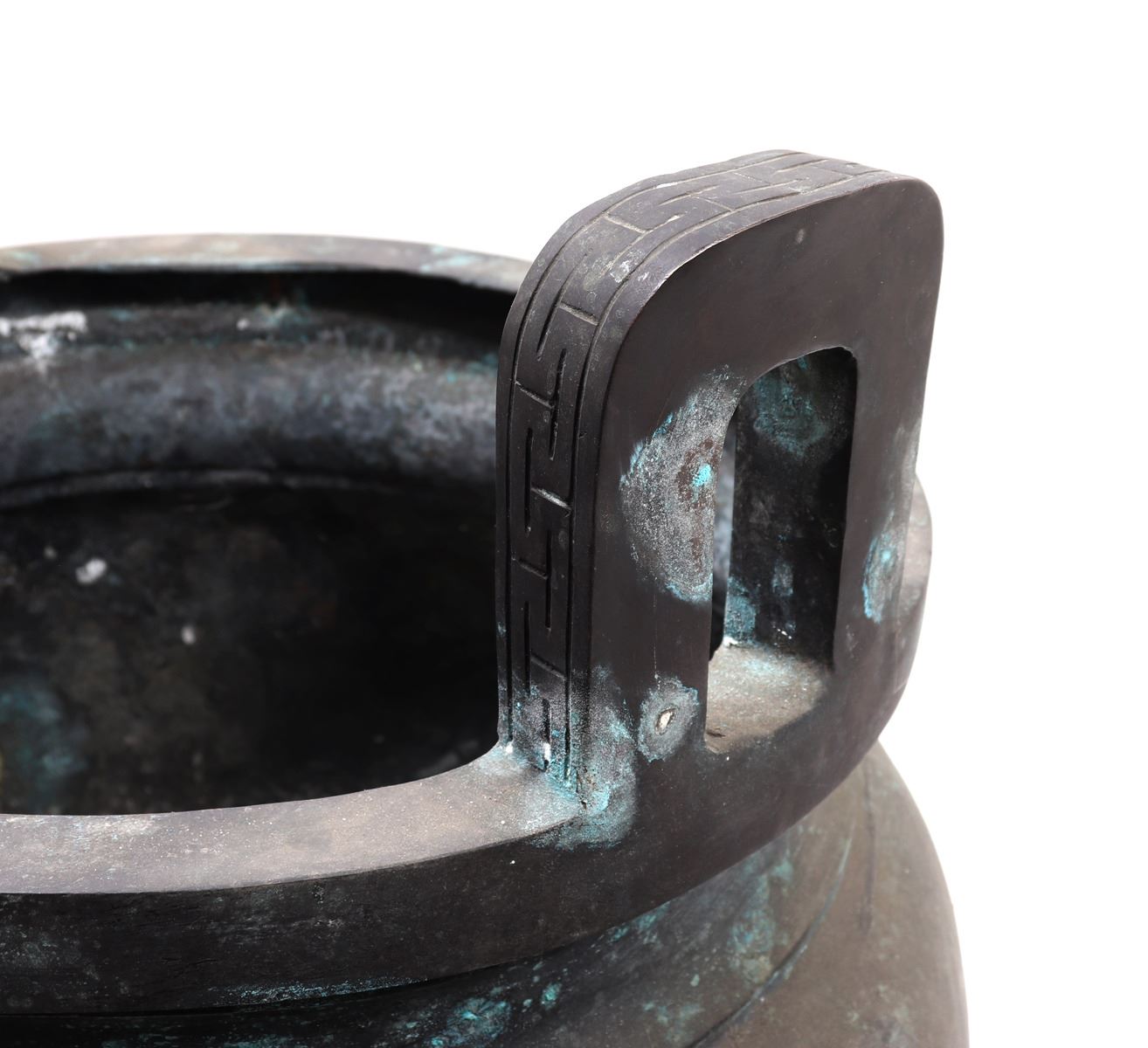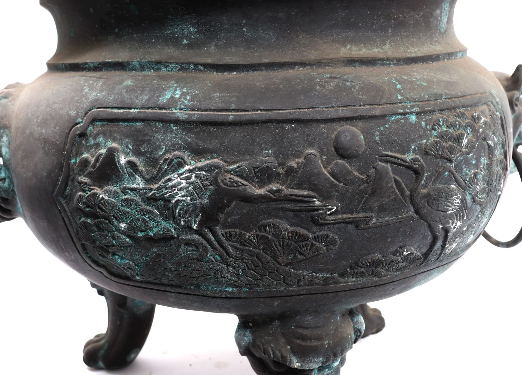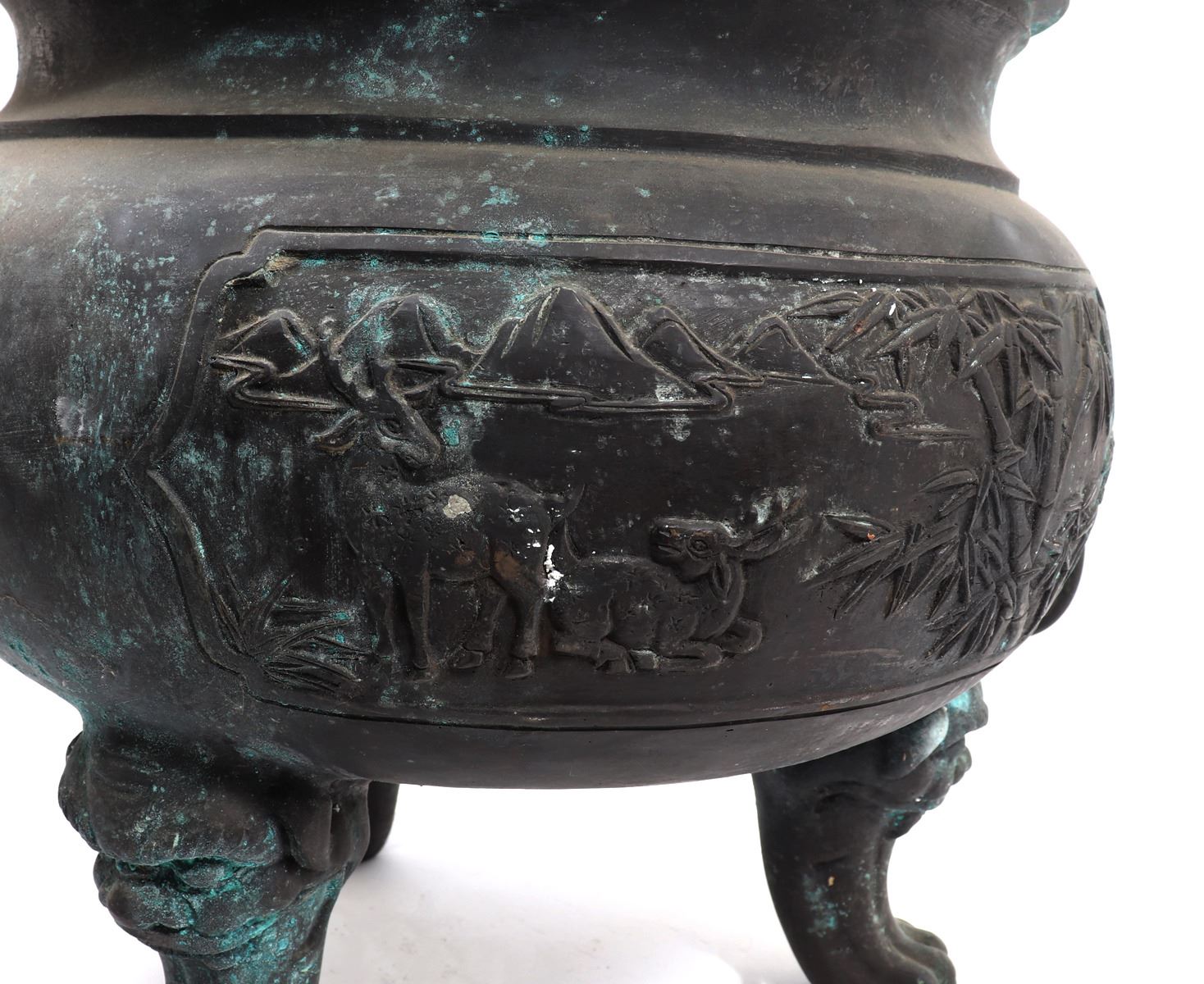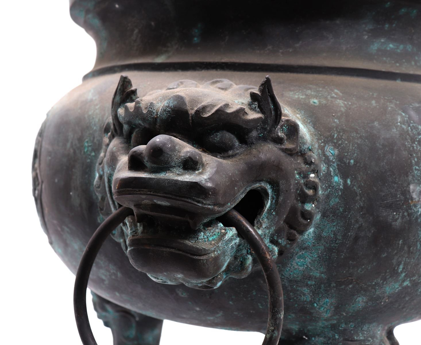 Fine massive Chinese bronze vessel with zoomorphic beast faces to each side, arched incised and detailed handles, zoomorphic beast feast with a lively scene throughout the exterior. Size 26 1/2" W x 25 1/4" H, weight 66.5 lb.. Condition: Patina throughout as shown.