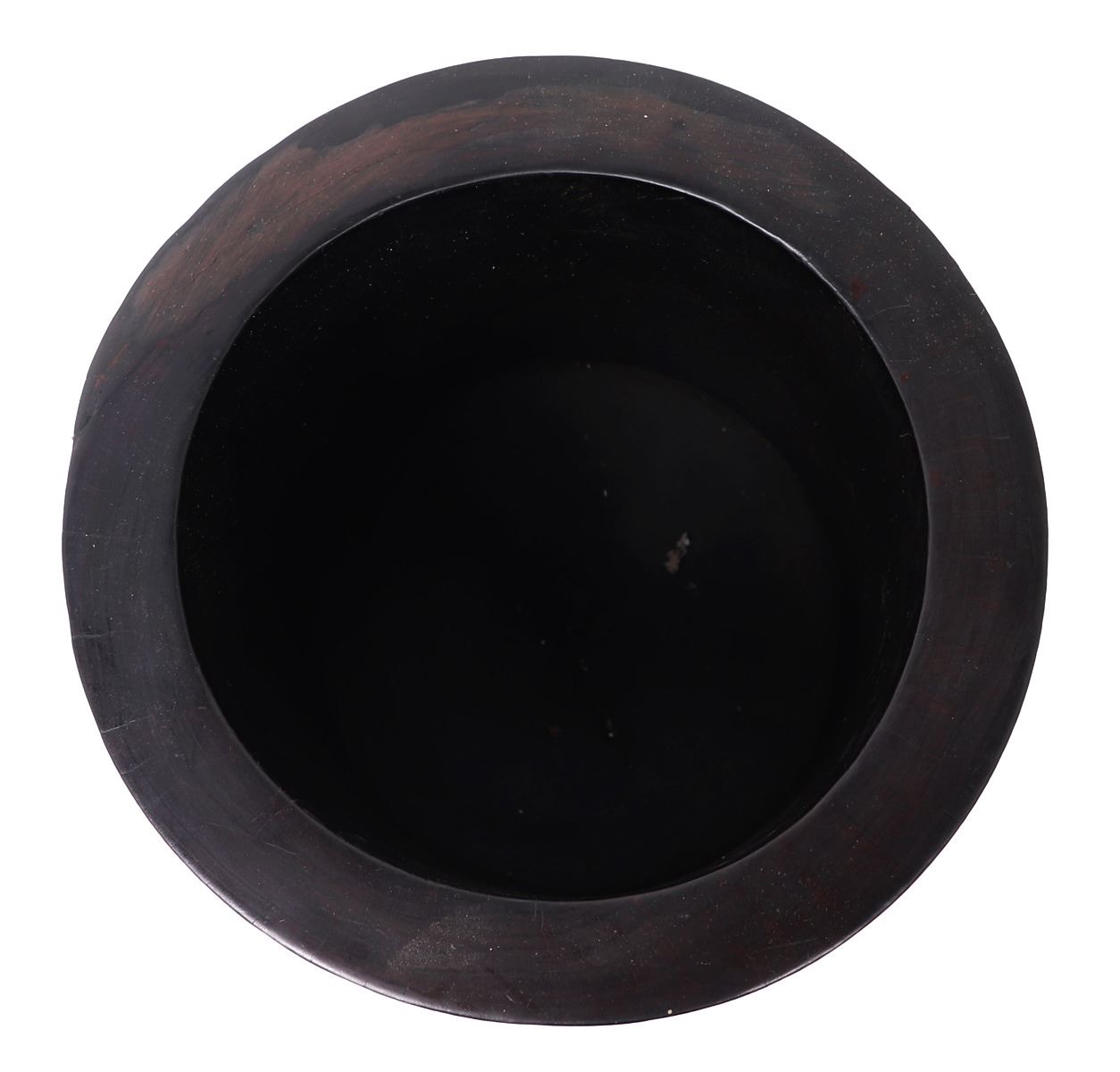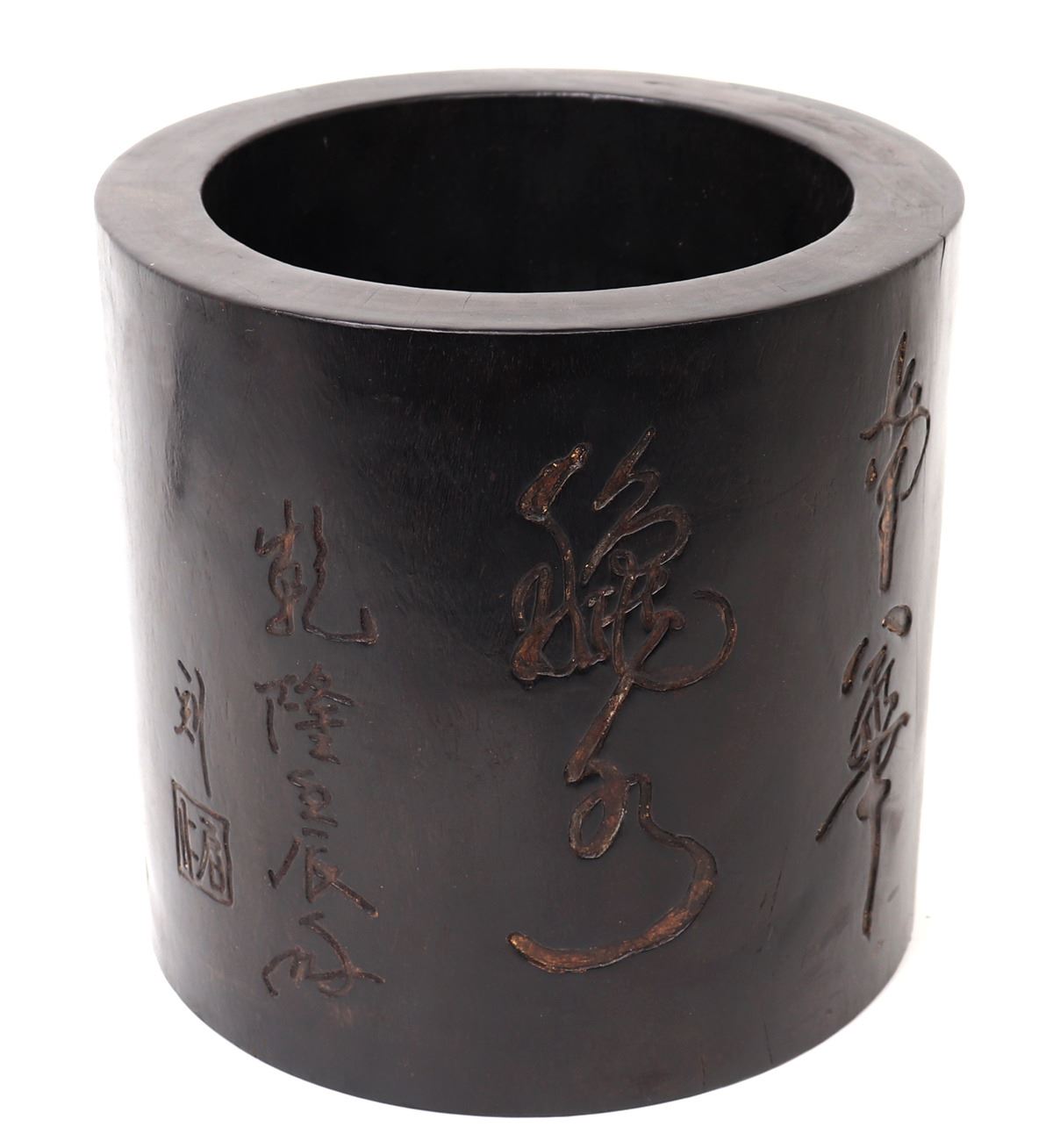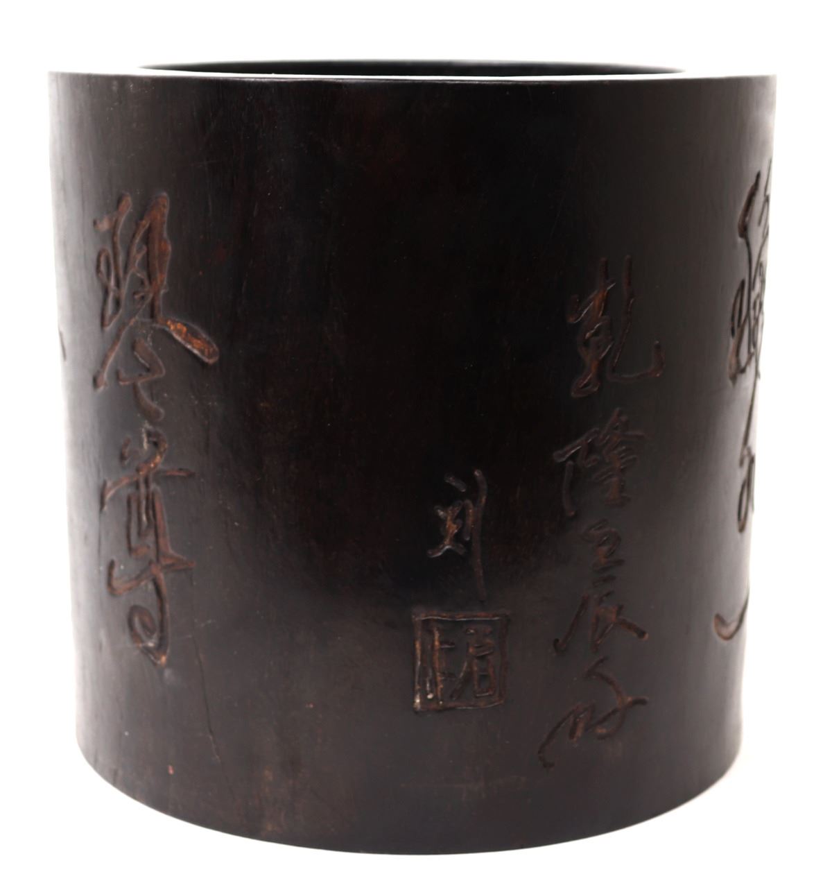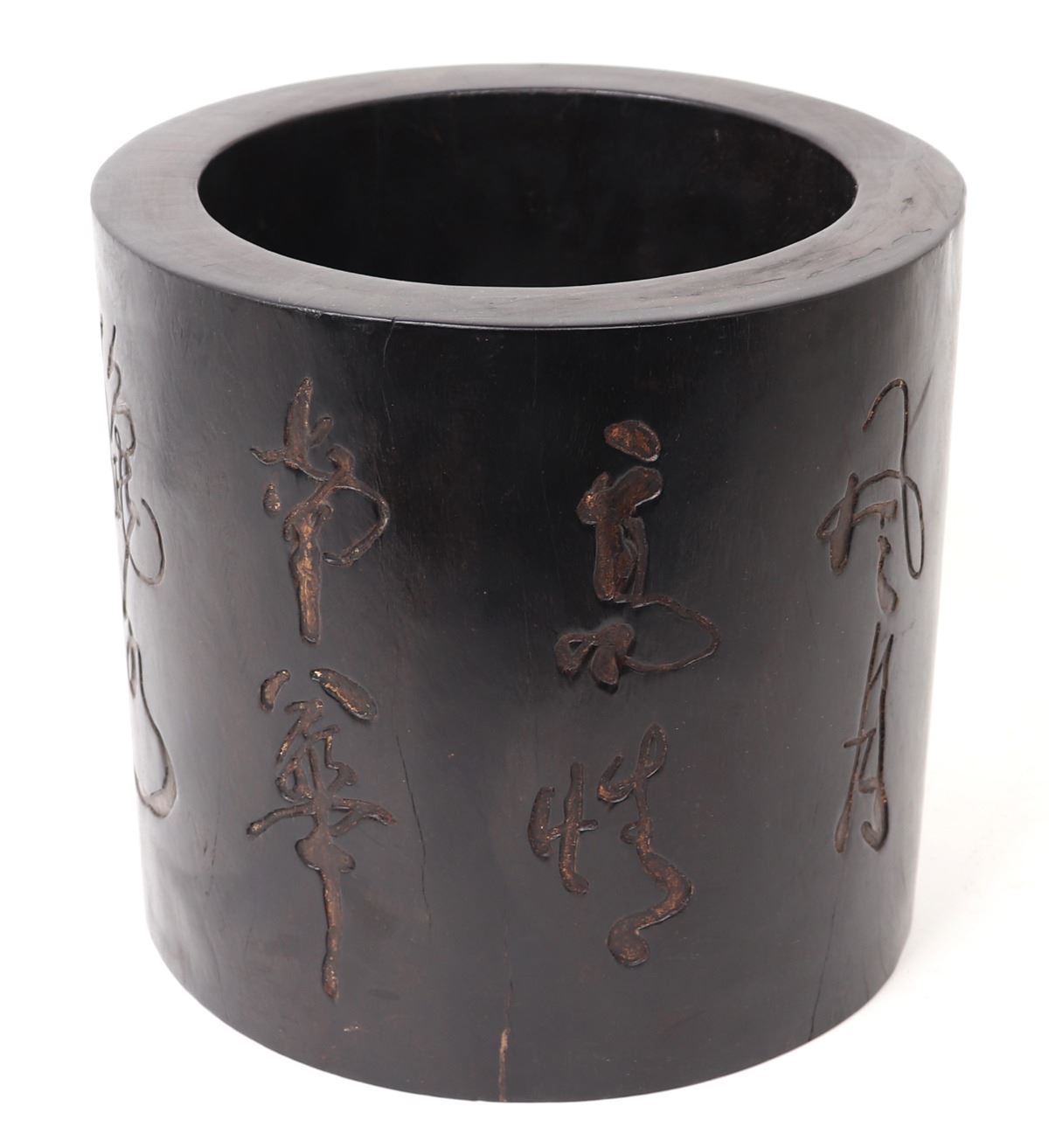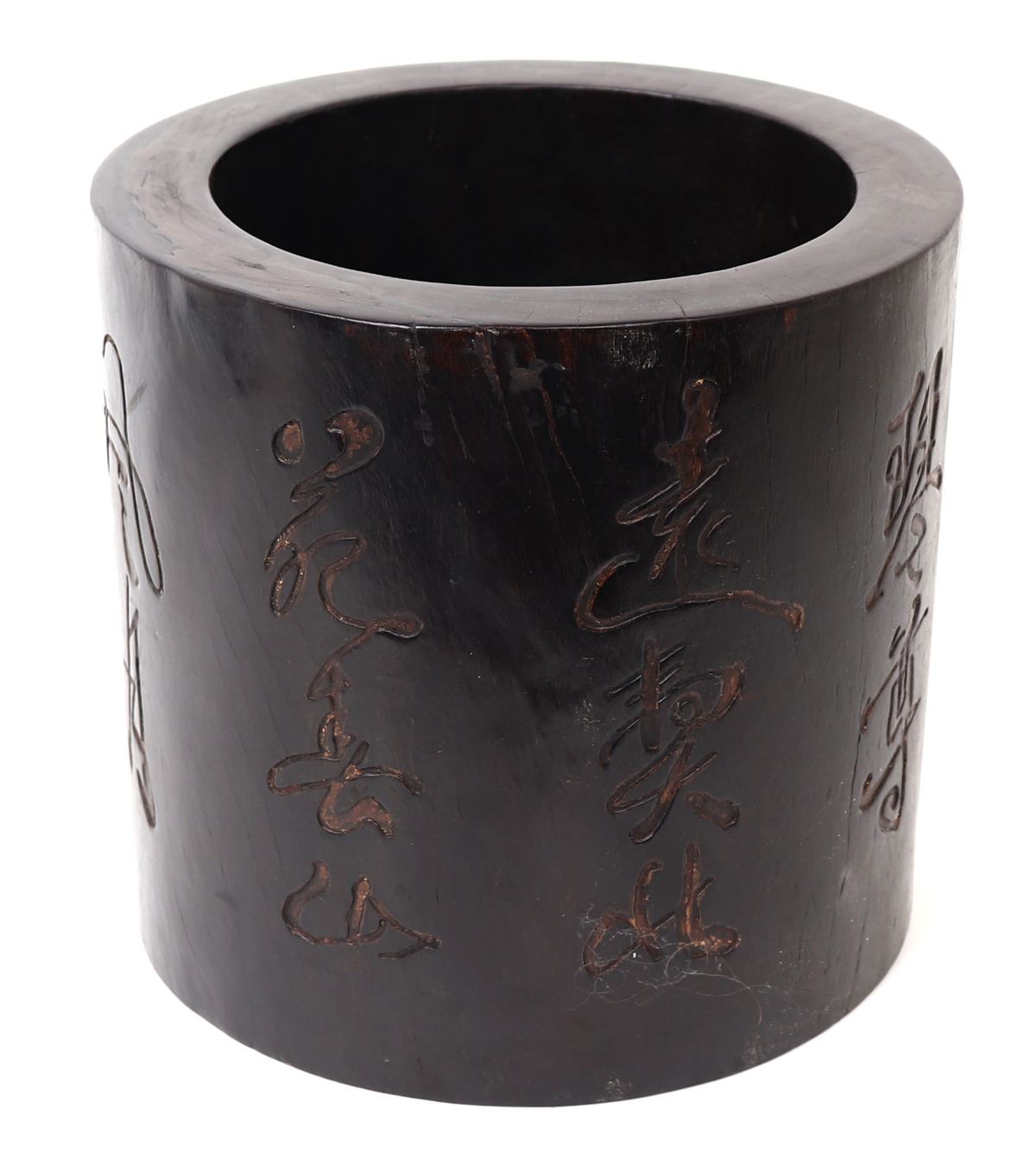 Massive Chinese rosewood brush pot with engraved inscriptions highlighted in gilt decoration. Very heavy and thick carved. Size 10 5/8" H x 11" W. Provenance: Ex-Pasadena, California Collection
