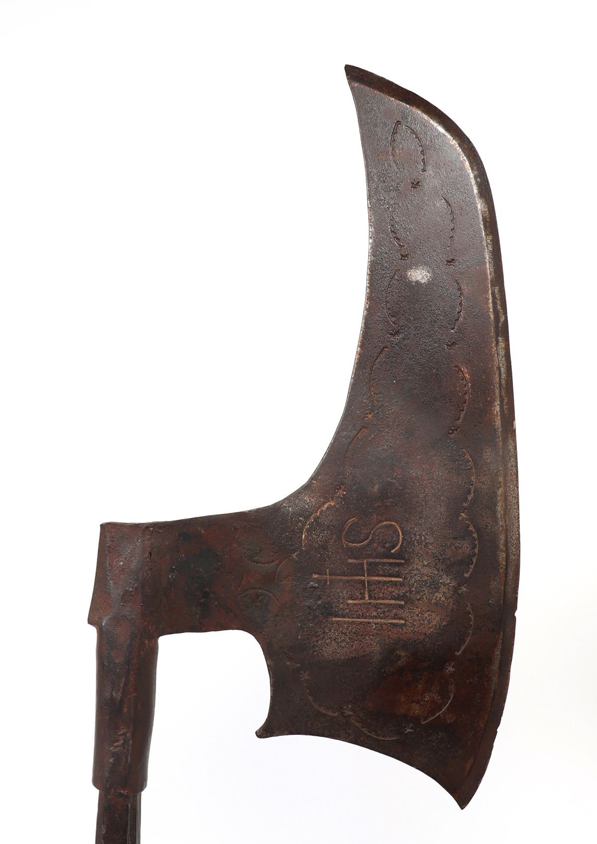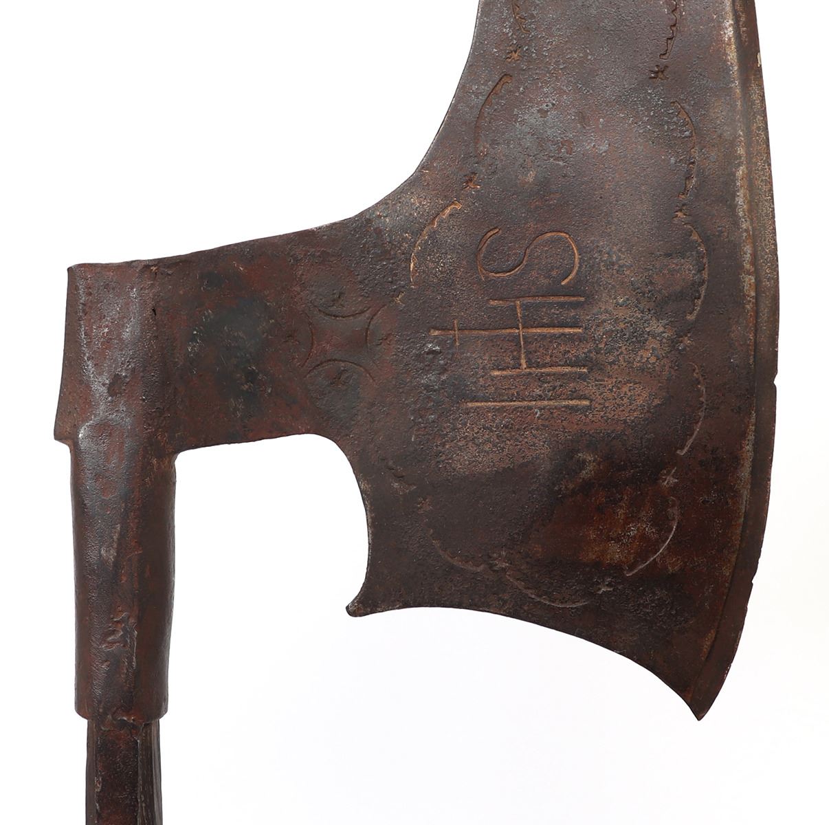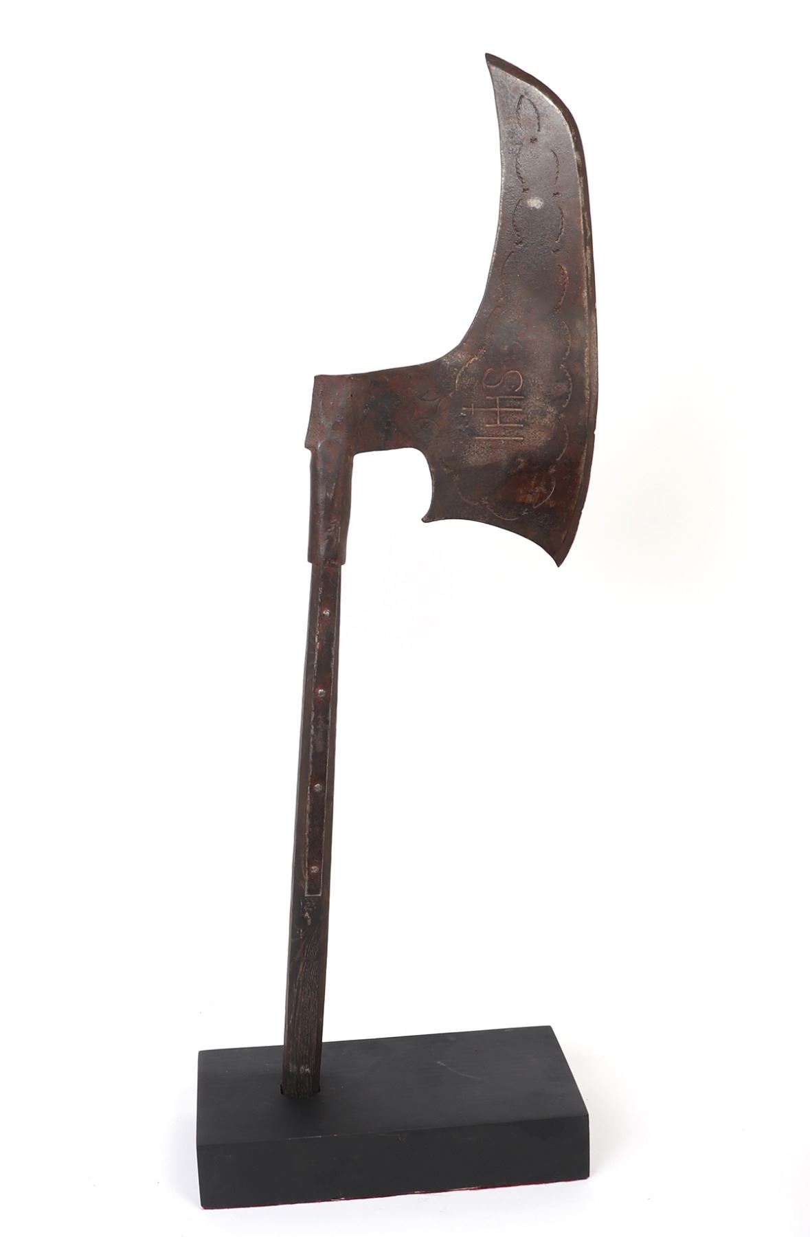 Massive mounted Bardiche axe engraved "IHS" to the blade with some linear decoration around the edges. The bardiche was favored by infantry troops, particularly in Eastern Europe, and the surrounding regions, during the late medieval and early Renaissance periods. It was especially popular among the infantry of the Polish-Lithuanian Commonwealth and the Russian armies. Size 39 1/4" H on included stand, 17 3/4" H blade