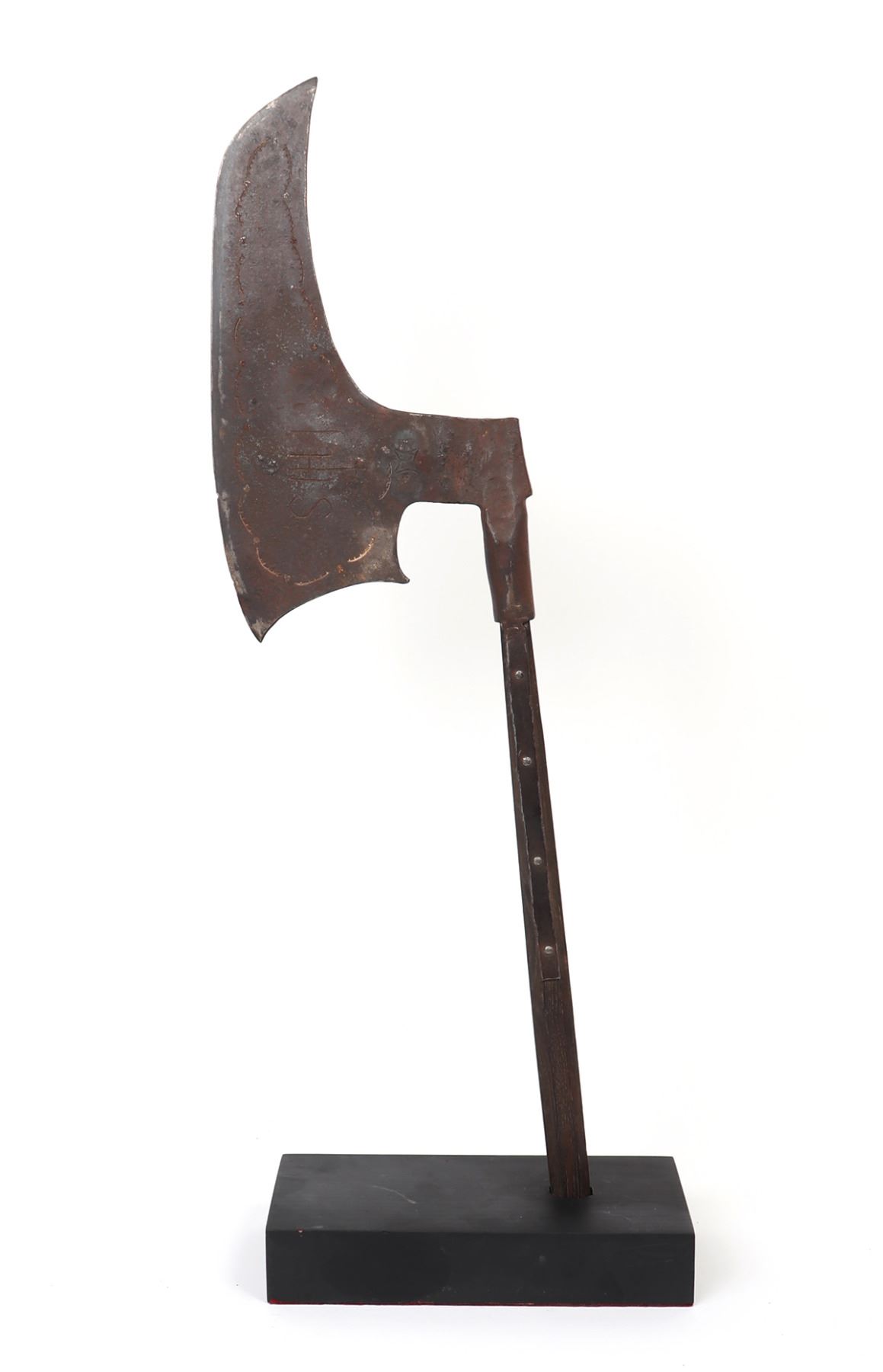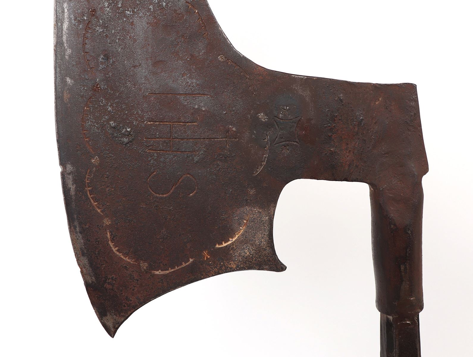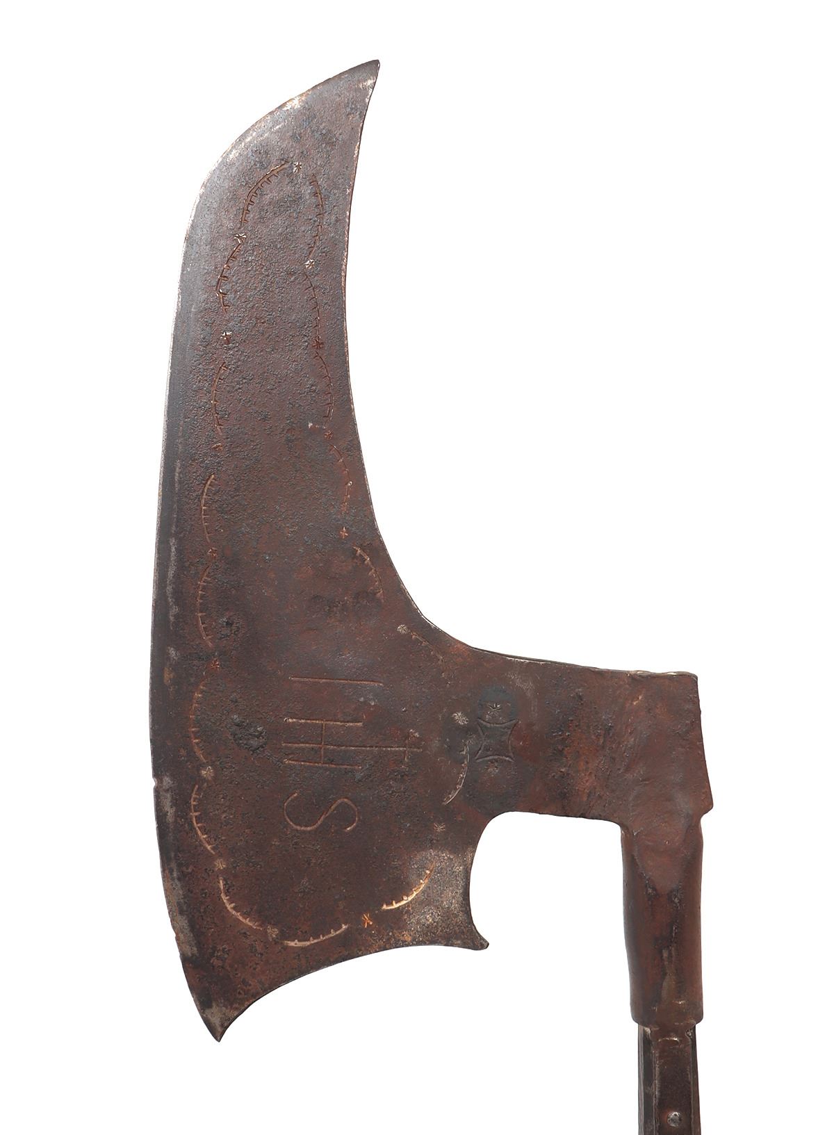 Massive mounted Bardiche axe engraved "IHS" to the blade with some linear decoration around the edges. The bardiche was favored by infantry troops, particularly in Eastern Europe, and the surrounding regions, during the late medieval and early Renaissance periods. It was especially popular among the infantry of the Polish-Lithuanian Commonwealth and the Russian armies. Size 39 1/4" H on included stand, 17 3/4" H blade