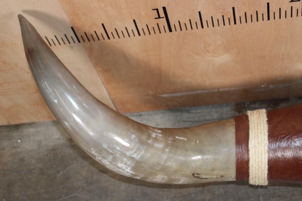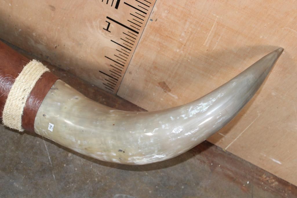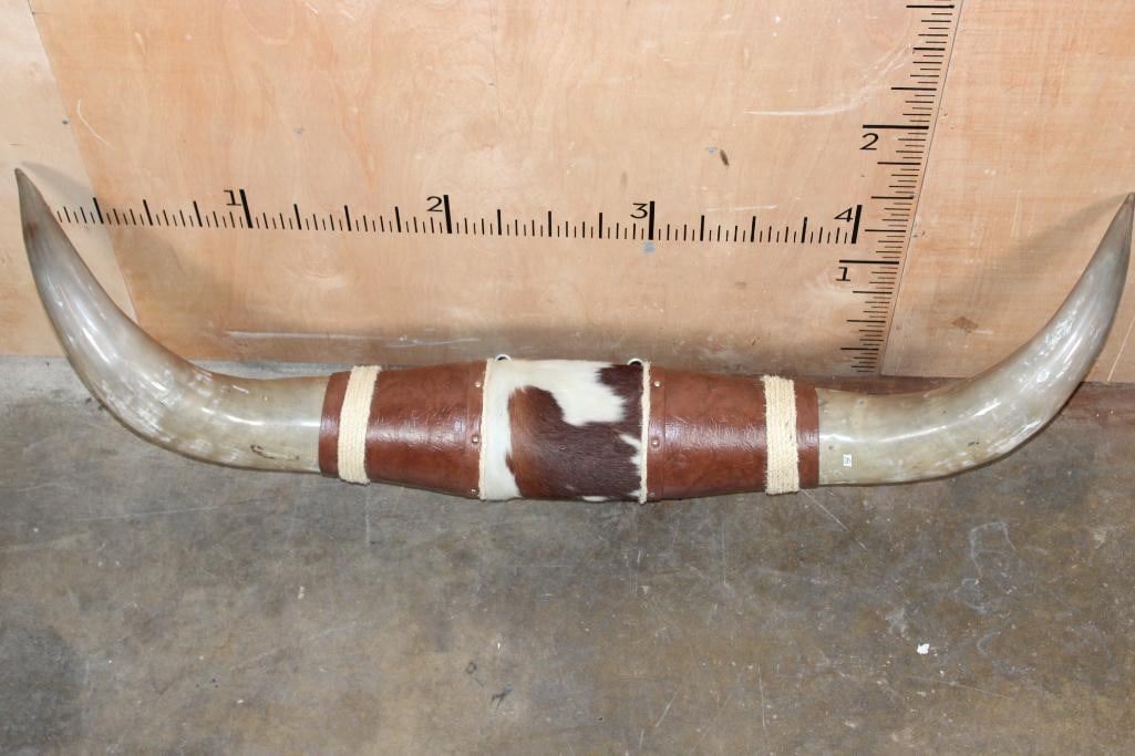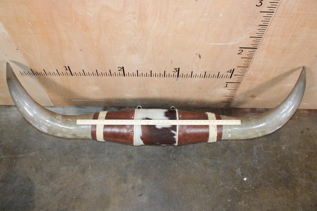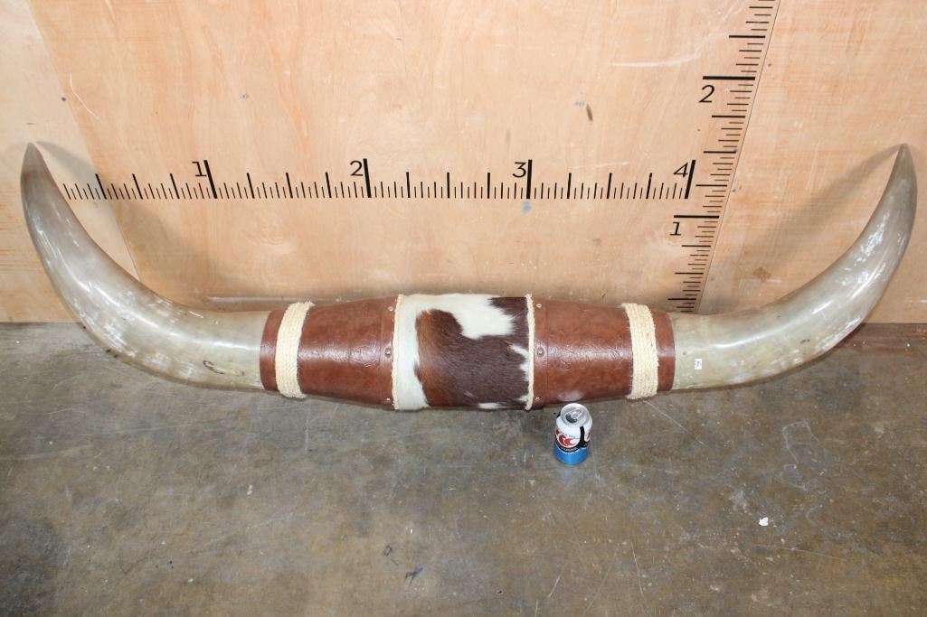 Massive Mounted WATUSI LONGHORN Cross Horns. They are wrapped with Brown and White Cowhide and Tooled Leather. They measure 64" from Tip to Tip and 19" around each Horn Base. DECORATIVE TAXIDERMY
