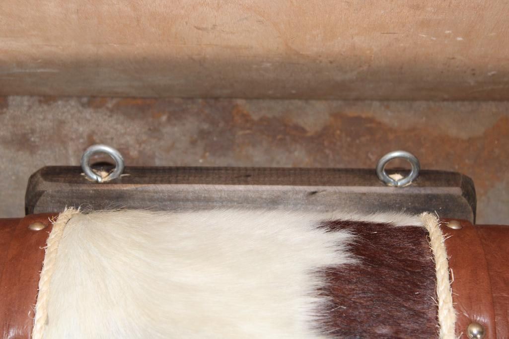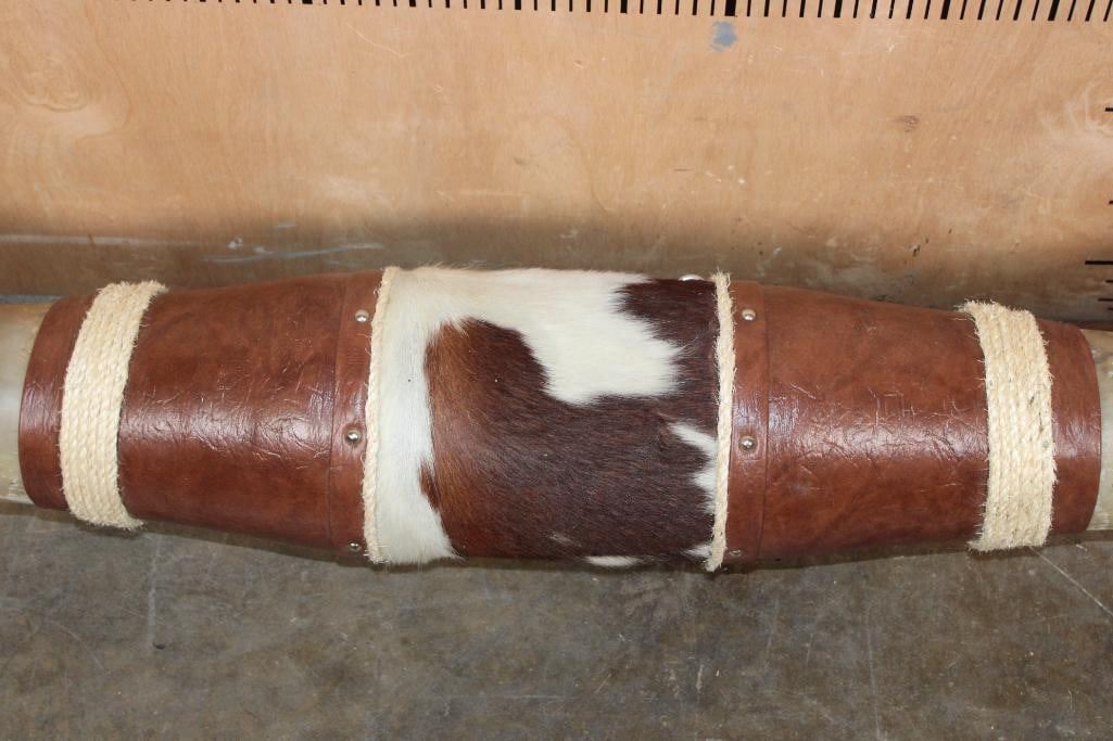 Massive Mounted WATUSI LONGHORN Cross Horns wrapped with Brown and White Cowhide and Tooled Leather